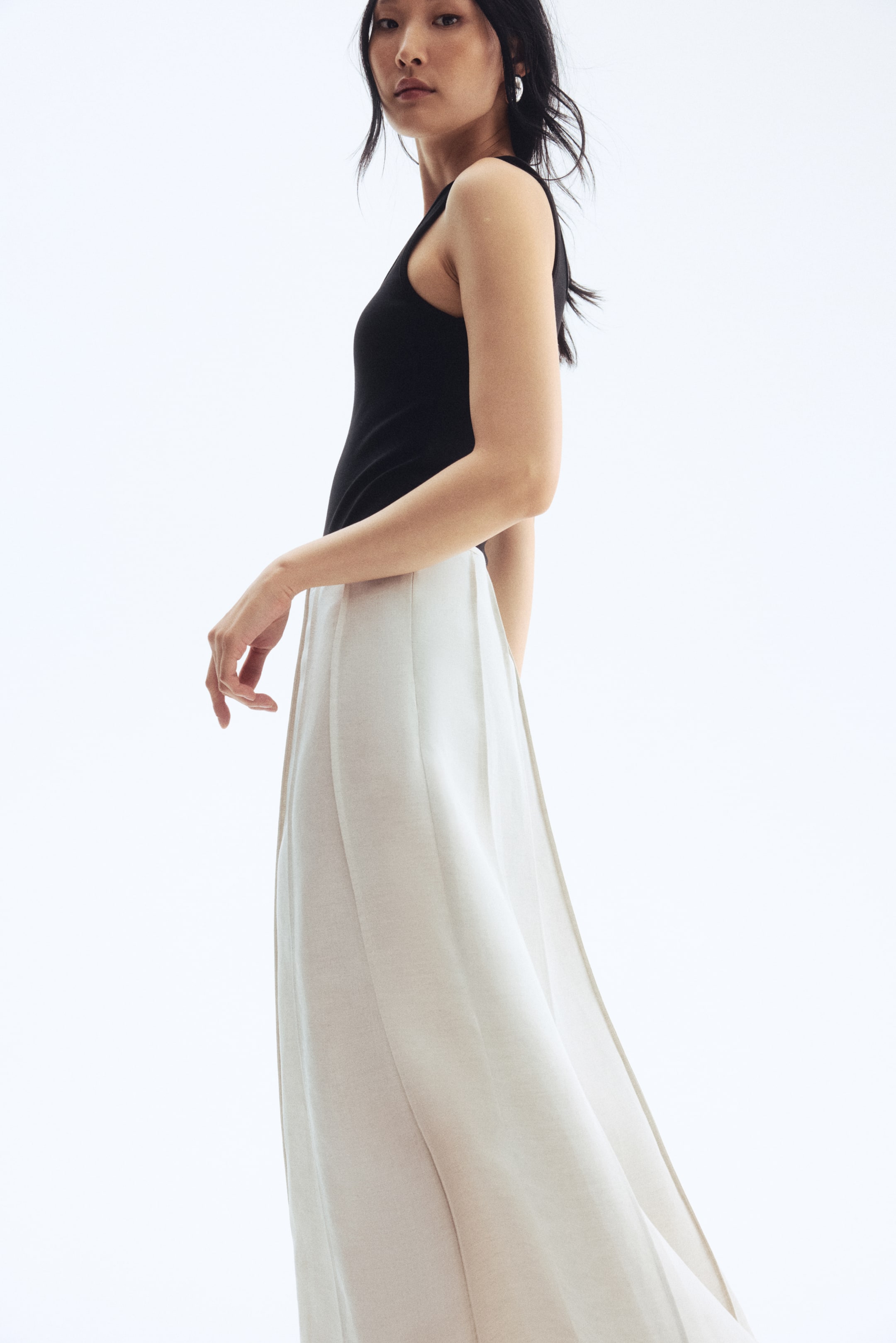 Gonna lunga dalla linea ampia in tessuto di misto lino e viscosa. Design accattivante con vita alta e cuciture su tutta la superficie. Svasata in fondo. Chiusura con cerniera e gancetto nascosti su un lato.