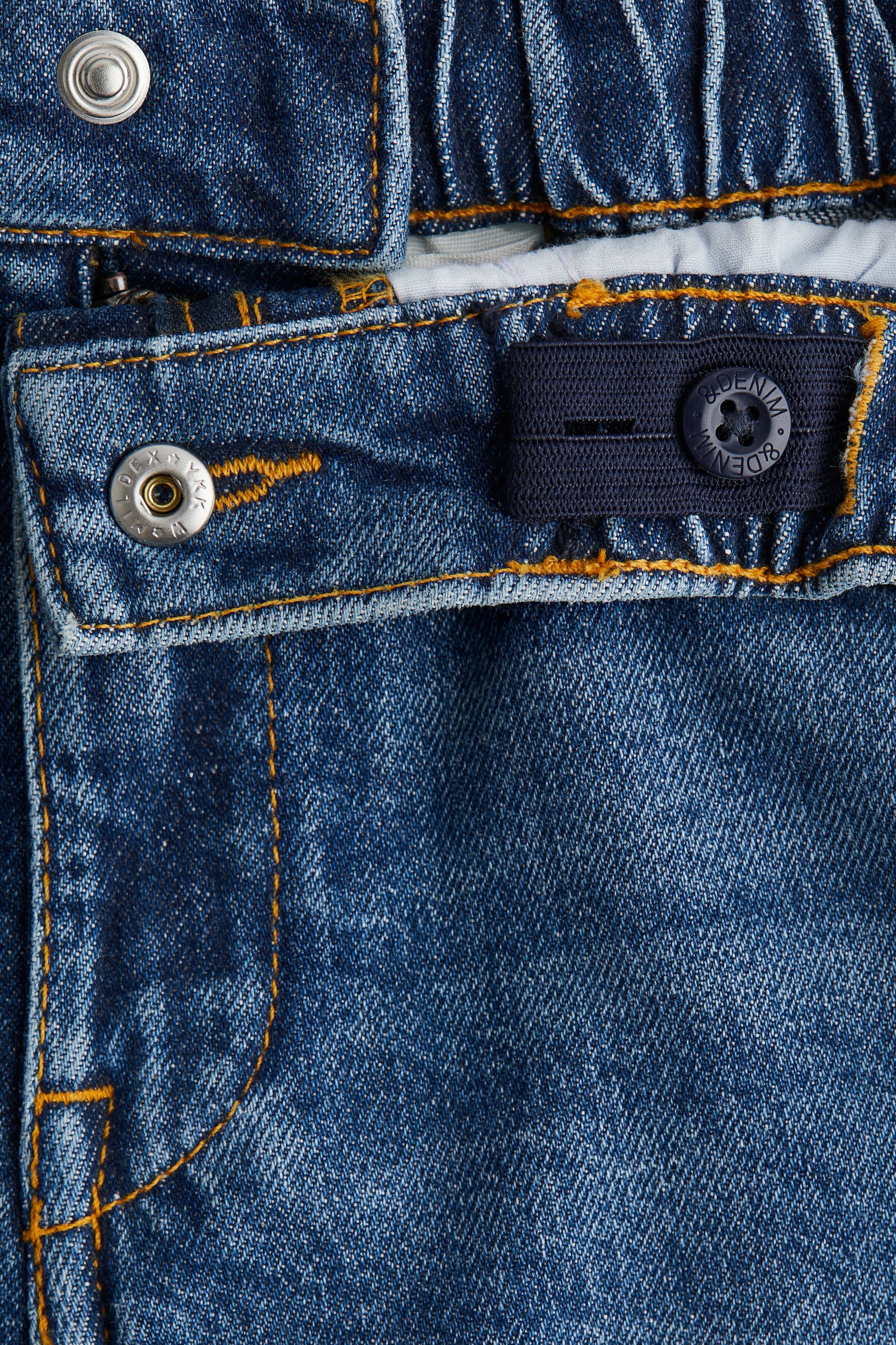 Shorts a 5 tasche in denim elasticizzato, lunghezza al ginocchio. Vita regolabile con elastico, patta con cerniera e bottone automatico.