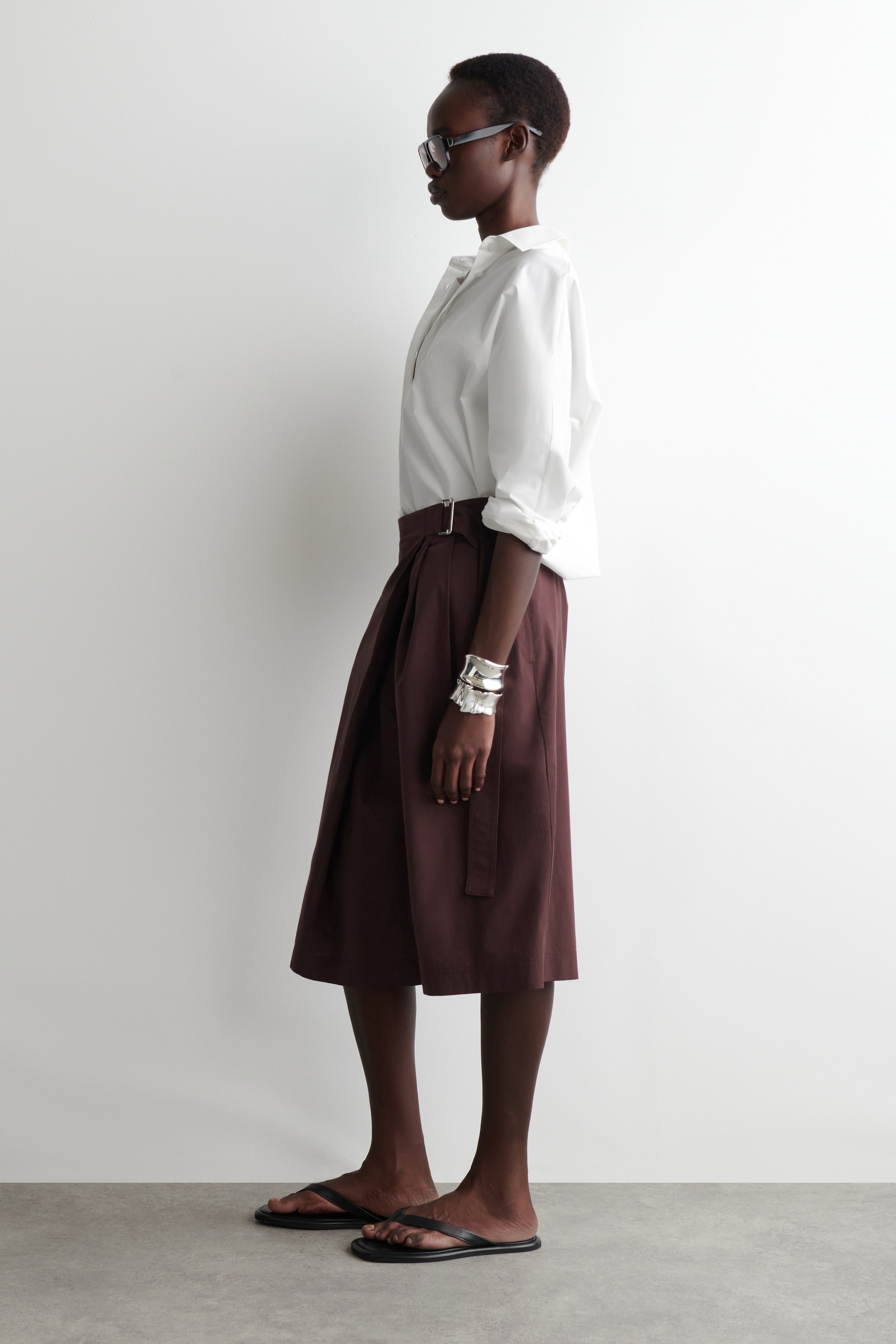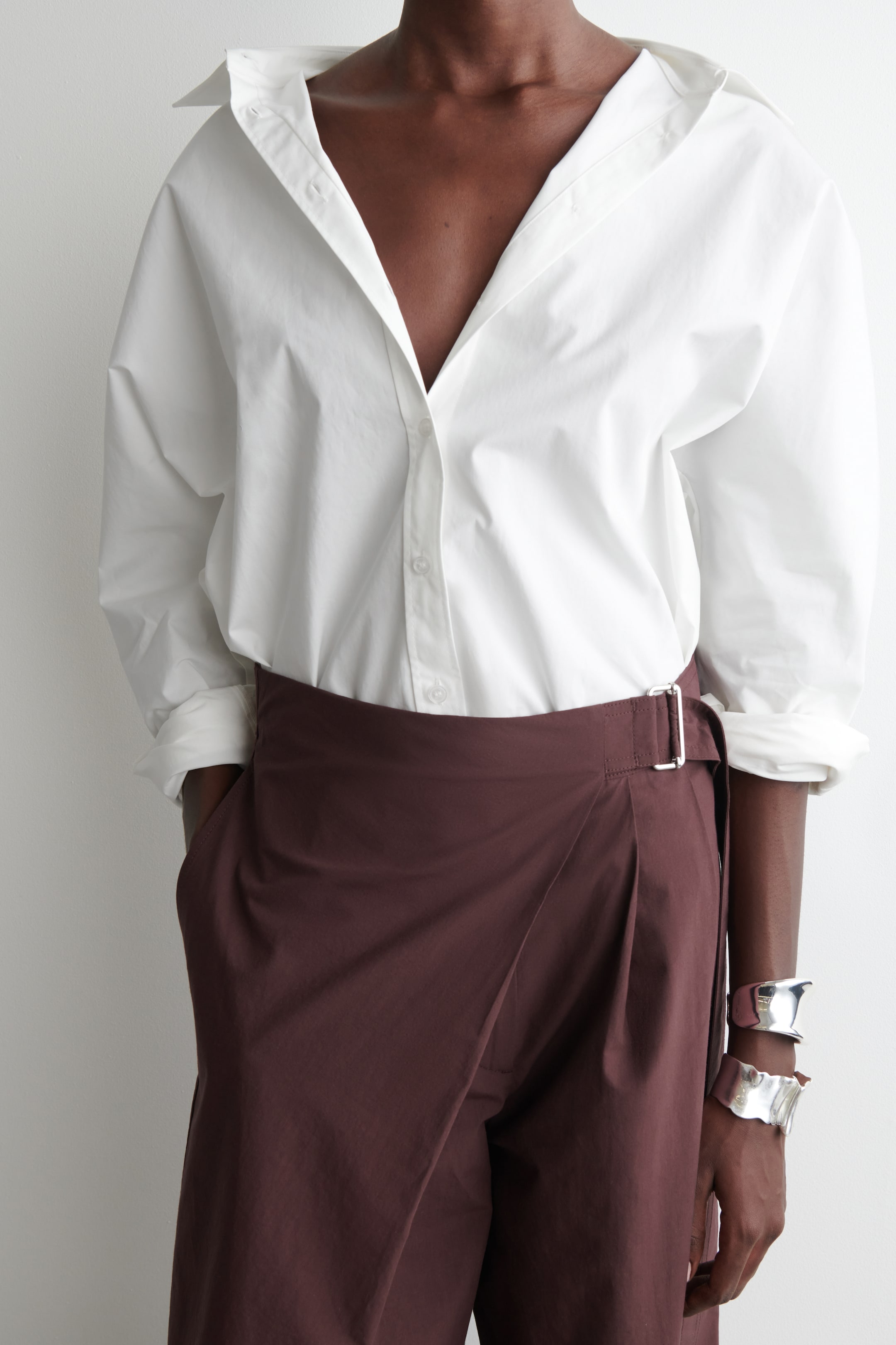 Modernising classic tailoring codes, these longline shorts are designed in a wrap-front shape that's held in place with a D-ring belt. They're crafted from lightweight cotton and tailored in an asymmetric silhouette with pleats that fall from one side. The welt pocket at the back pays homage to traditional suiting. Relaxed fit Hook-and-bar and zip closure Shell lining: 100% Cotton. Excluding trims / Machine wash Inside leg length of size EU 36 is 37.7cm / Model wears a size EU 36