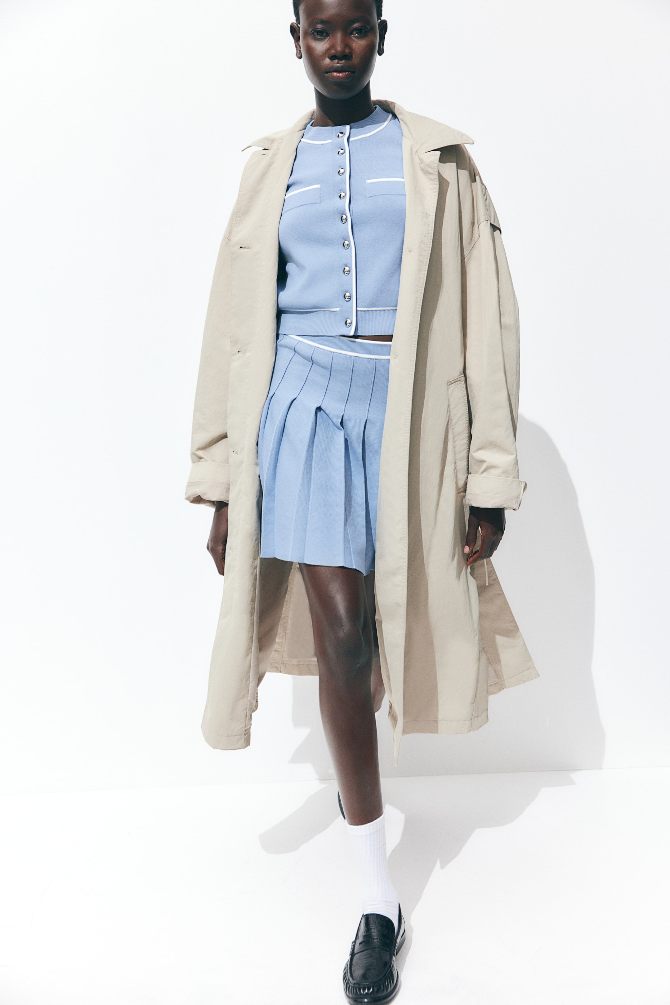 Cardigan corto in maglia consistente con bordi in colore contrastante. Scollo rotondo, bottoni in metallo sul davanti. Finti taschini in alto, maniche corte.