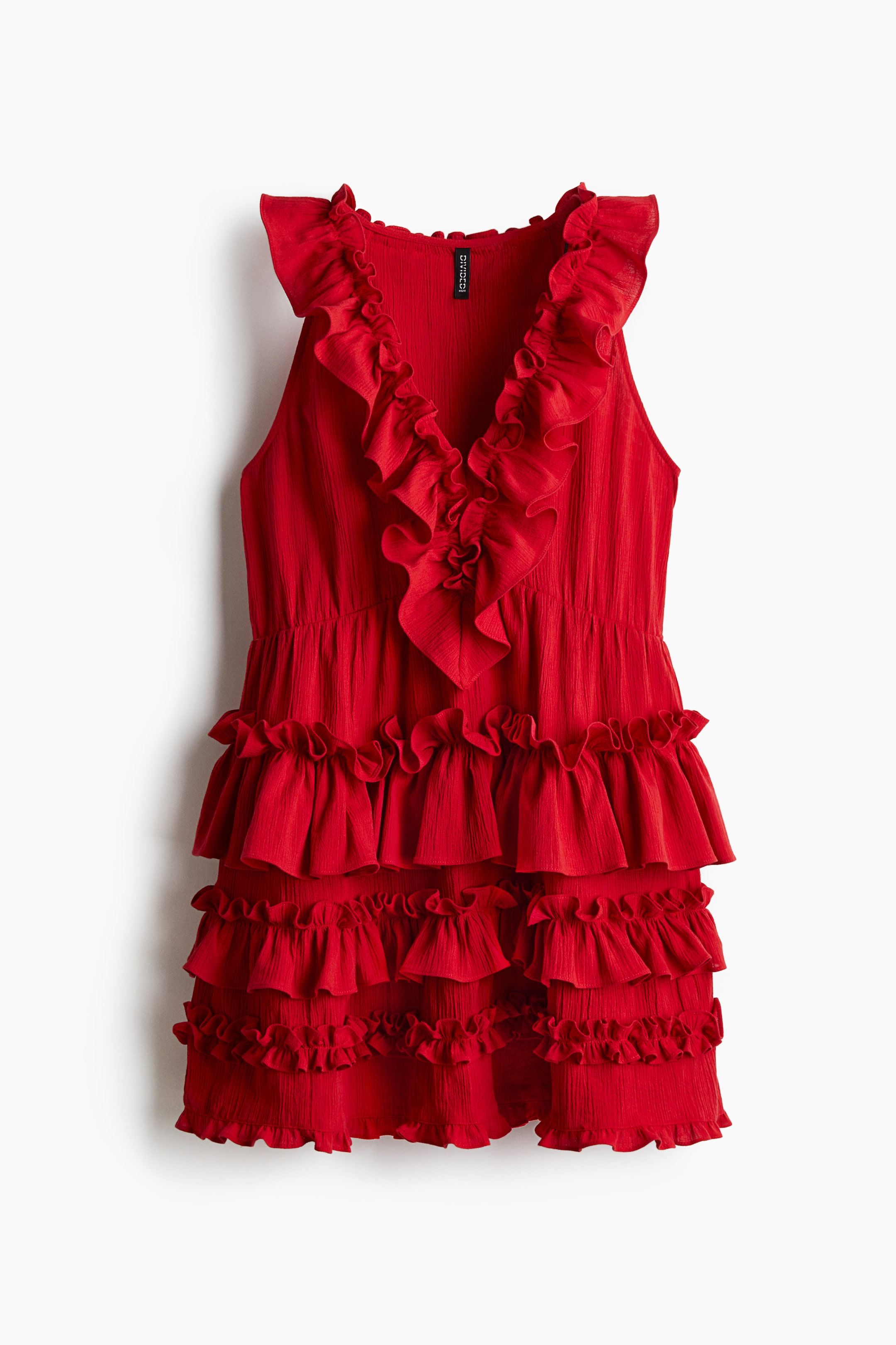 Abito corto e senza maniche in tessuto di cotone goffrato. Profondo scollo a V con bordo a volant. Cucitura elasticizzata in vita, gonna leggermente svasata con bordo con volant di varie larghezze. Sfoderato.
