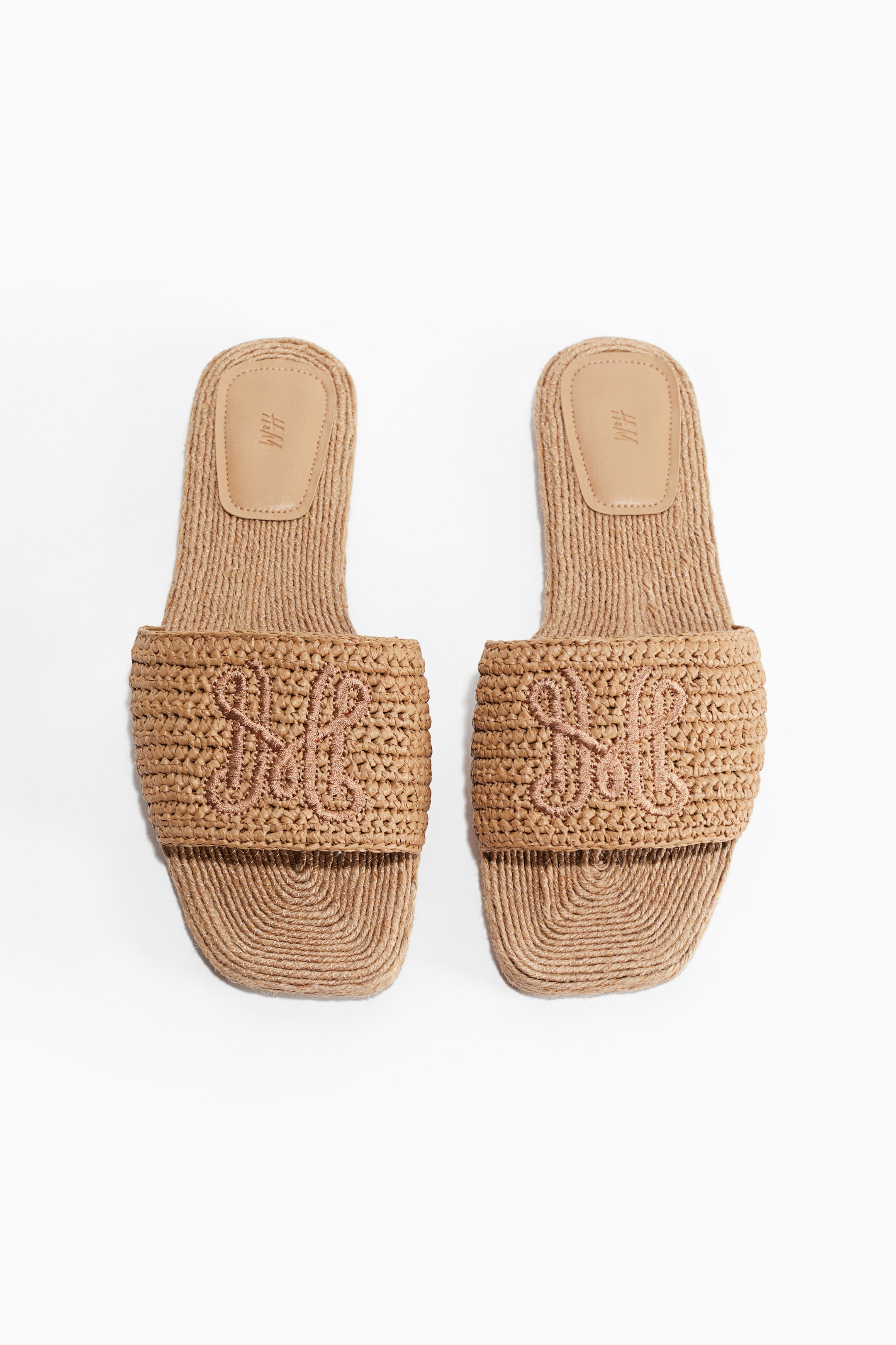 Sandali modello espadrillas in finta paglia di plastica intrecciata. Ricamo decorativo sul davanti. Punta squadrata, fodera in tela e soletta in iuta intrecciata.
