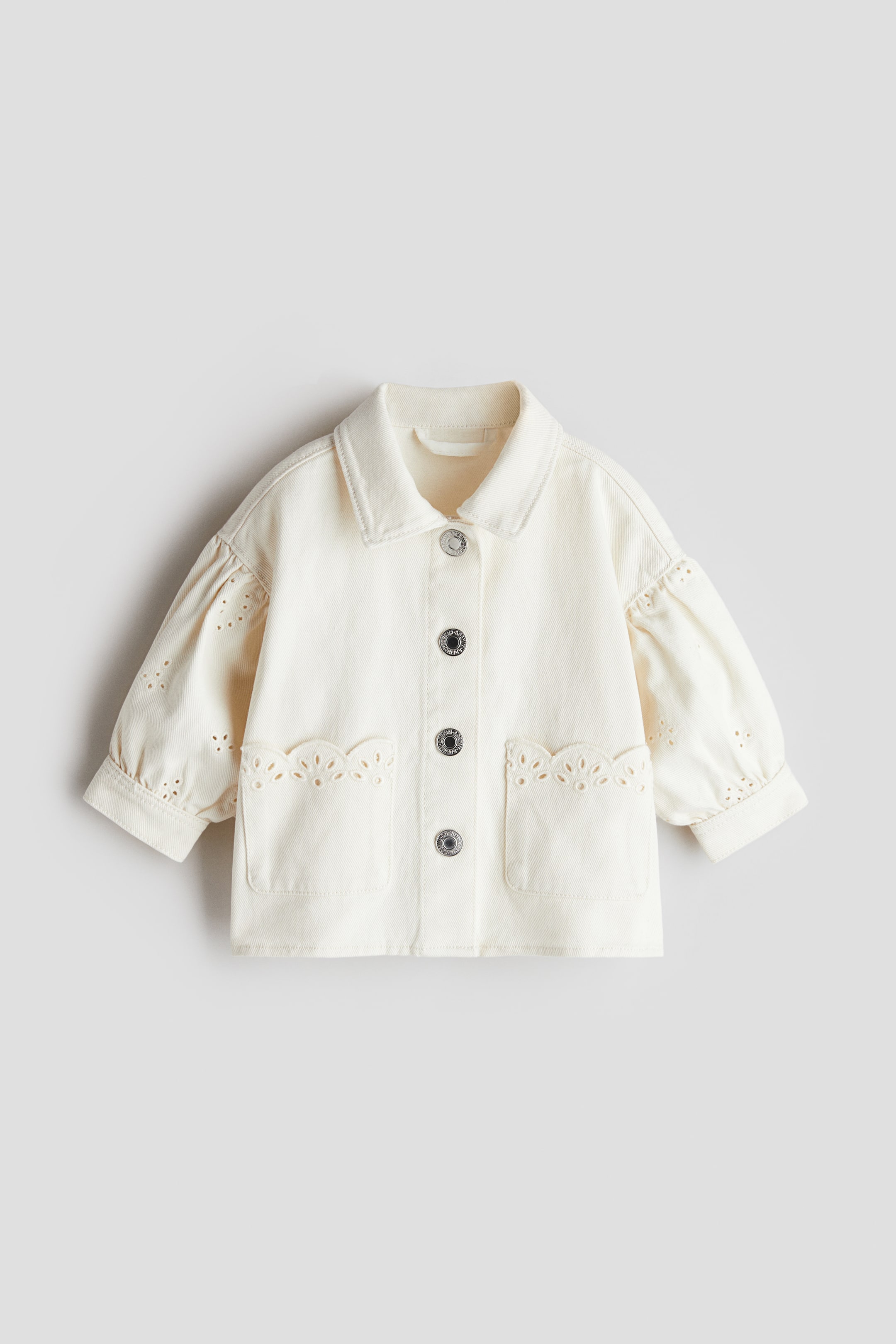 Overshirt in morbido twill di cotone. Maniche lunghe a sbuffo, tasche con bordo smerlato in sangallo. Colletto turn-down, bottoni automatici davanti. Spalle basse, polsini con bottone.