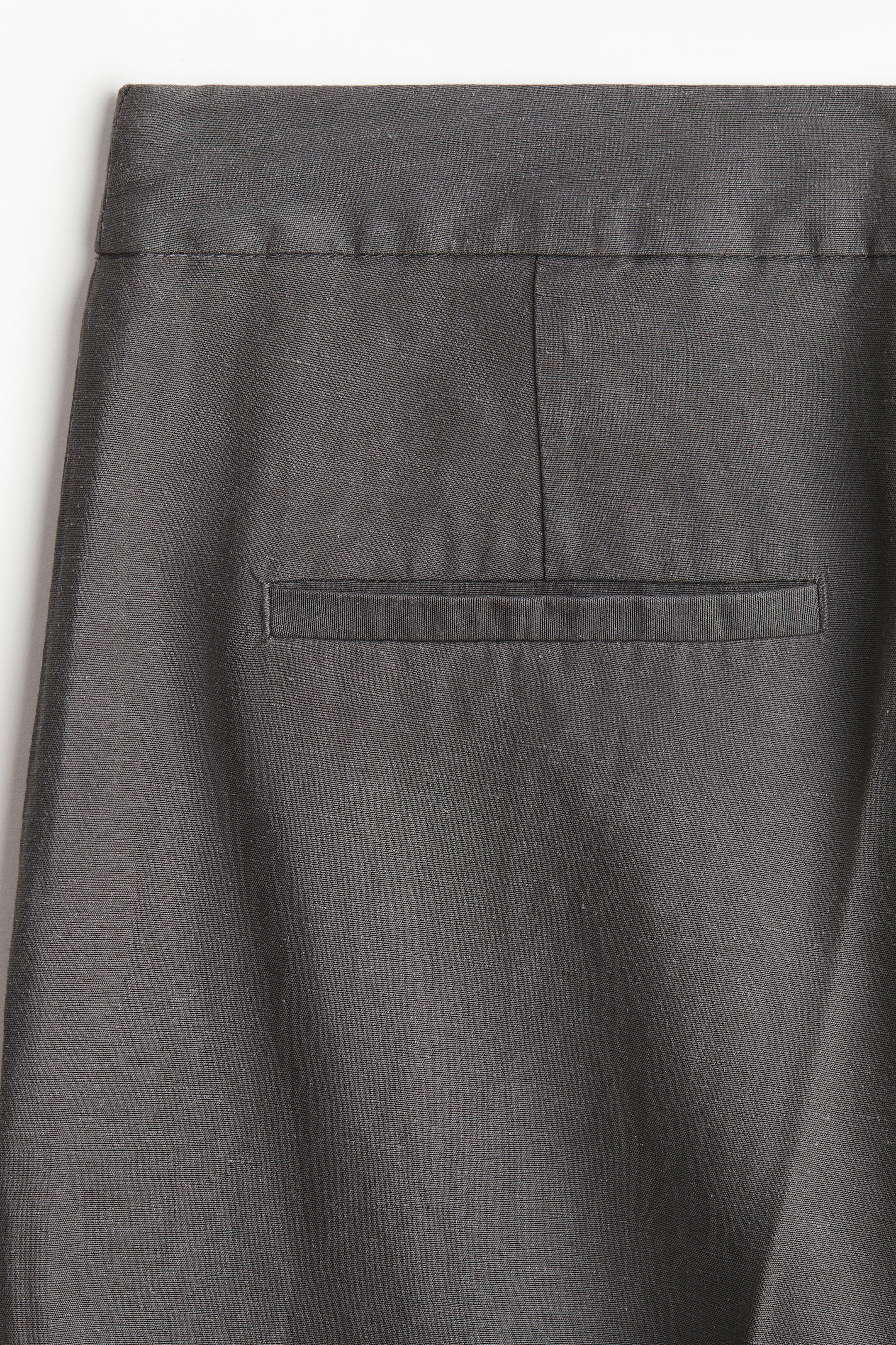 Pantaloni eleganti e lunghi alla caviglia in tessuto leggero di misto lino e viscosa. Vita alta con patta con cerniera, girovita allungato con bottone. Tasche laterali oblique, finte tasche a filetto dietro. Gamba ampia con piega stirata davanti e dietro.