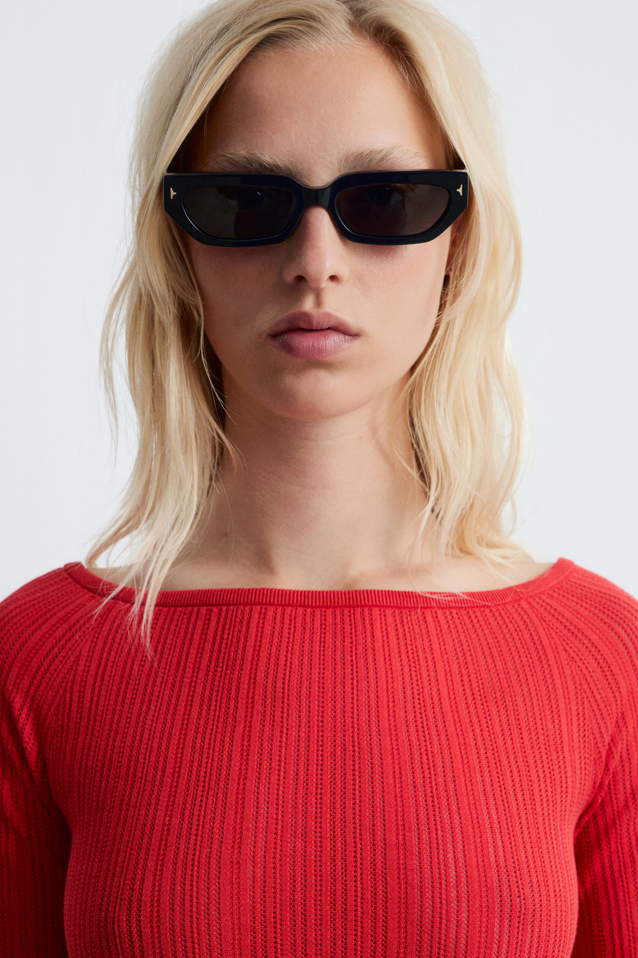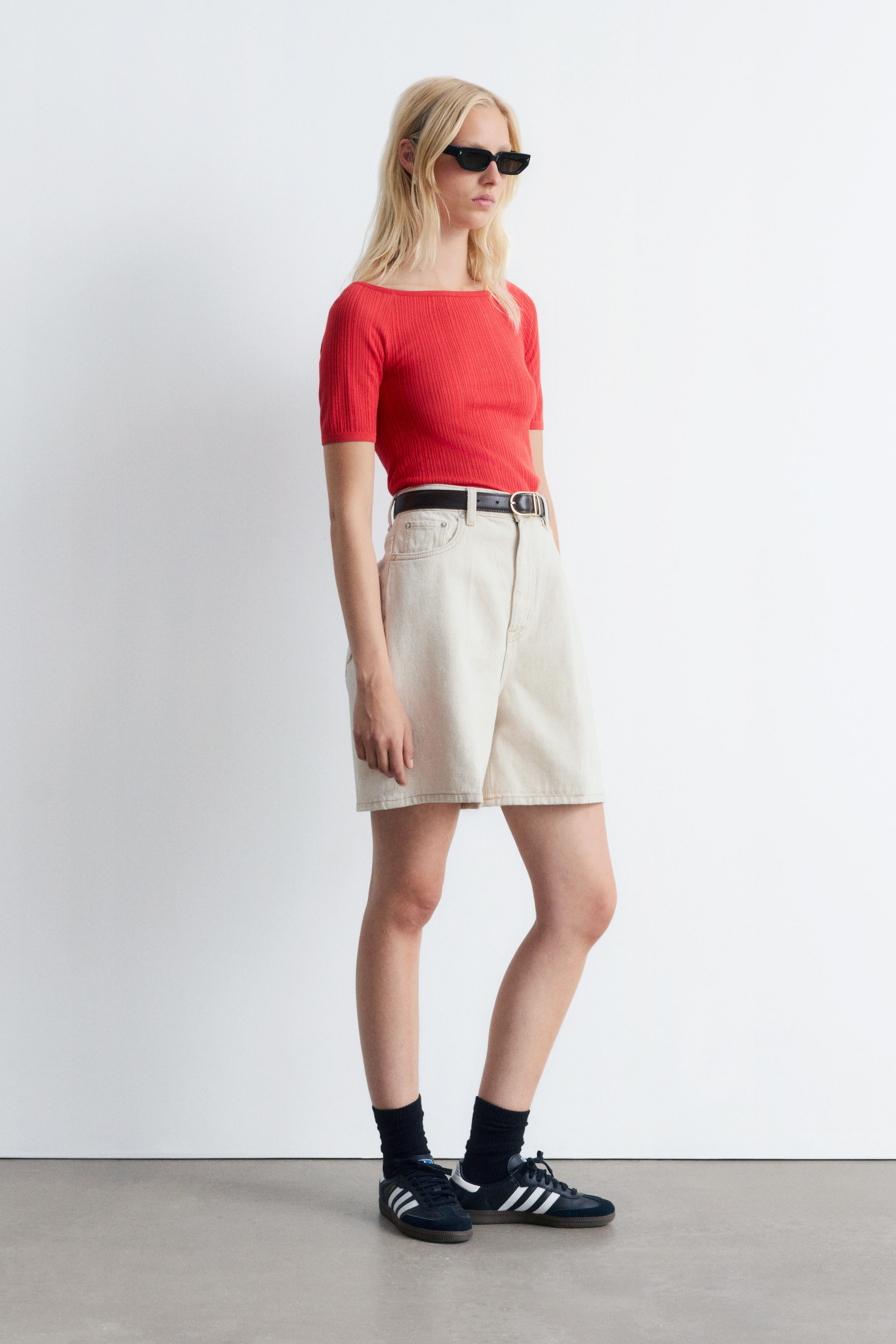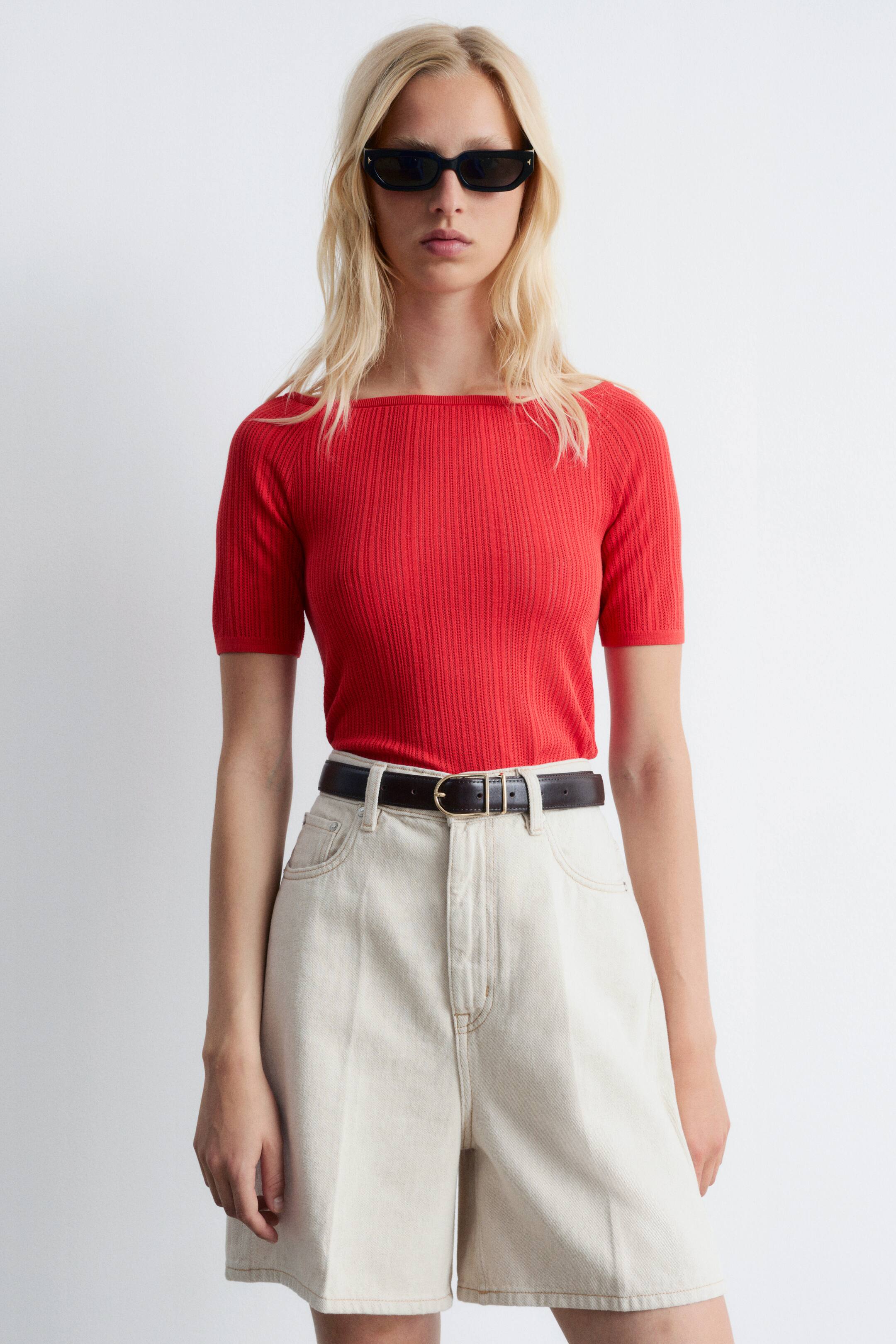 This off-shoulder top is crafted from a soft cotton blend with a rib knit pointelle finish. Cut in a slim fit silhouette, it features a straight neckline and short, fitted sleeves. Style it with jeans or a mini skirt. Length of top:41.5cm / 16.3" (Size S)