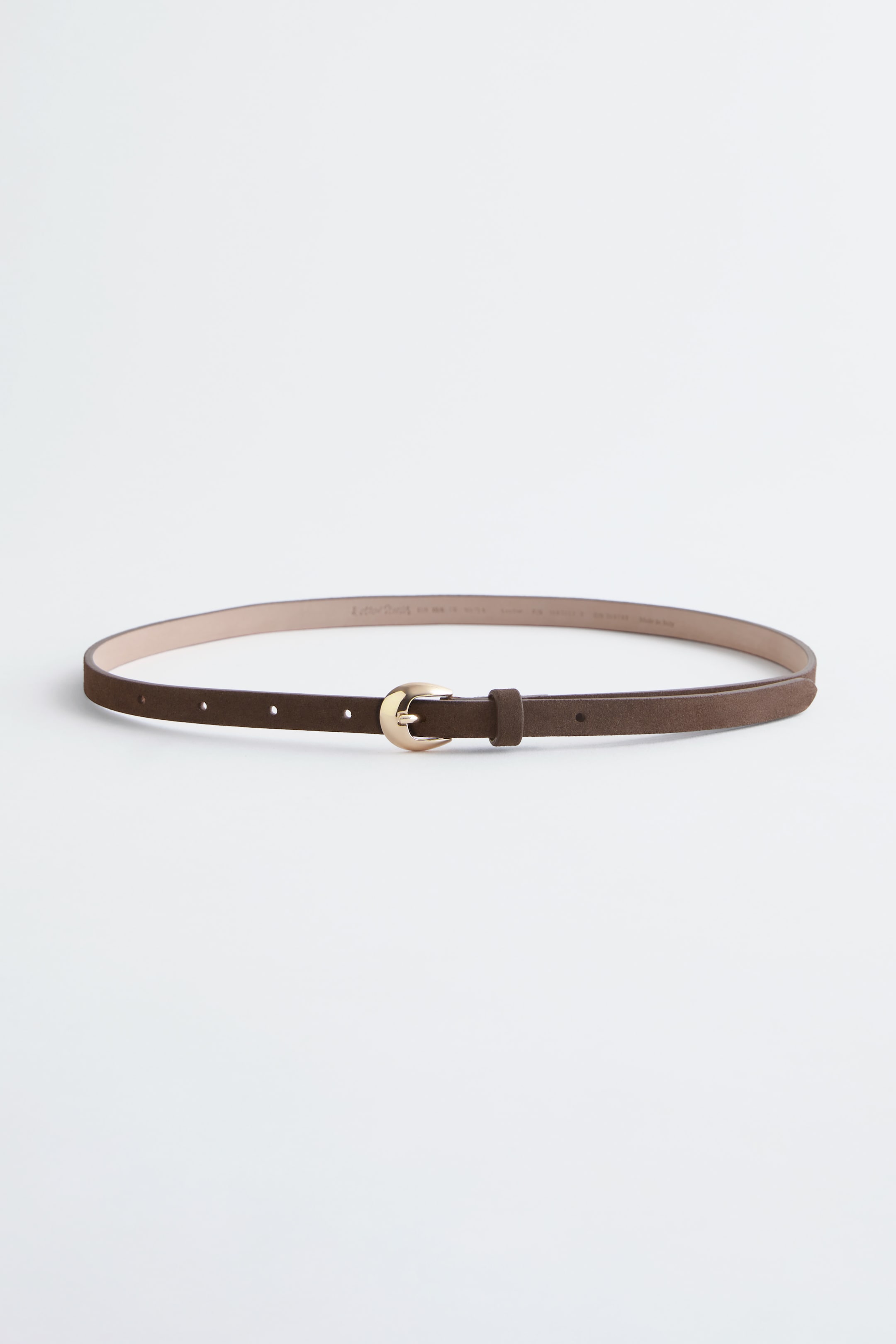 The distinct shape of the gold-tone buckle gives this slim belt an understated edge. It's made in Italy from supple leather and works just as well threaded through the loops of your favourite jeans as it does layered over a blazer.