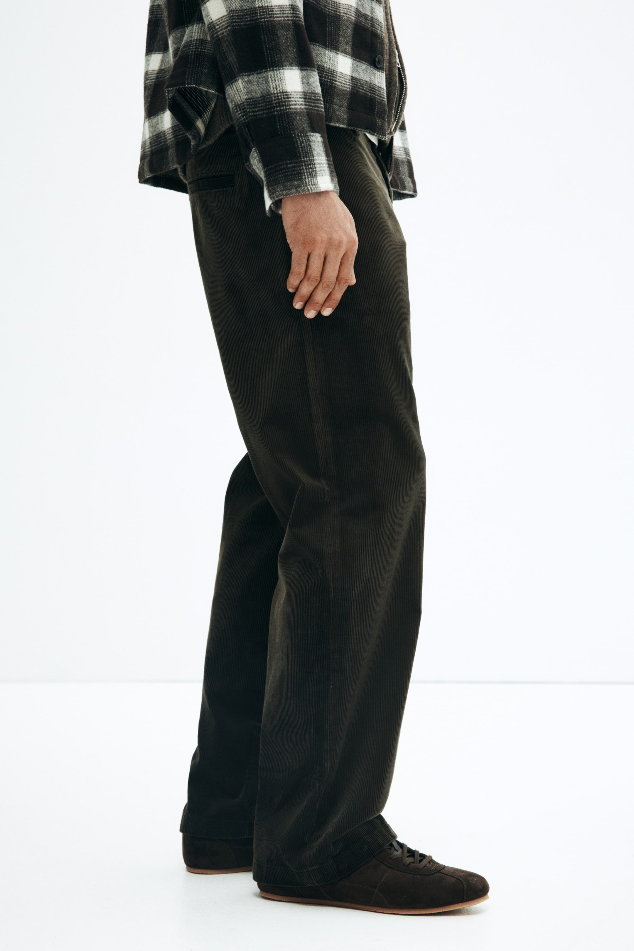 Pantaloni in morbido velluto a coste. Vita normale, patta con cerniera e bottone. Tasche laterali e tasche a filetto dietro. Linea rilassata per una vestibilità comoda ma non oversize.