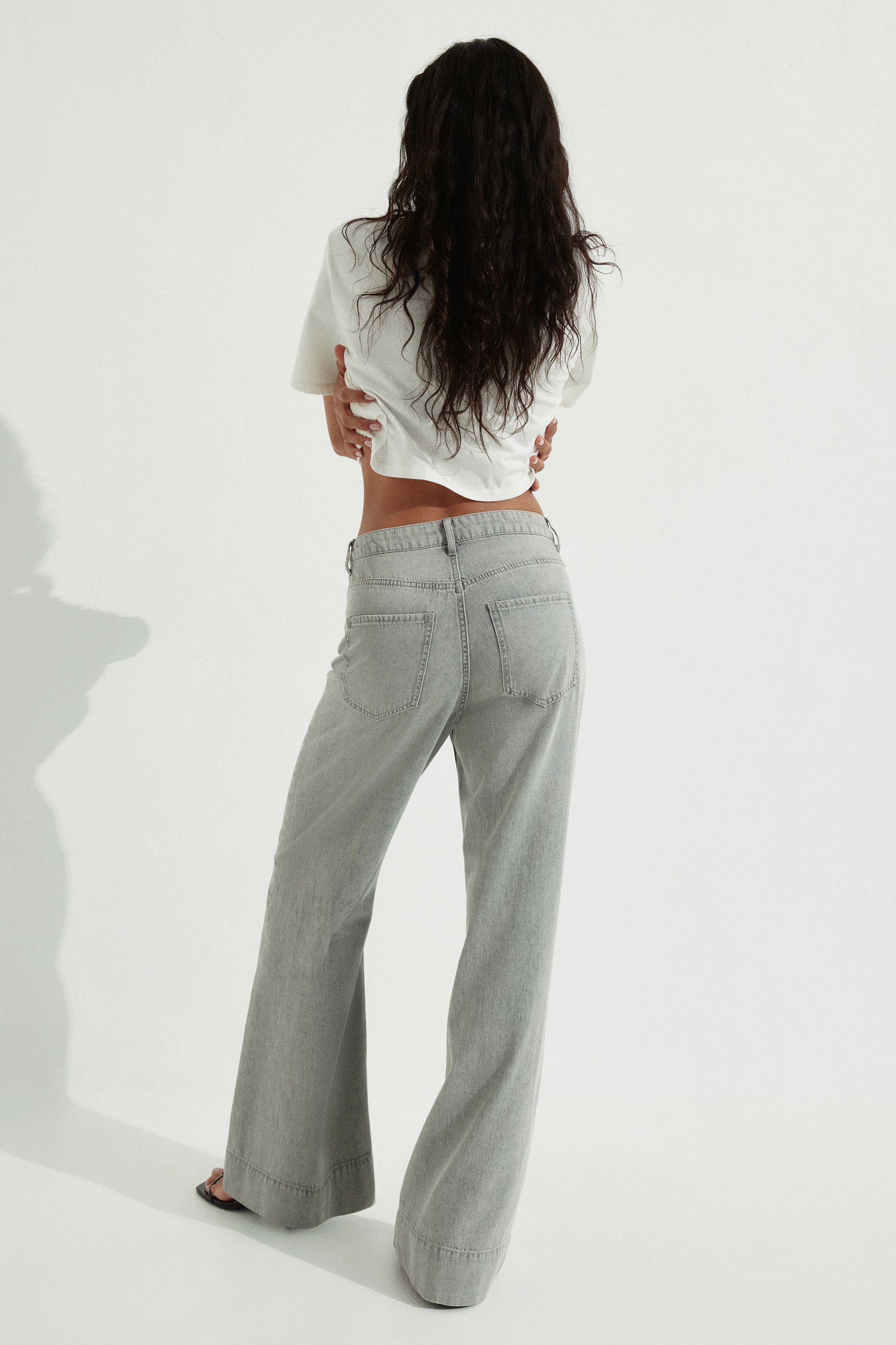 Jeans in robusto denim. Può sembrare rigido appena indossato, ma si ammorbidisce con l'uso. Gamba ampia con vestibilità normale dalla vita ai fianchi, ampia dalle cosce fino in basso. Vita altissima, patta con cerniera e bottone. Tasche applicate davanti e dietro. Modello più lungo, con il tessuto che ricade morbidamente sul piede. I jeans a gamba ampia sono indispensabili in qualsiasi guardaroba.