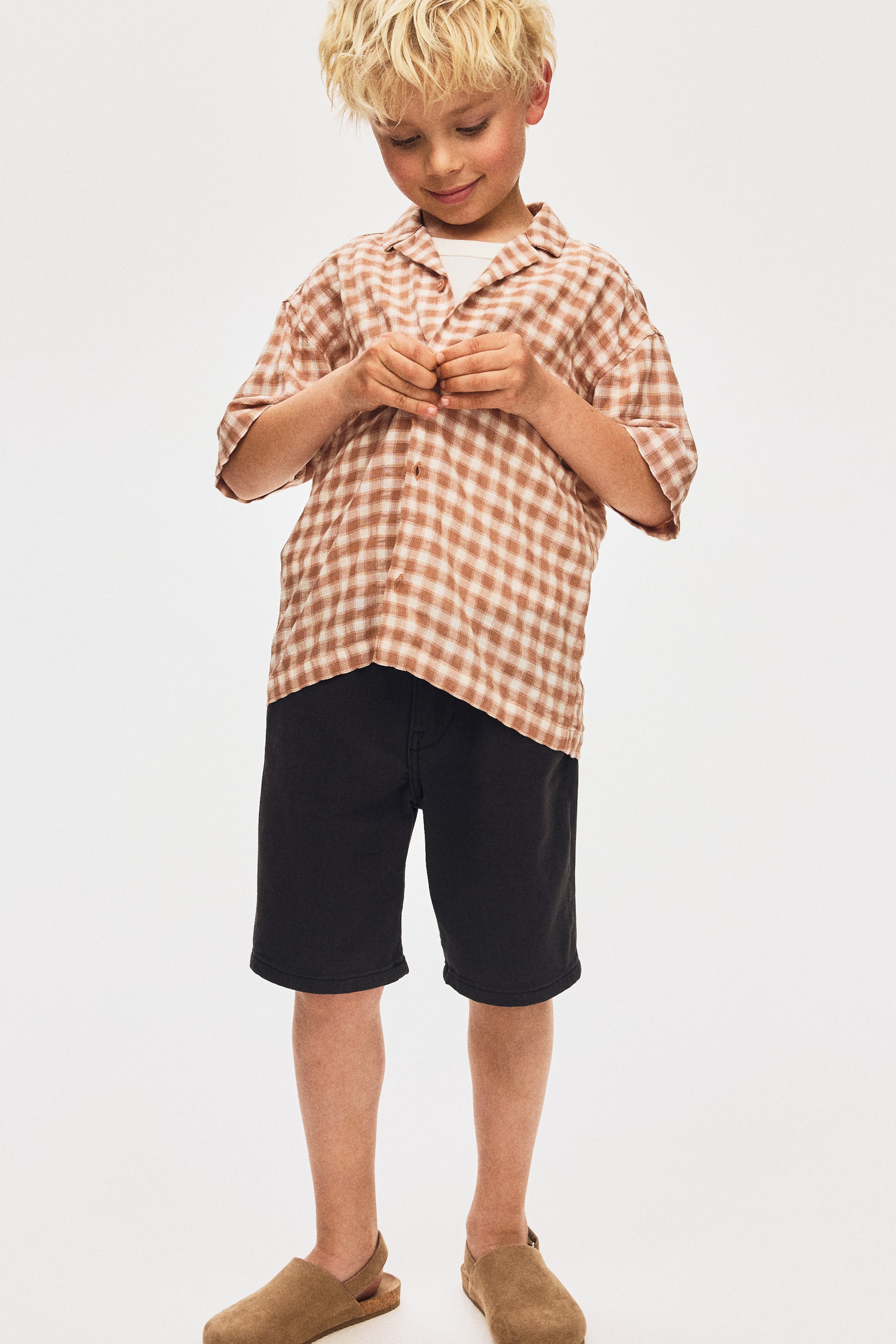 Camicia ampia in morbido tessuto di misto cotone. Colletto bowling, bottoni davanti, spalle basse e maniche corte.