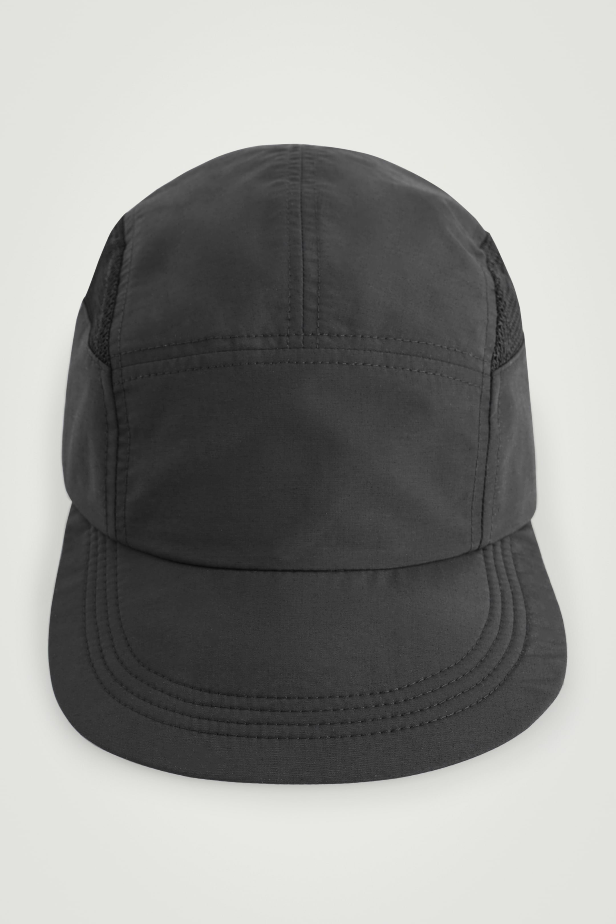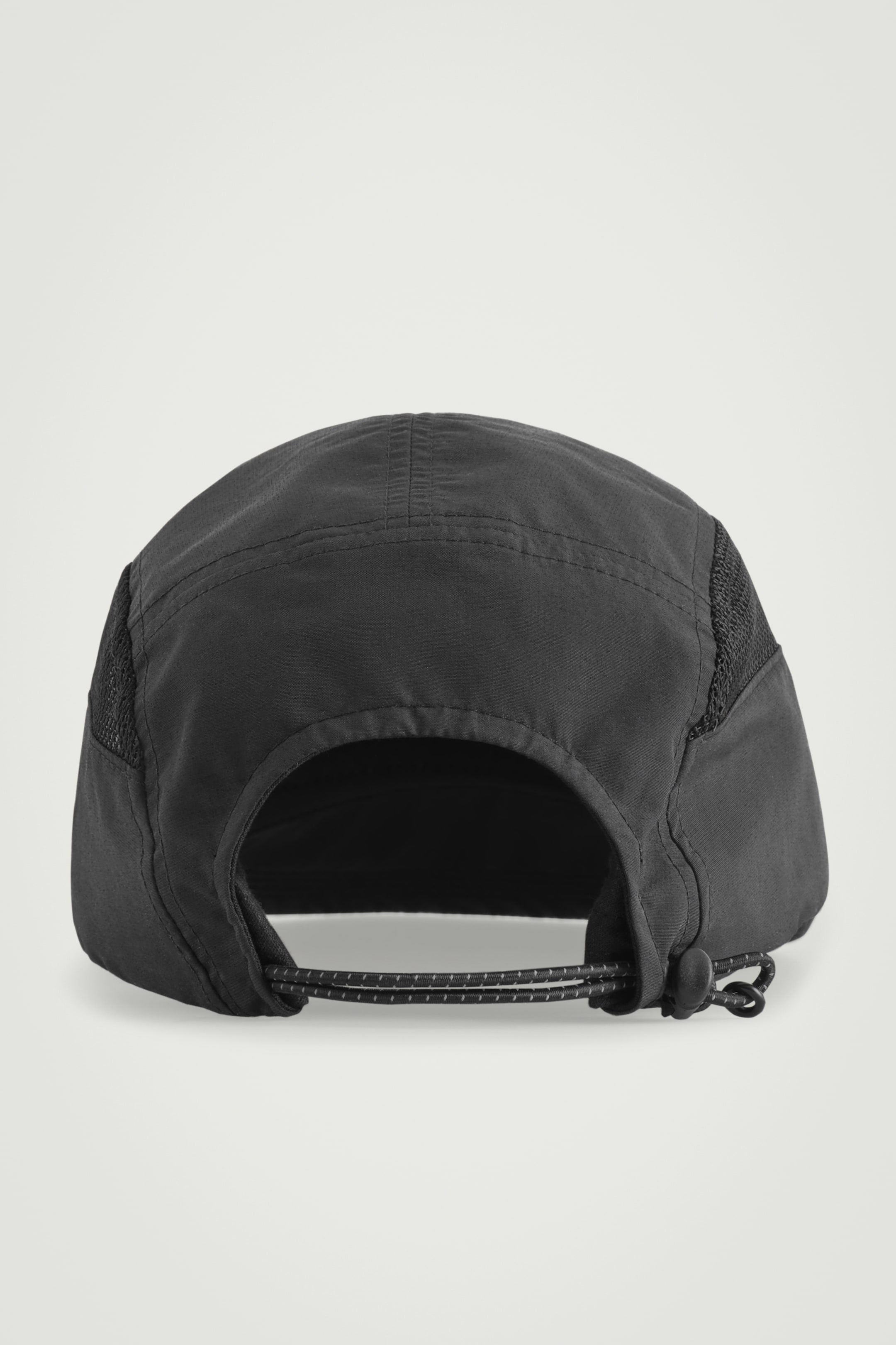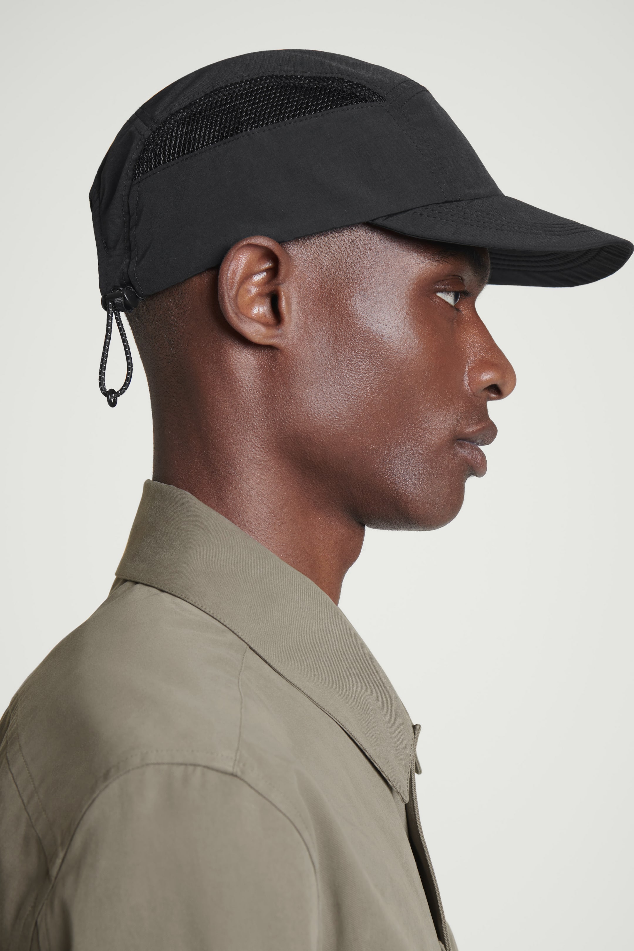 Borrowing from utility, this modern cap is made from recycled nylon with breathable mesh panels at either side. It's designed with a drawstring toggle for a personalised fit. Toggle closure Recycled polyamide is polyamide made from textile waste in production Shell: 100% Recycled polyamide (Recycled nylon). Details and lining: 100% Recycled polyester. Excluding trims Inner circumference of size XS/S is 57cm, M/L is 59cm