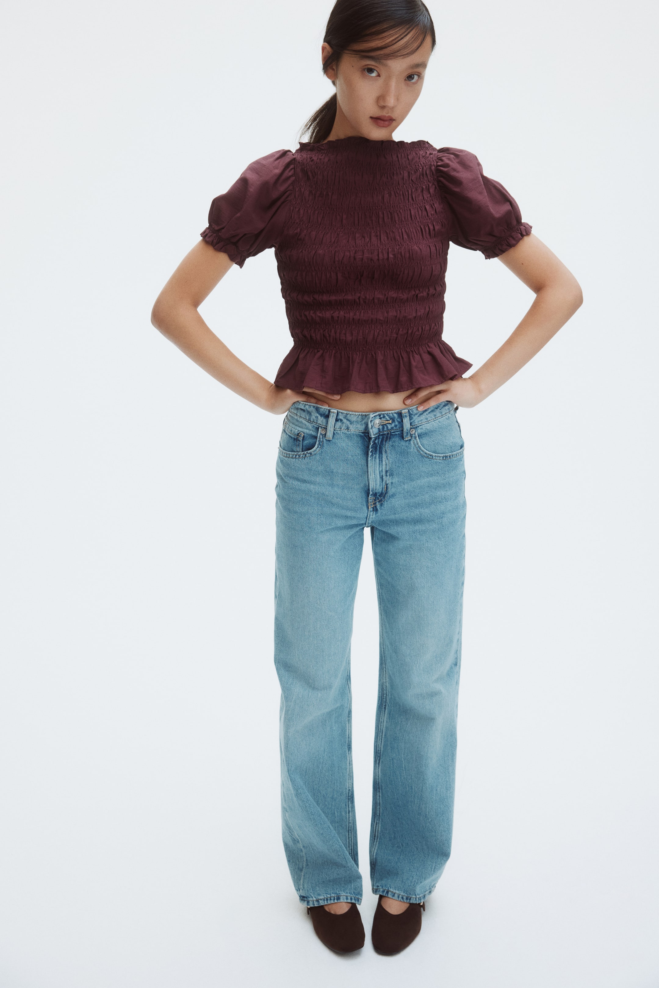 Camicetta aderente in tessuto a smock con scollo a barca e bordo svasato in basso. Maniche corte a sbuffo con elastico sottile e bordo a volant in fondo.