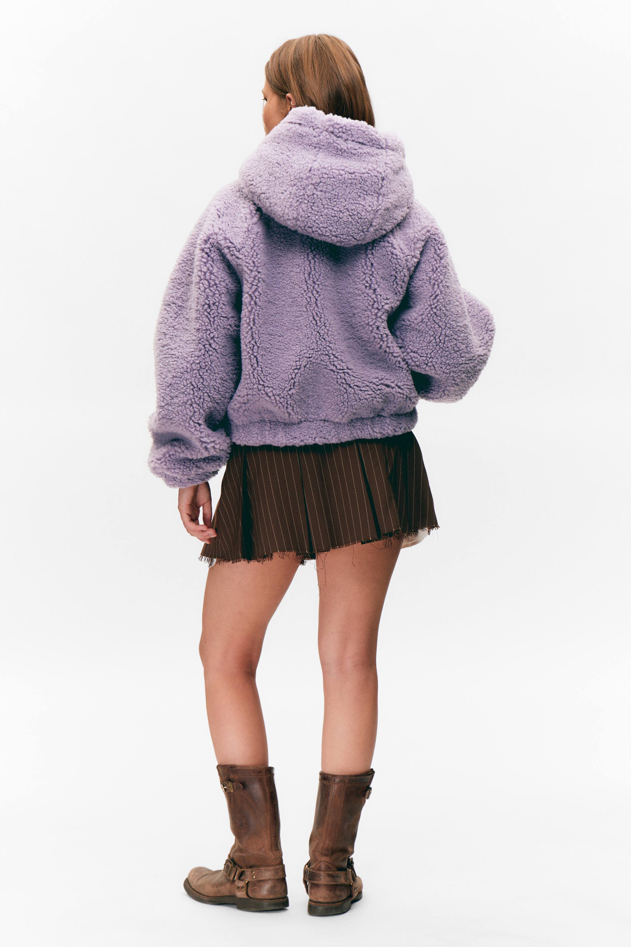 A knitted, loose fit, long-sleeve hoodie featuring stripe details on the arms and a zip closure.