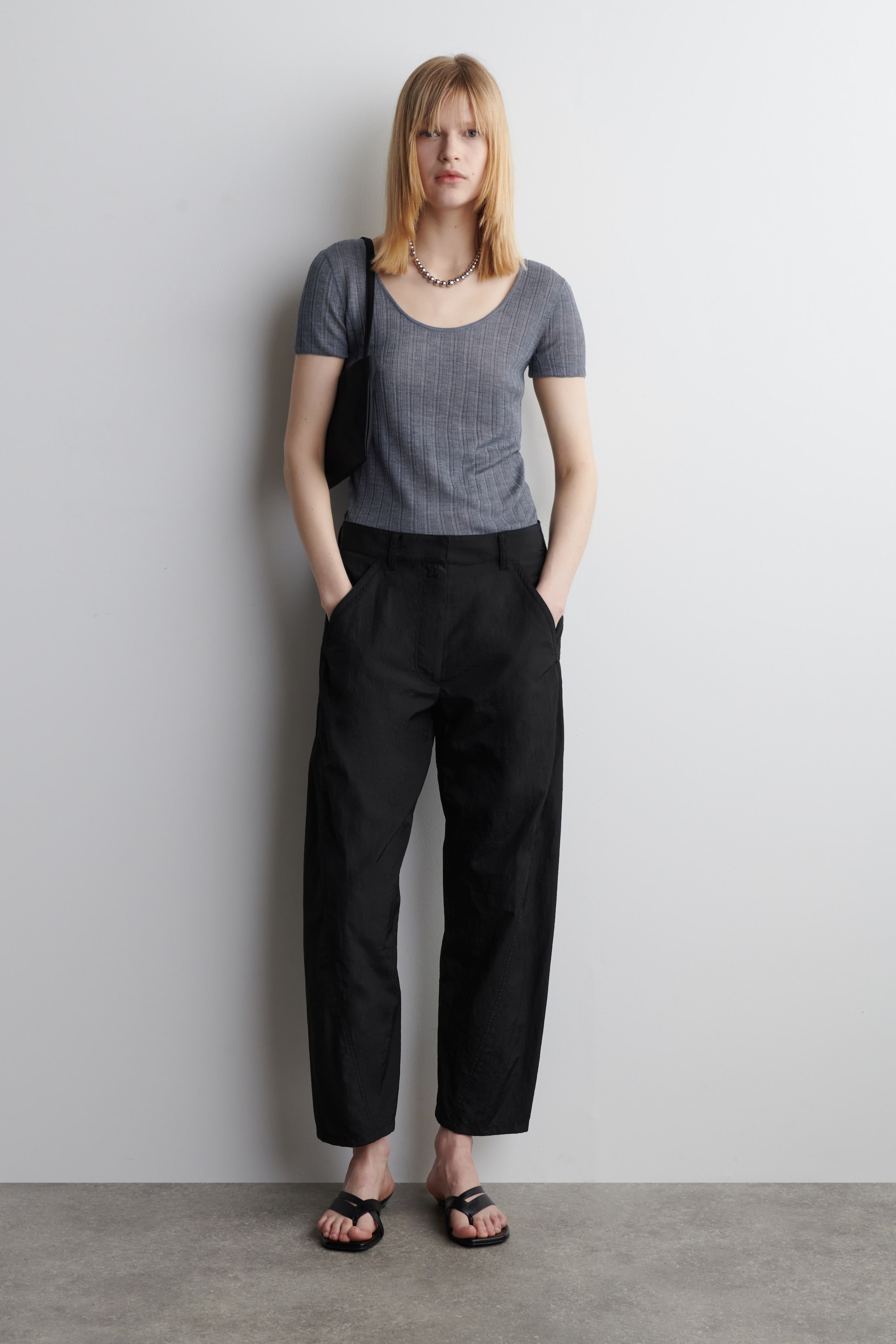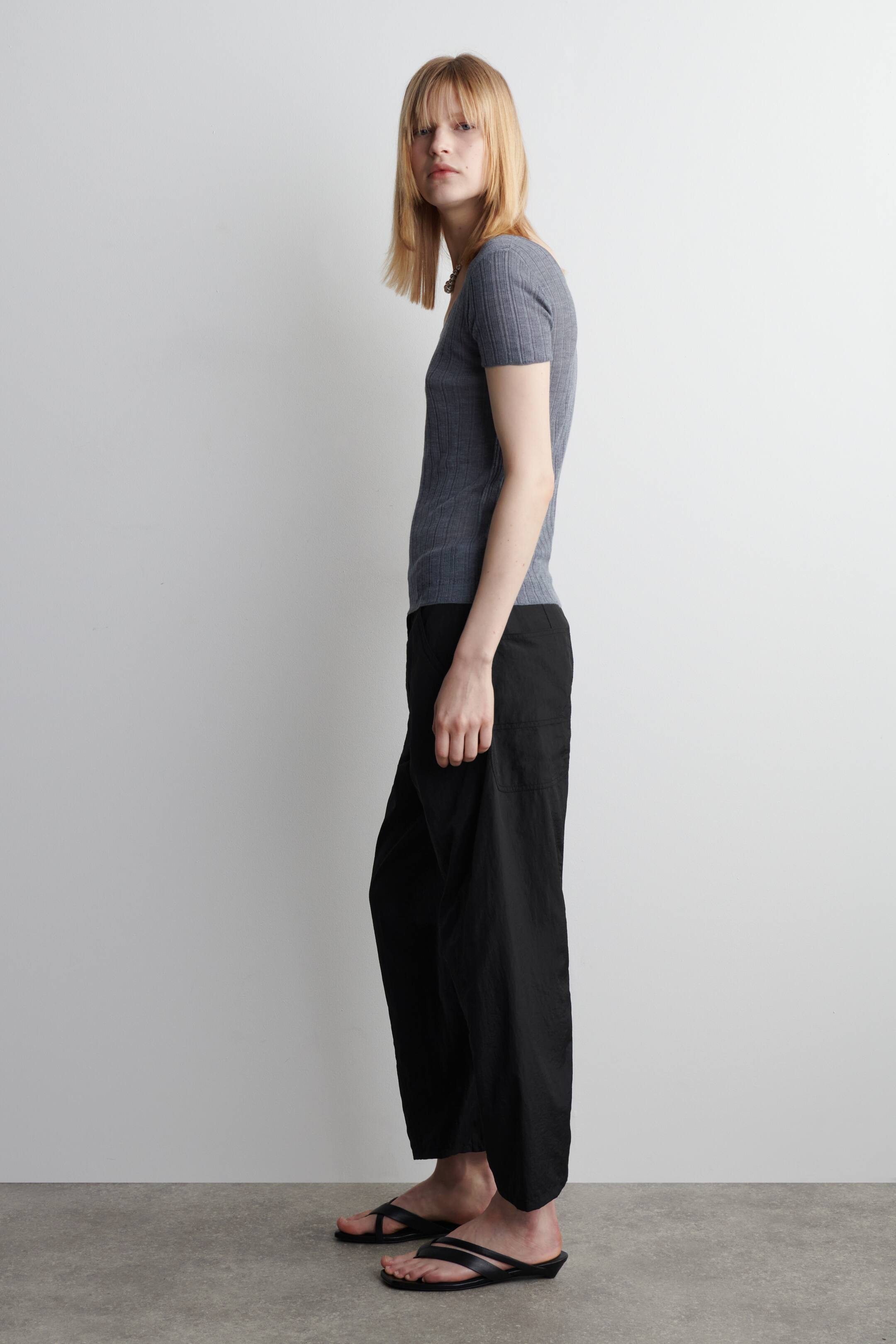 Premium fabrics and inviting textures transform the classic COS T-shirt. Rendered in an enduring mélange-grey tone, this refined piece is cut in a slim silhouette and rib-knitted from luxuriously soft mulberry silk and merino wool. It's finished with a scooped neckline and tubular trims. Slim fit, 18g knit This product contains Responsible Wool Standard TE-00047206 (RWS) wool fibre from farms certified to animal welfare and land-management requirements Shell: 70% Mulberry silk, 30% Merino wool. Excluding trims / Machine wash Front length of size S is 59cm / Model wears a size S