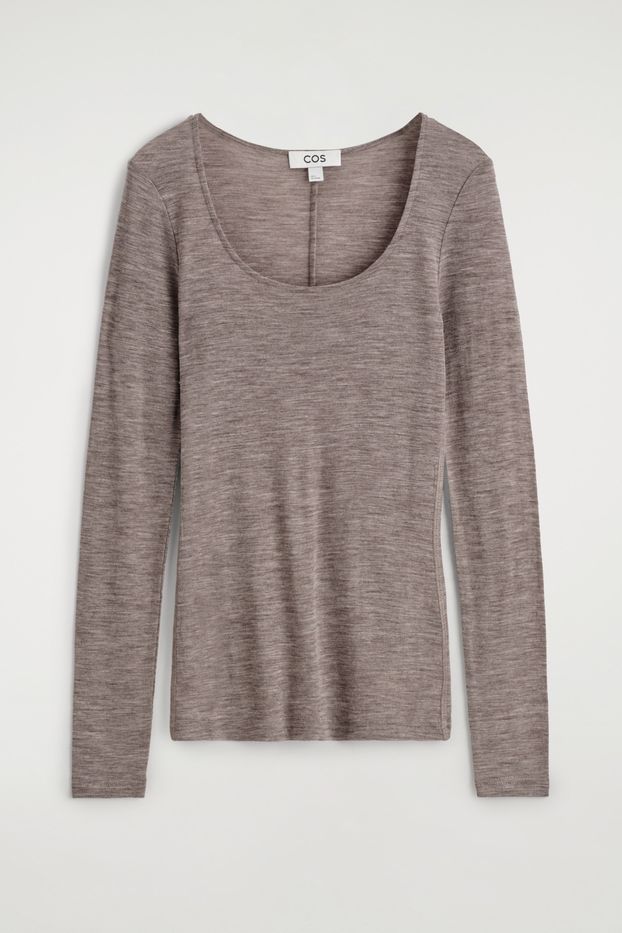 Finely knitted from premium merino, this sophisticated long-sleeved top lends itself to transitional styling. It's offered in a versatile light brown-mélange tone and features a softly scooped neckline and a French seam along the back. It's as impactful worn as a standalone piece as it is layered beneath other knits. Slim fit This product contains Responsible Wool Standard TE-00047206 (RWS) wool fibre from farms certified to animal welfare and land-management requirements Shell: 100% Merino wool. Excluding trims / Machine wash Back length of size S is 59.6cm / Model wears a size S