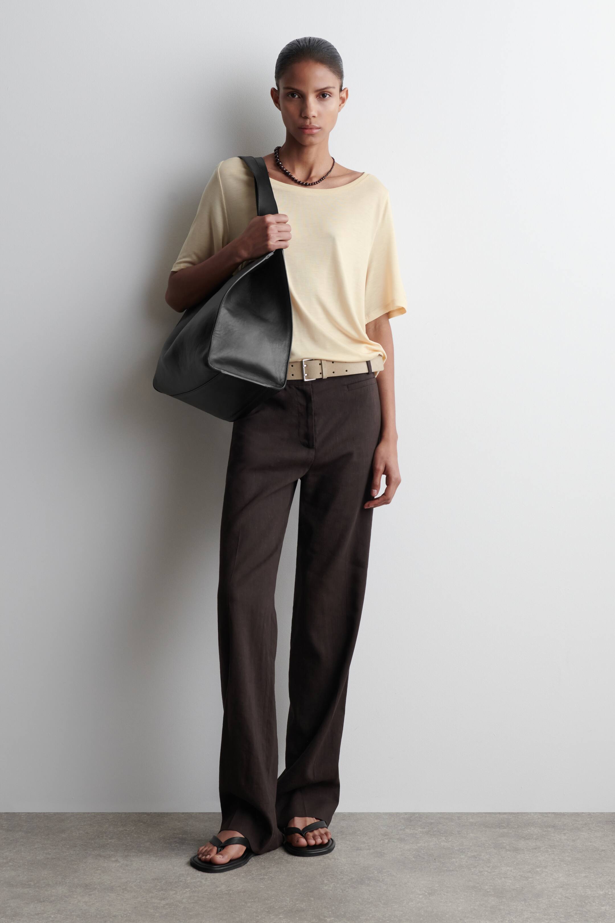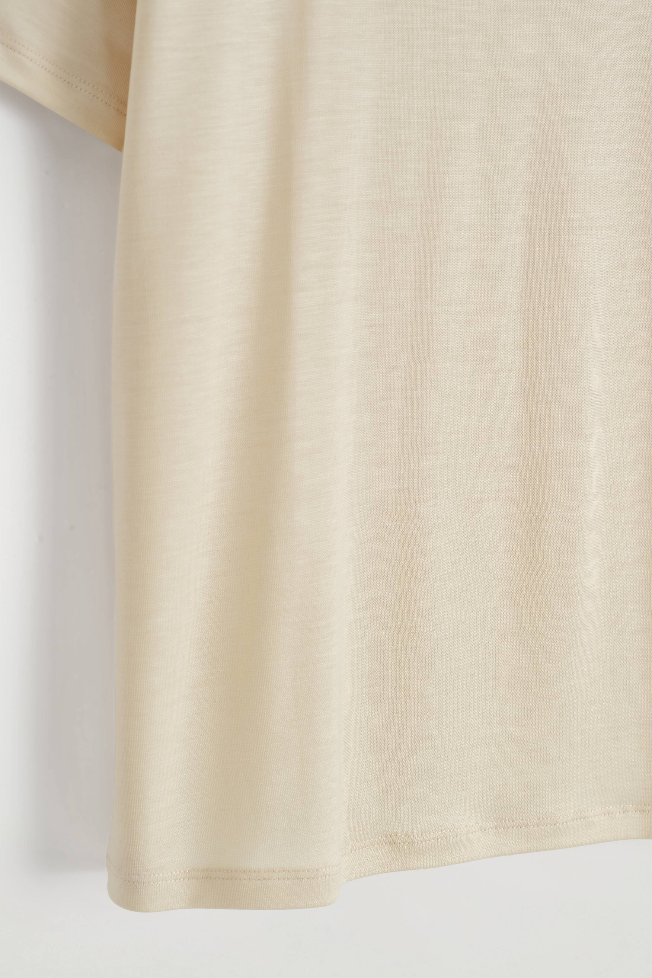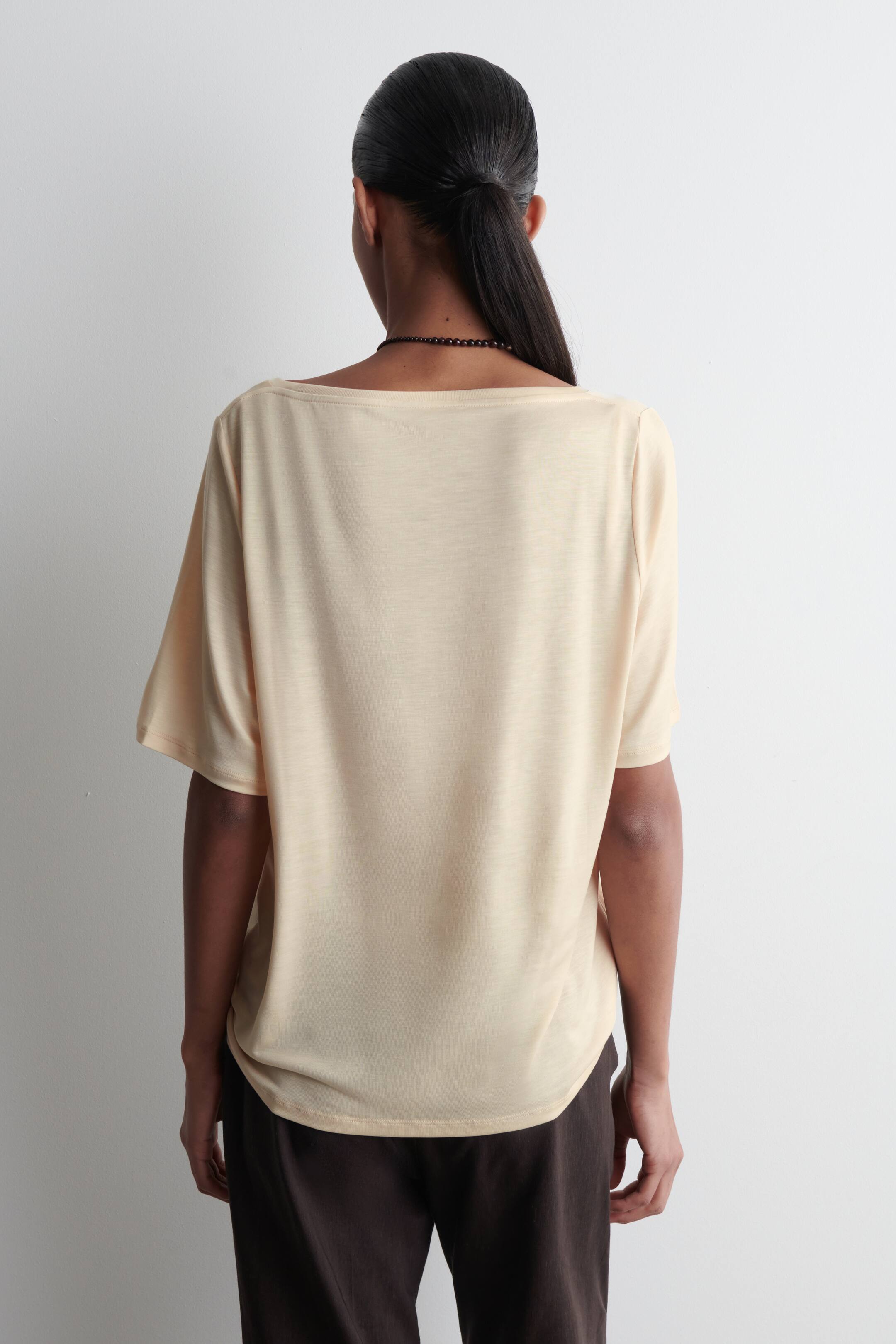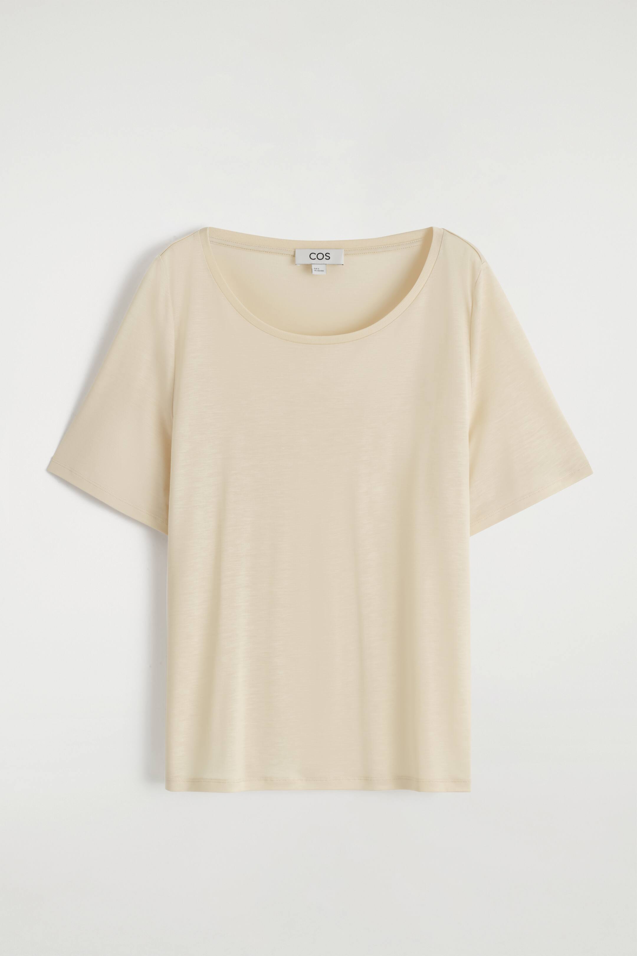 Effortlessly exaggerated, this relaxed T-shirt embodies the COS codes of signature shapes and premium quality. It has been finely knitted from TENCEL™ Lyocell, selected for its fluid drape, and finished with a modern scooped neckline. Relaxed fit, 160gsm TENCEL™ Lyocell is a regenerated wood-based fibre made from wood pulp. It is produced in a closed-loop process where chemicals are reused. Shell: 100% TENCEL™ Lyocell. Excluding trims / Machine wash Back length of size S is 62.1cm / Model wears a size S