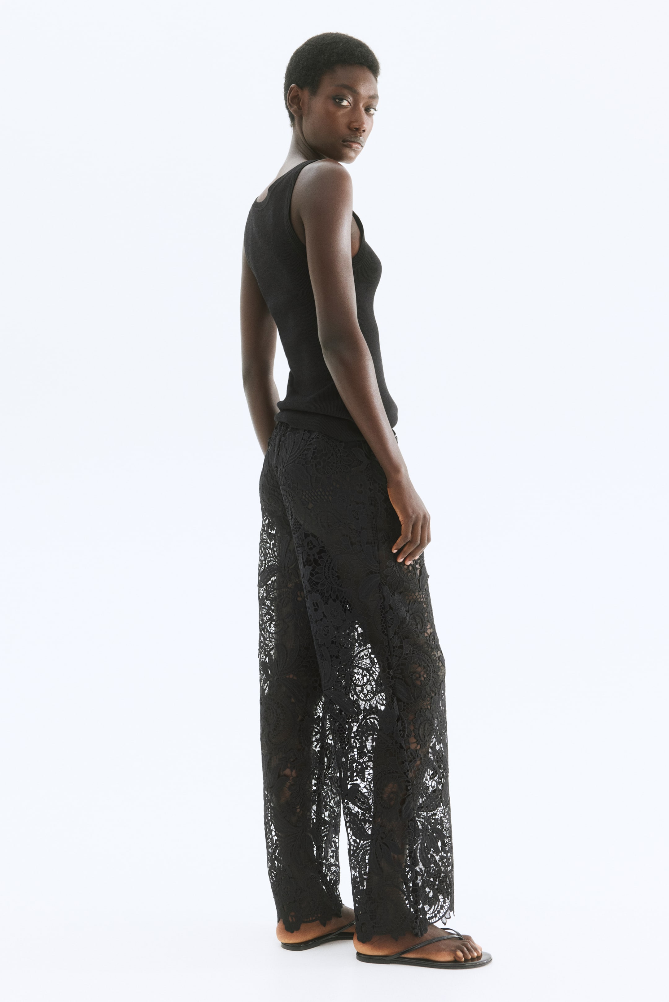 Pantaloni in pizzo con vita alta ed elasticizzata e bordi smerlati in fondo. Gamba ampia. Sfoderati.