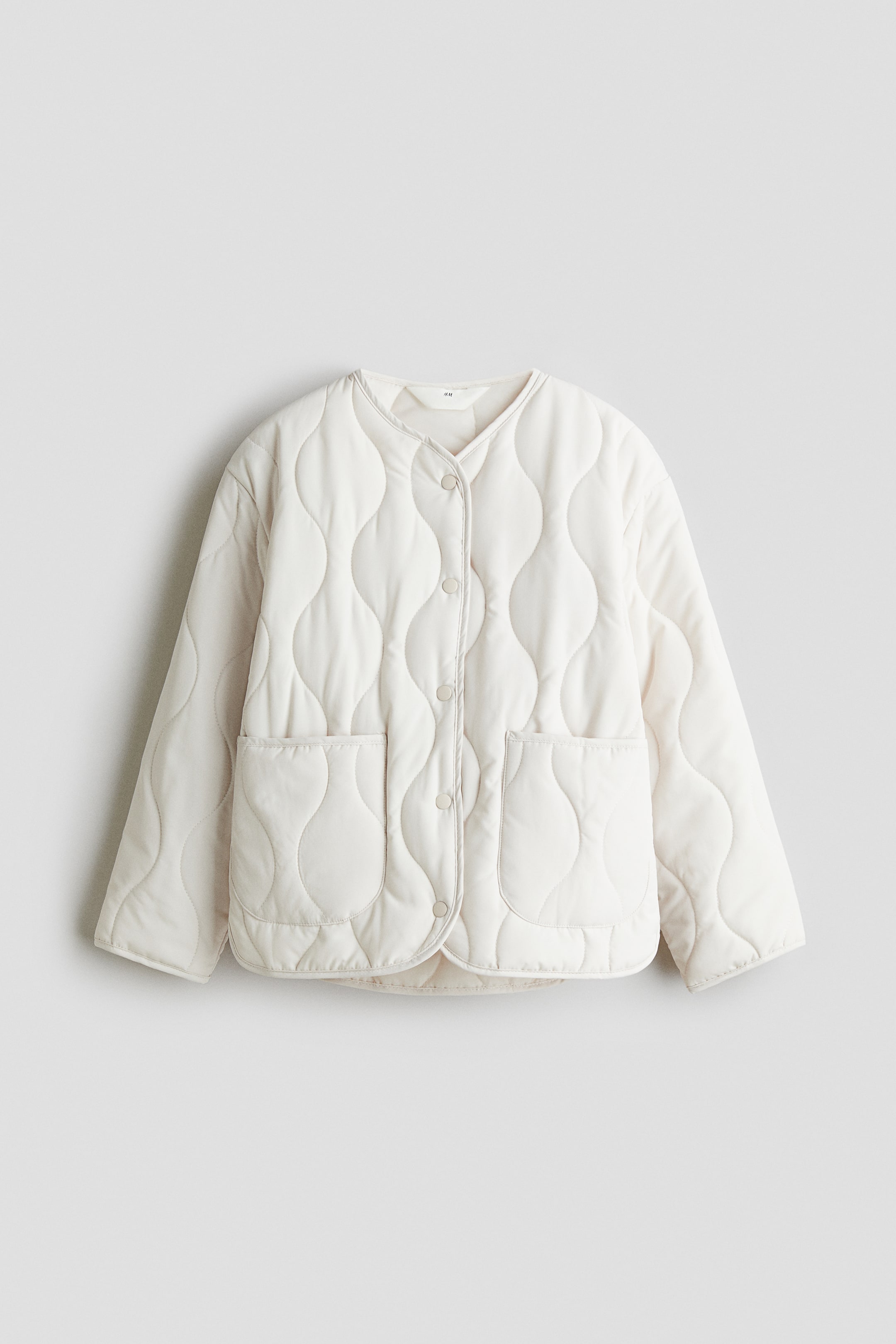 Giacca leggermente imbottita in morbido tessuto trapuntato con profili lungo i bordi. Scollo a V e bottoni automatici davanti. Tasche davanti applicate, bordo arrotondato in basso con spacchetti laterali. Foderata.