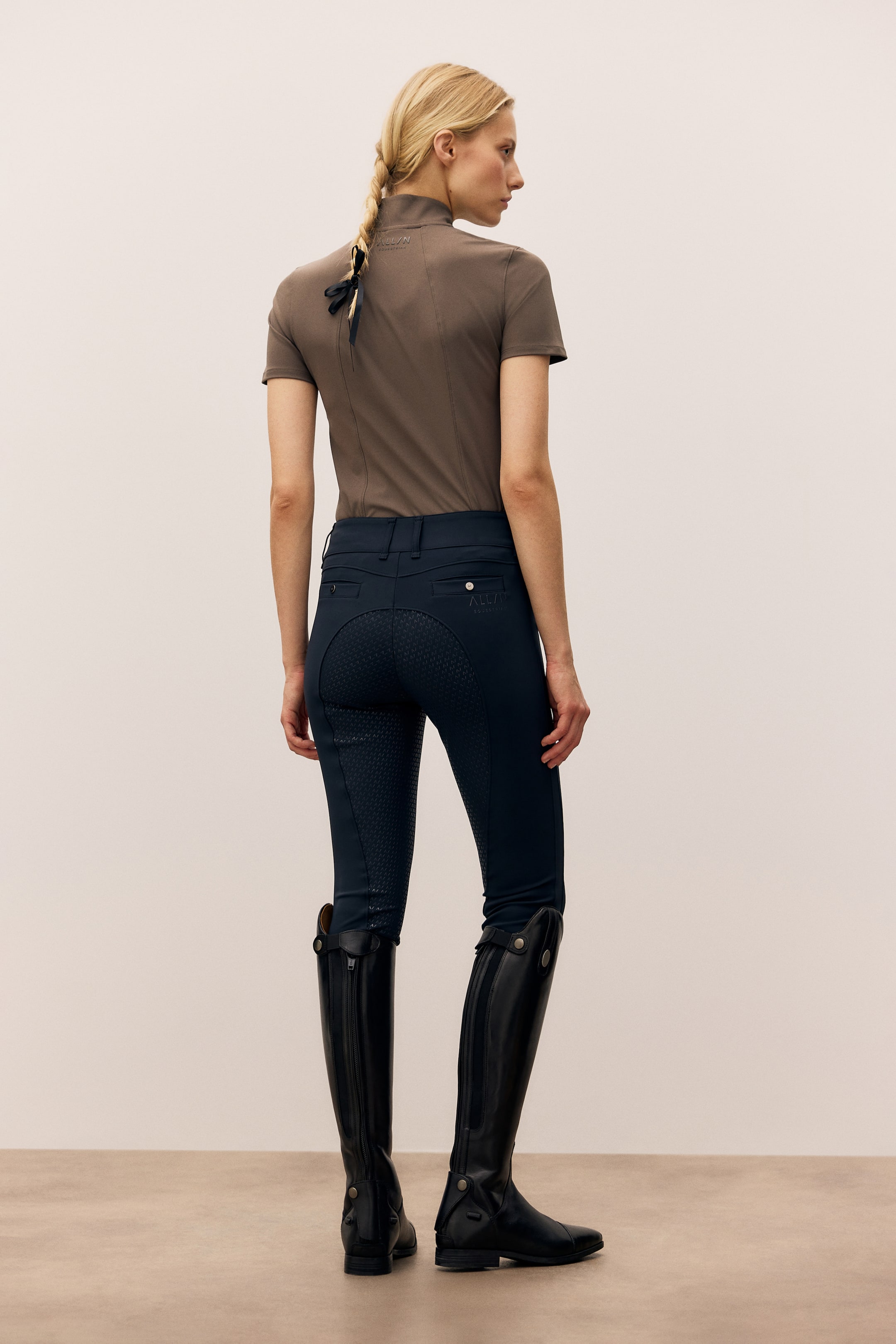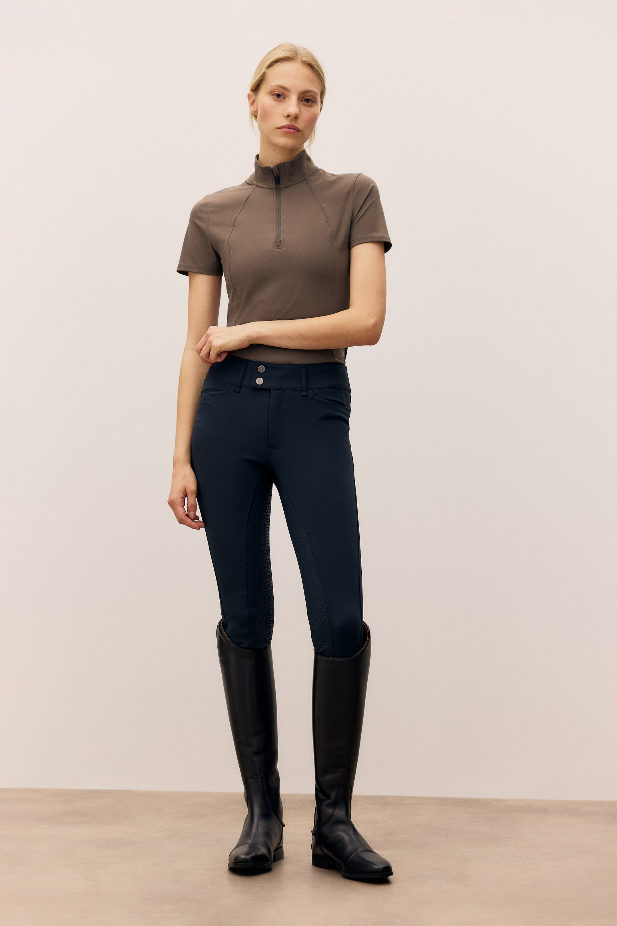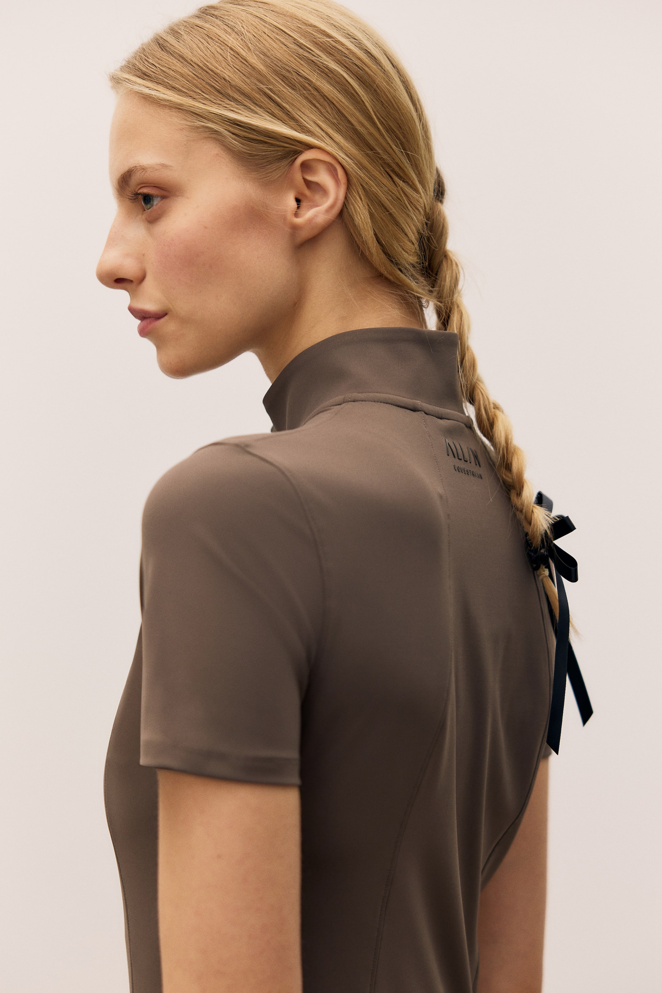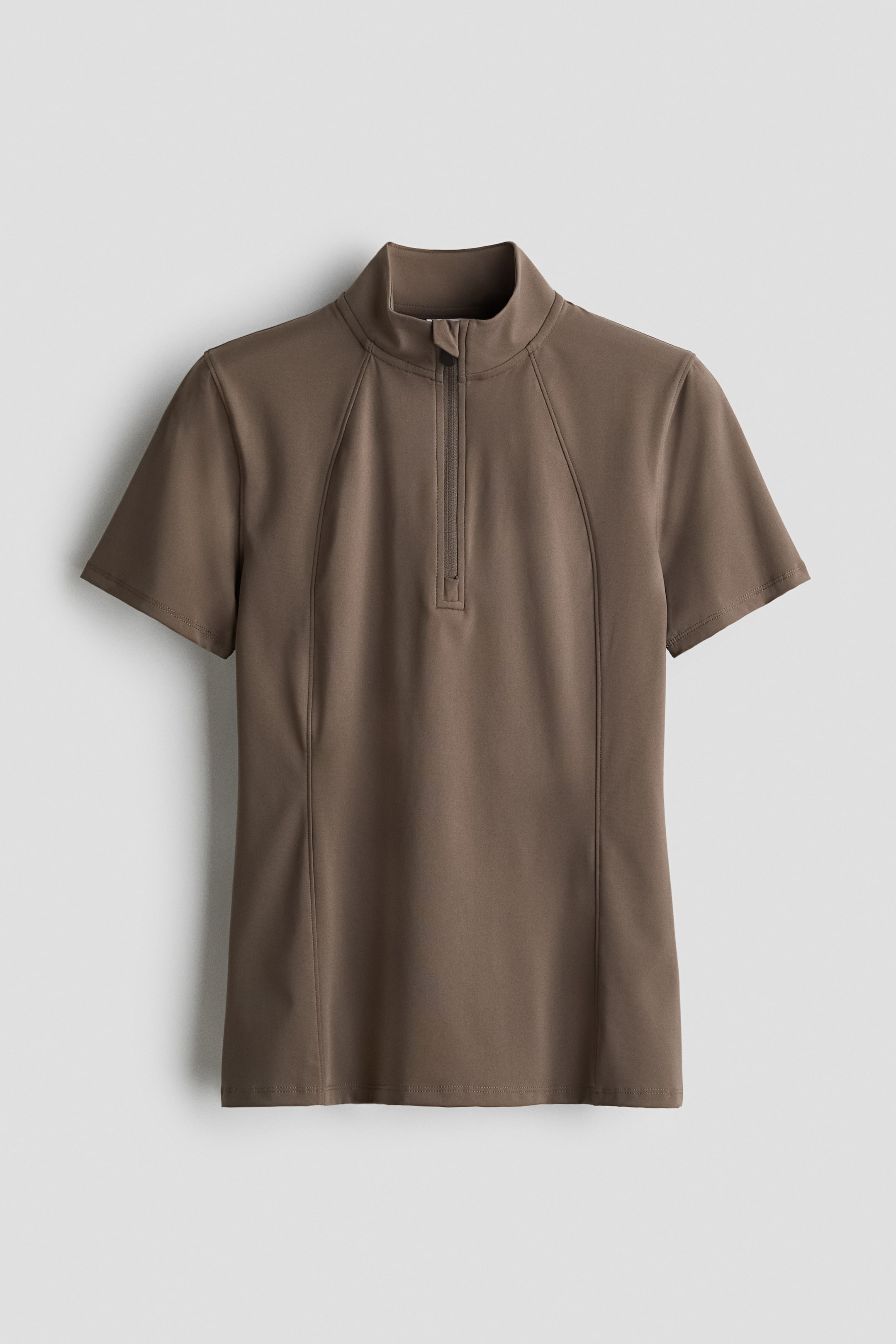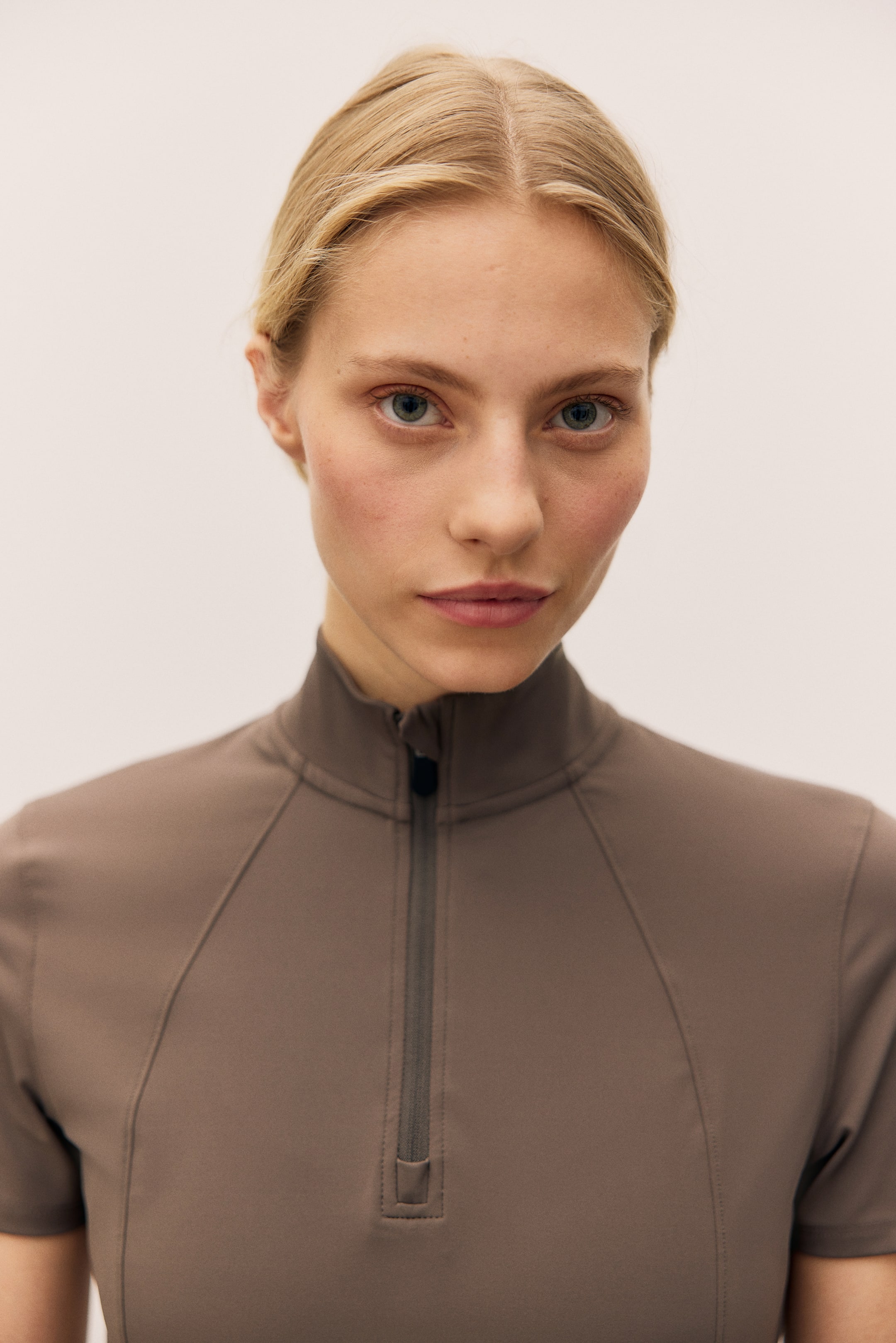 Top sportivo a maniche corte in jersey traspirante ad asciugatura rapida. Collo alto con mezza cerniera e mentoniera antigraffio, cuciture a vista davanti.