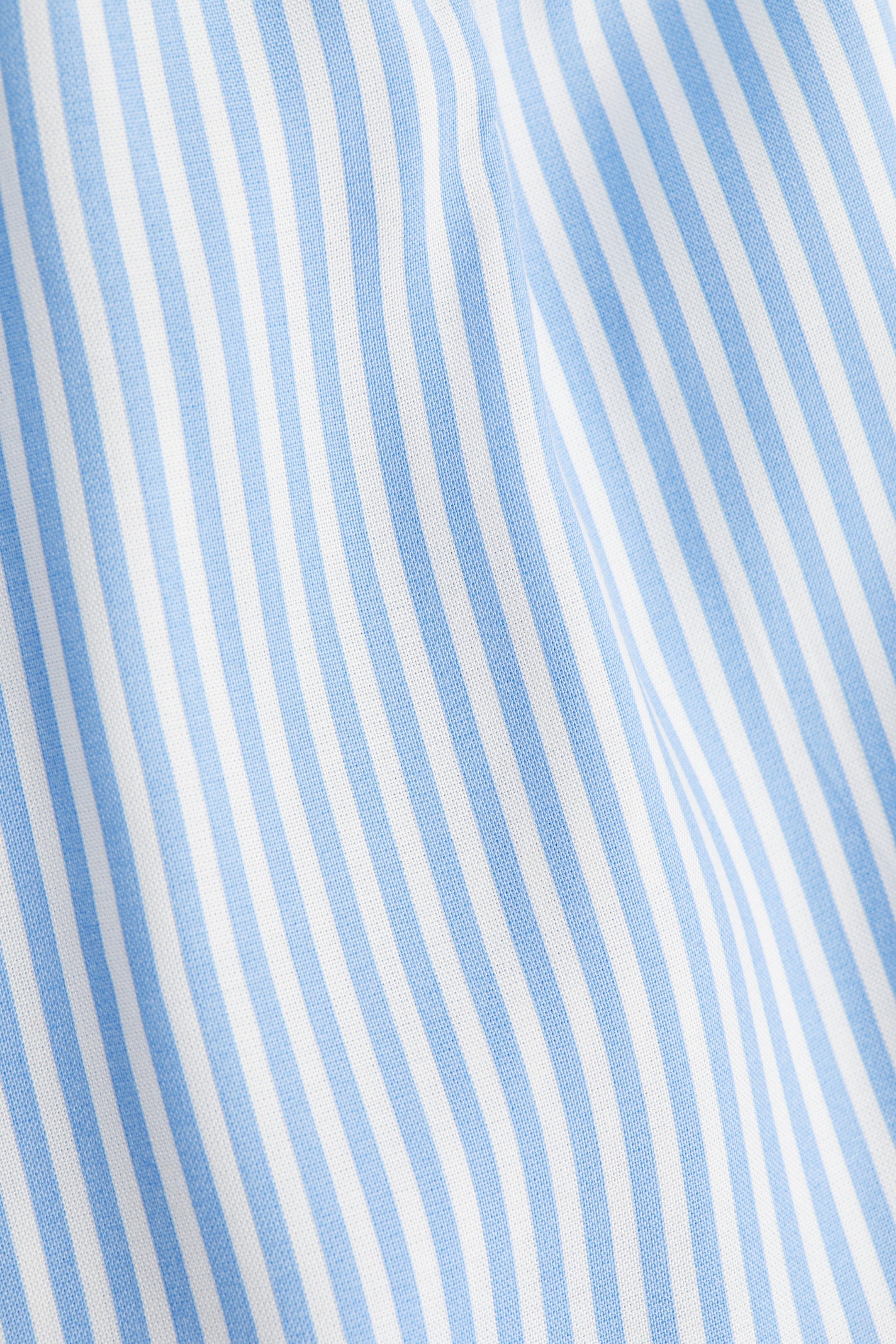 Tuta corta in tessuto di viscosa. Scollo squadrato, spalline ampie con bordo a volant. Ampi nastri da annodare dietro, elastico rivestito in vita.