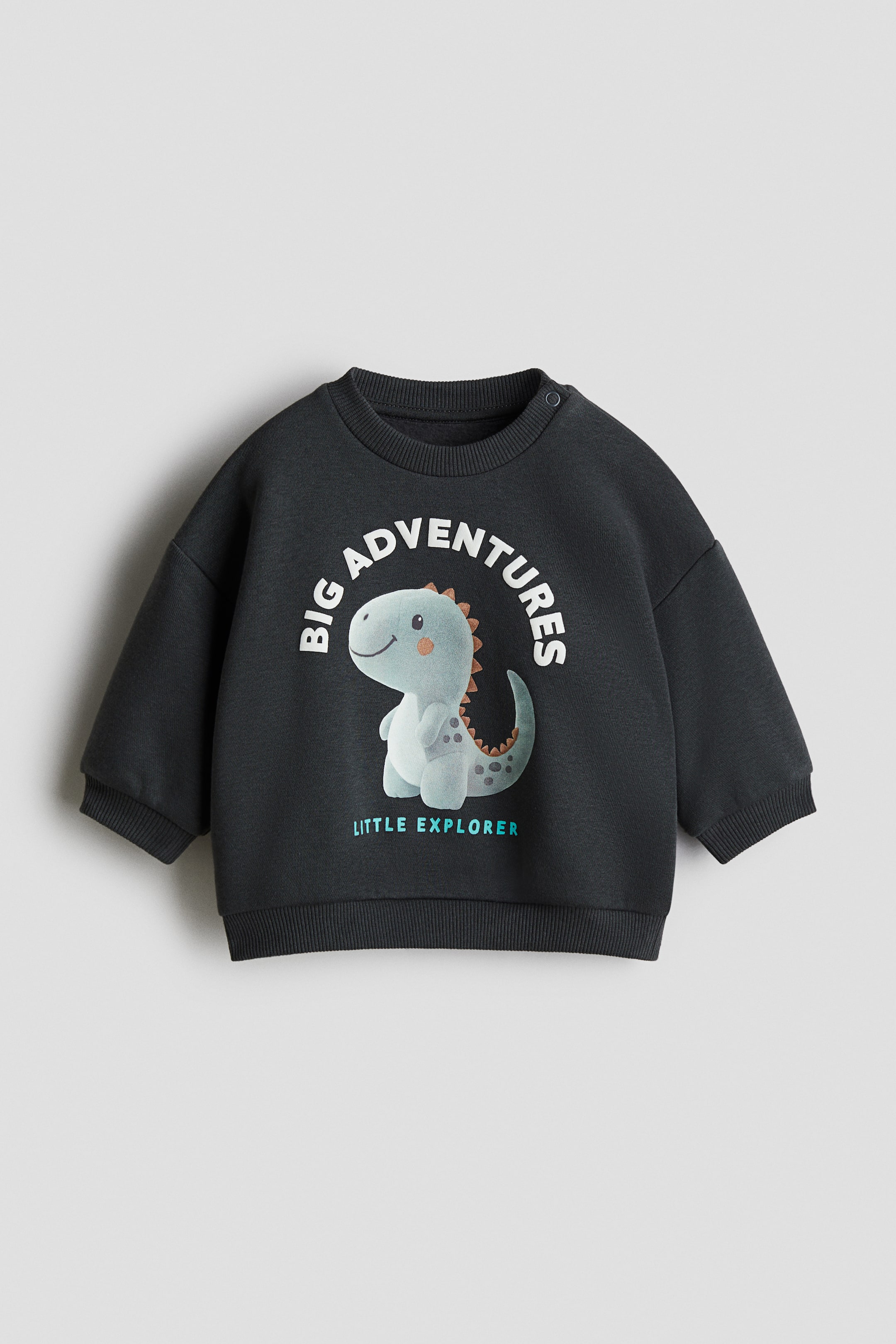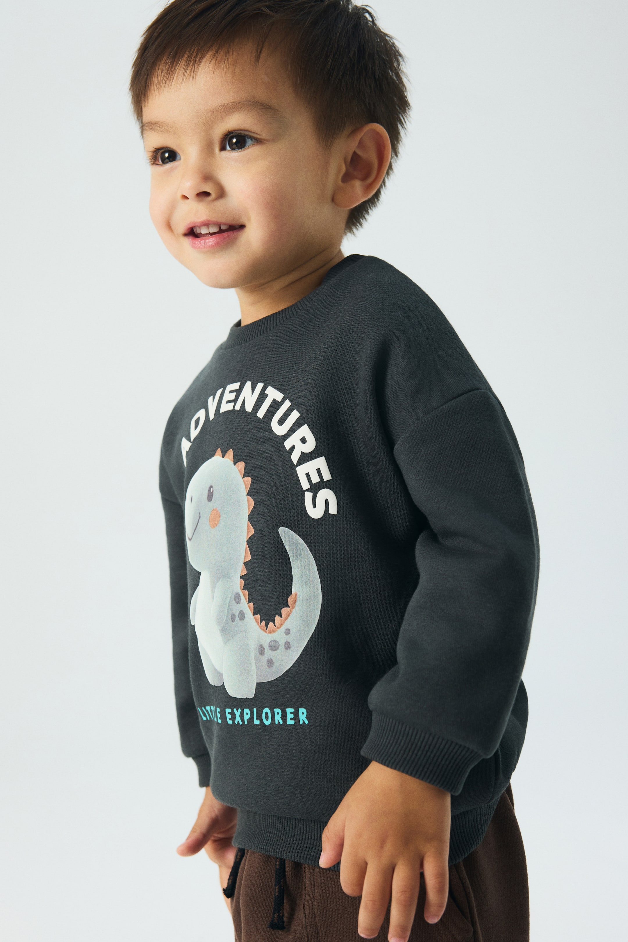 Maglia in tessuto felpato con morbido interno spazzolato e motivo davanti. Scollo rotondo con bordo a costine e bottoni automatici su un lato (tranne misure 98-104). Spalle bassissime, bordi a coste a fondo manica e in basso.