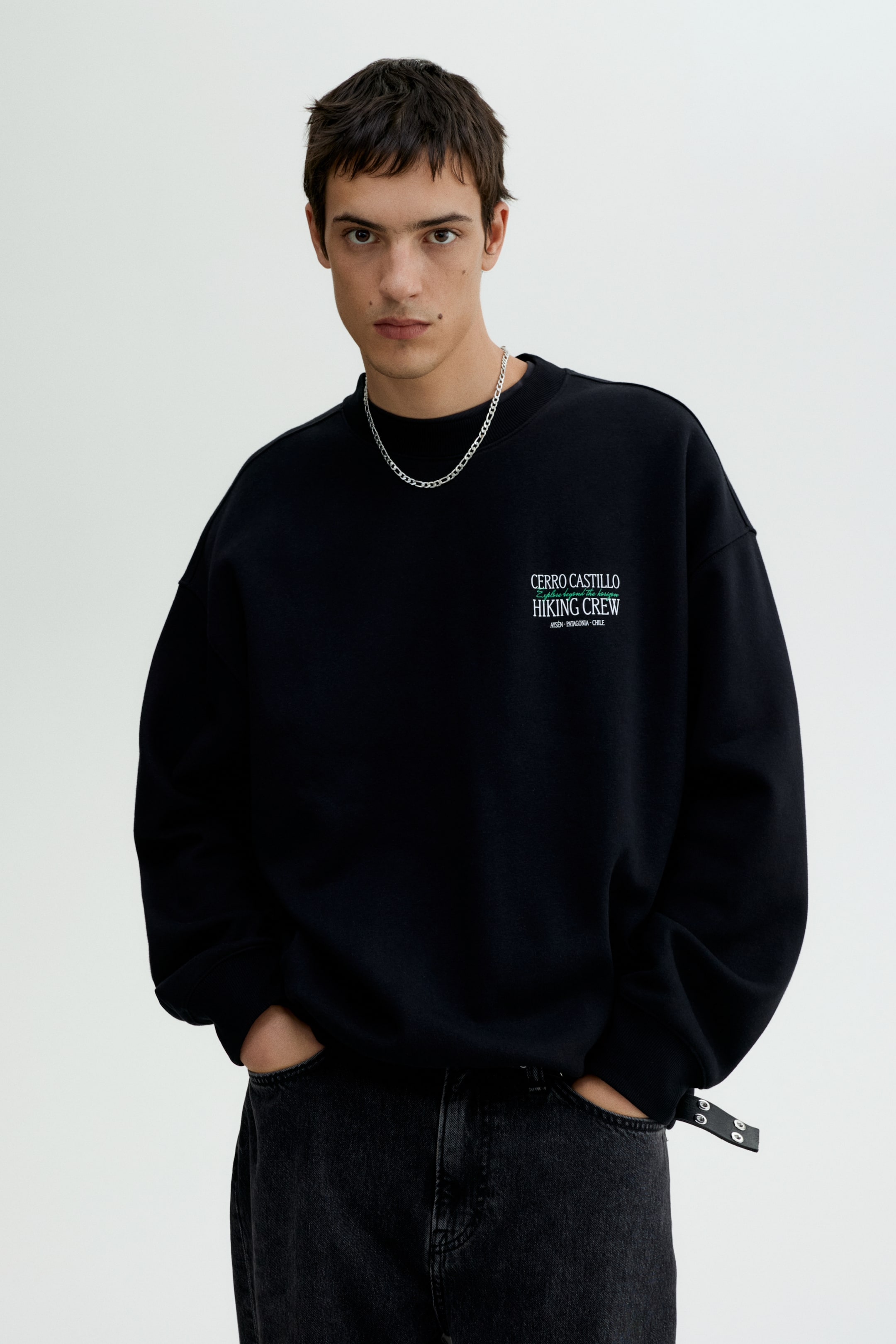 Maglia in tessuto felpato di misto cotone di peso medio con morbido interno spazzolato e motivi stampati. Spalle basse, scollo, polsini e bordo inferiore a costine. Linea ampia per una vestibilità comoda ma non oversize.