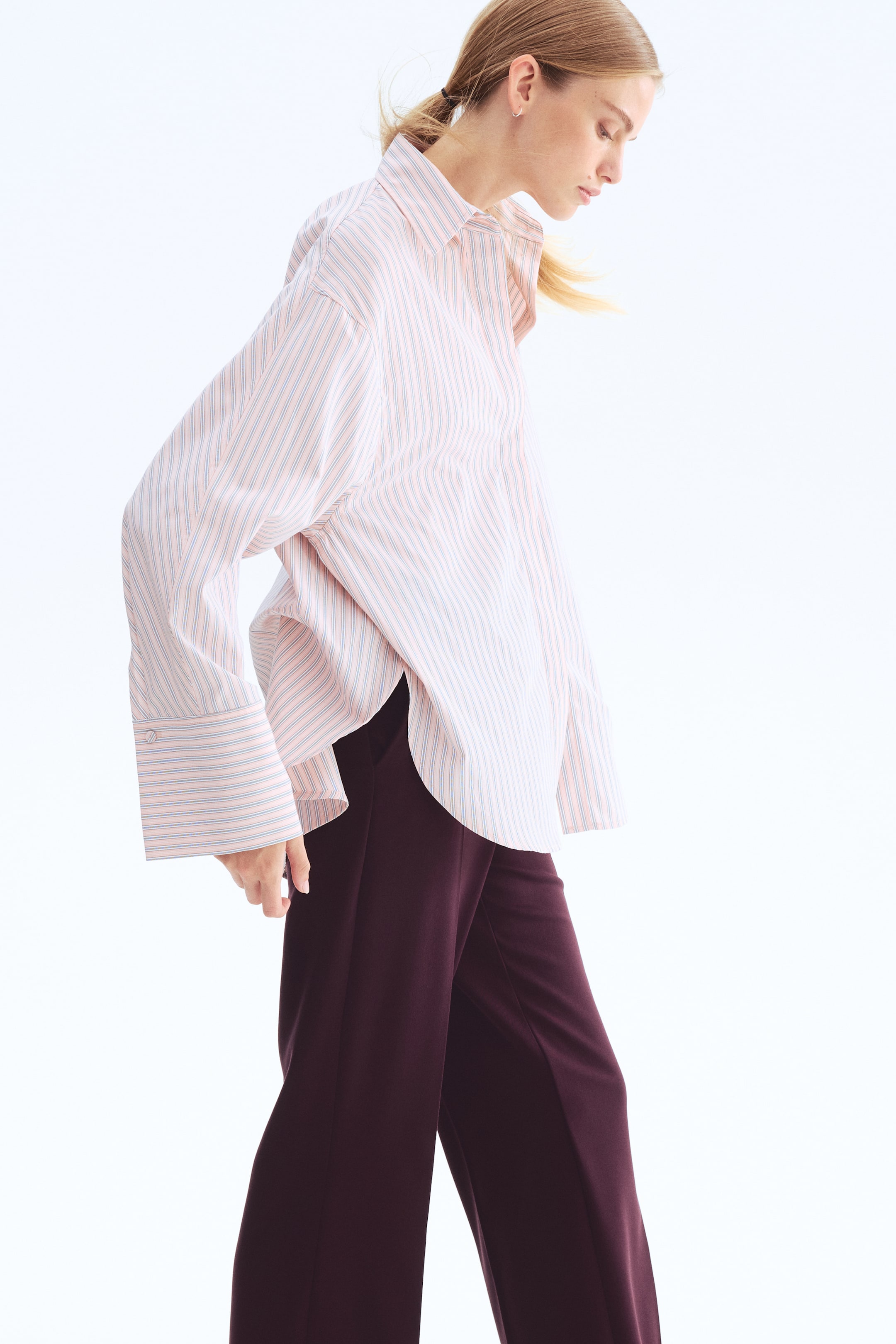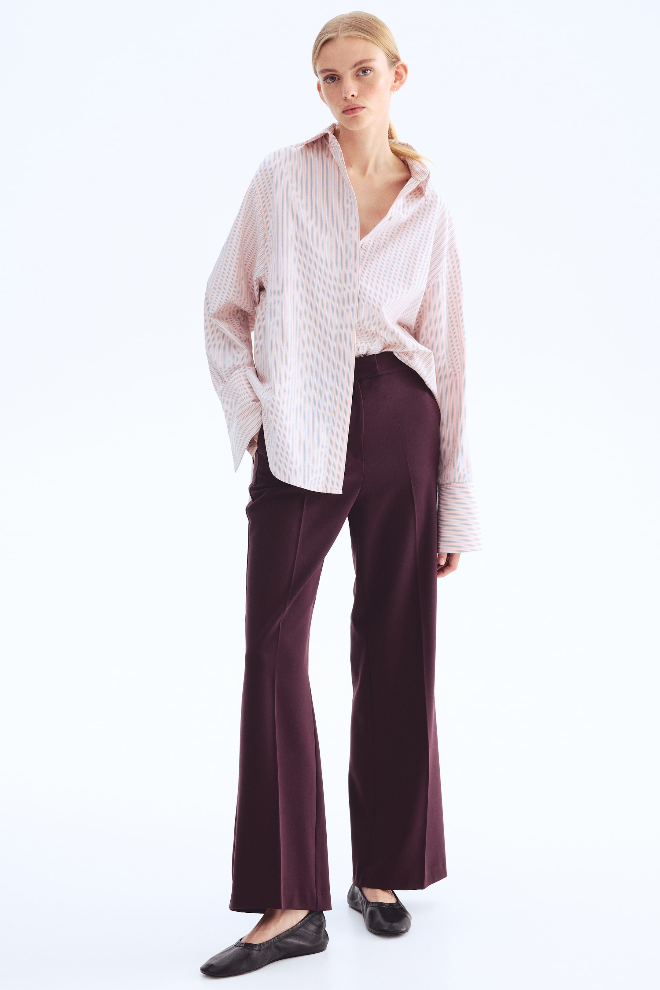 Pantaloni in tessuto. Patta con cerniera, girovita allungato con bottone e gancetto a barretta nascosti. Tasche laterali oblique, tasche dietro a doppio filetto. Gamba svasata in fondo con piega davanti e dietro.
