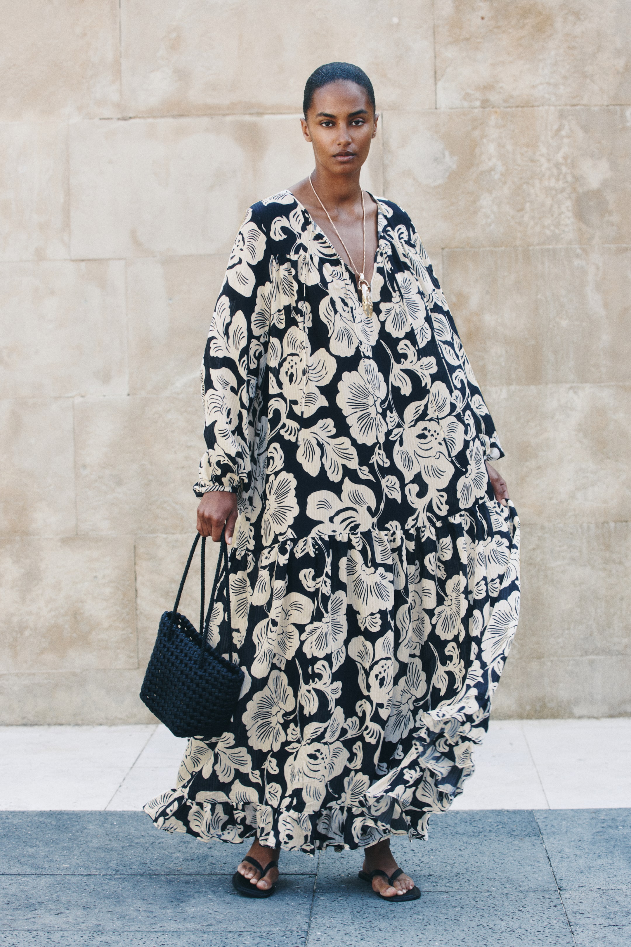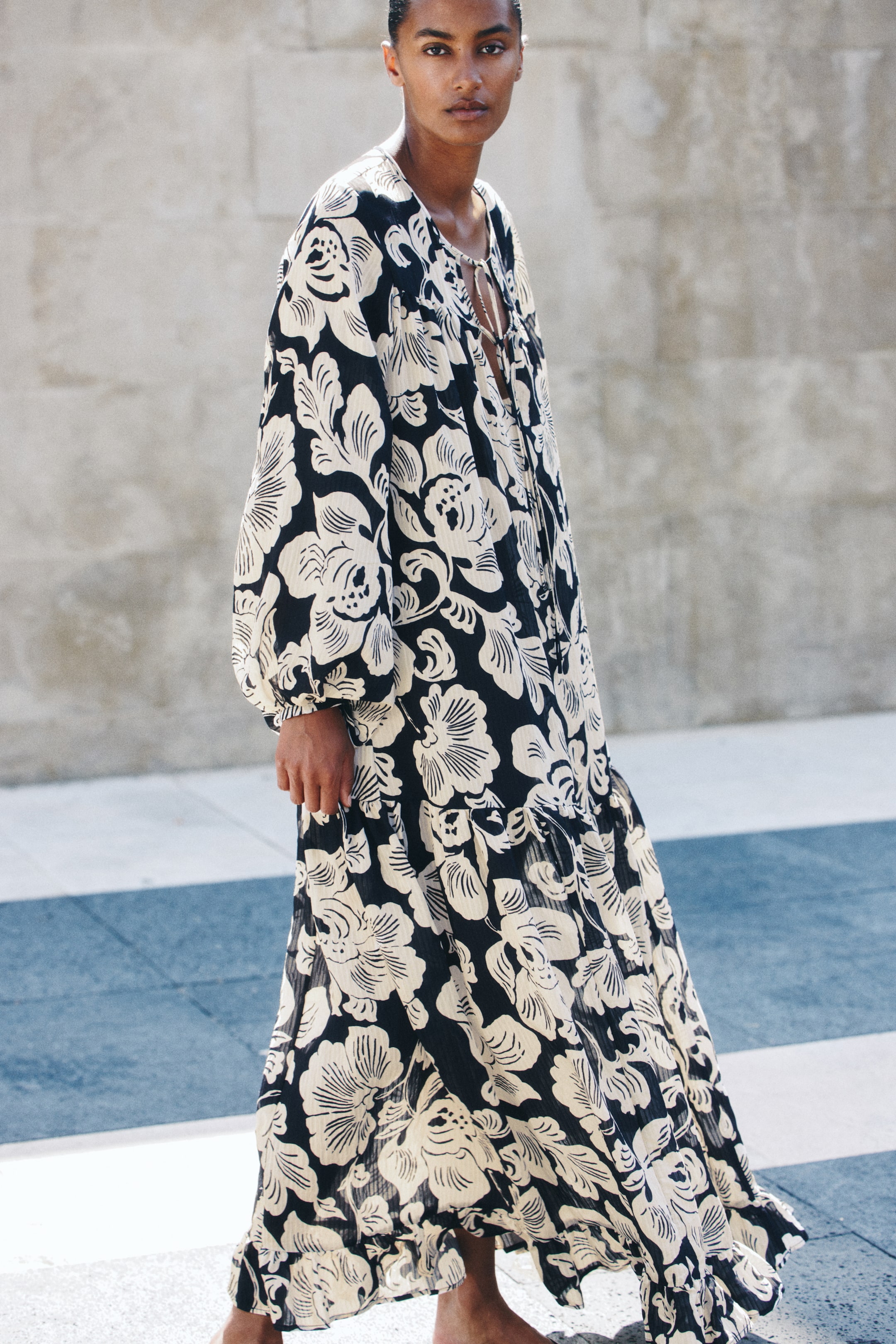 Abito lungo e oversize in tessuto leggero. Scollo rotondo, doppia apertura a goccia sul davanti, ciascuna con laccetti sottili in alto. Carré con arricciature davanti e dietro, maniche lunghe a palloncino con polsino basso con bottone. Cucitura arricciata sotto i fianchi e in basso per un maggior volume. Sfoderato.