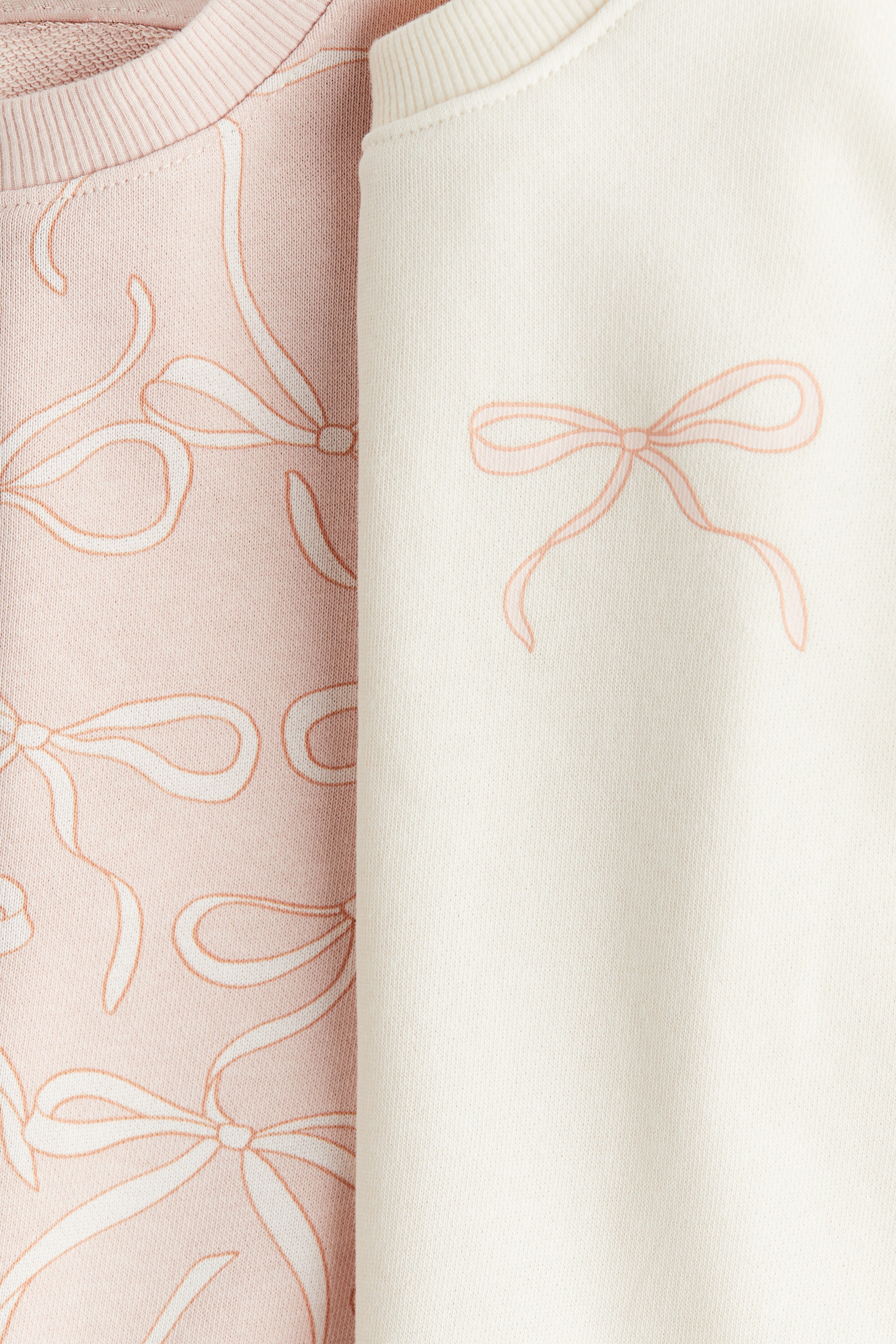 Maglie in leggero tessuto felpato con stampe dal design diverso. Scollo rotondo con bordo a costine, spalle basse con volant decorativo e maniche lunghe. Bordo a costine a fondo manica e in basso.