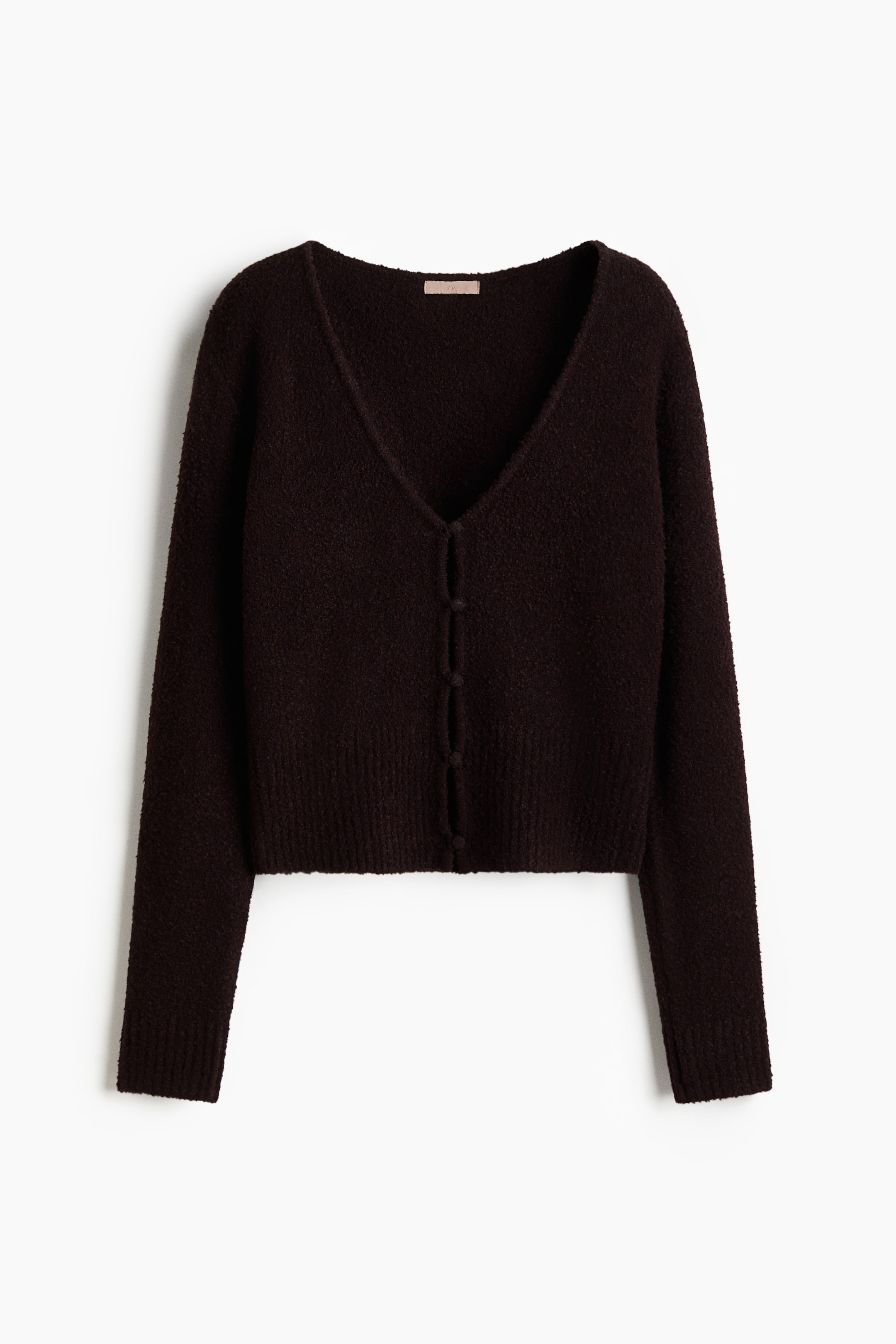 Cardigan in morbida maglia bouclé con scollo a V e bottoni rivestiti davanti. Alti bordi a coste a fondo manica e in basso.