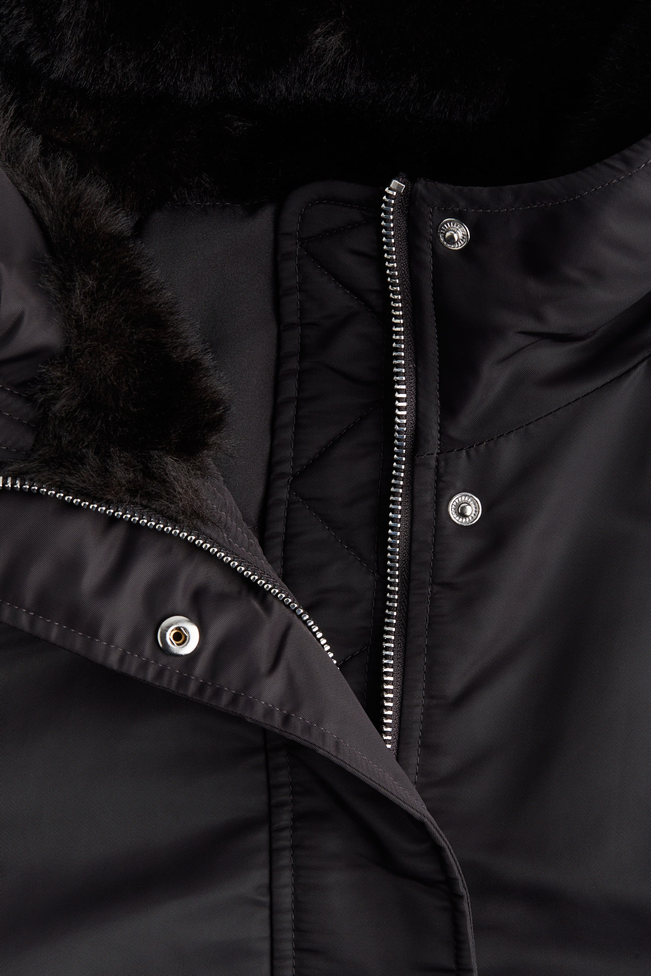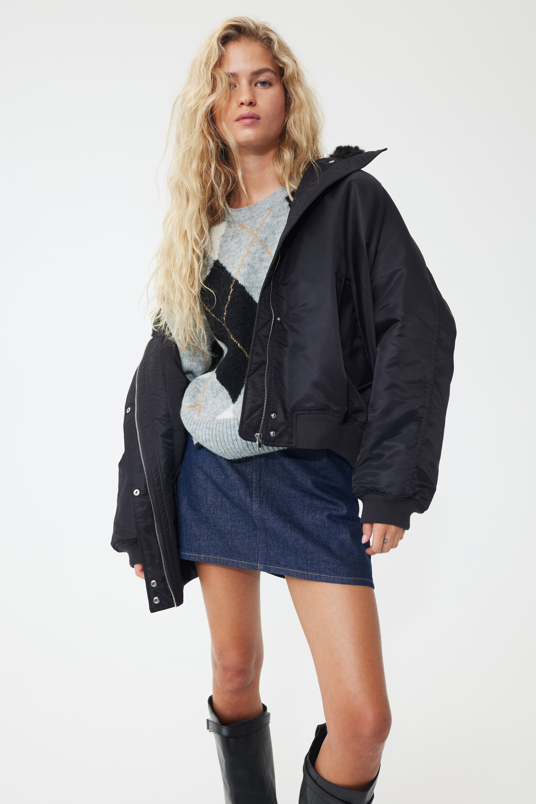 Bomber oversize e leggermente imbottito in nylon. Cappuccio con fodera pelosa, cerniera e patta antivento con bottoni automatici nascosti davanti. Tasche laterali con pattina e bottone automatico nascosto, maniche lunghe a raglan. Bordo a costine a fondo manica e in basso. Foderato.