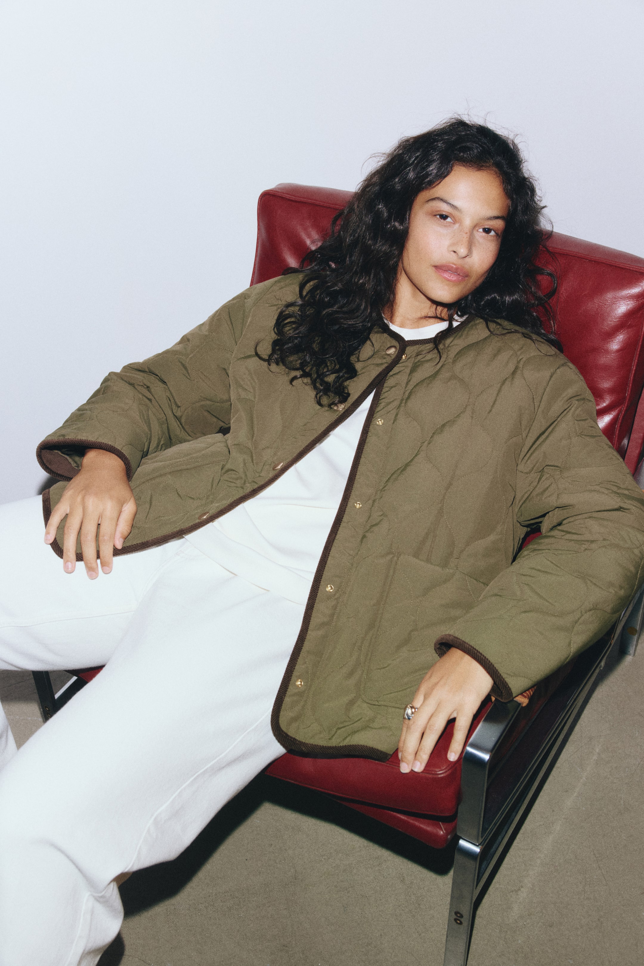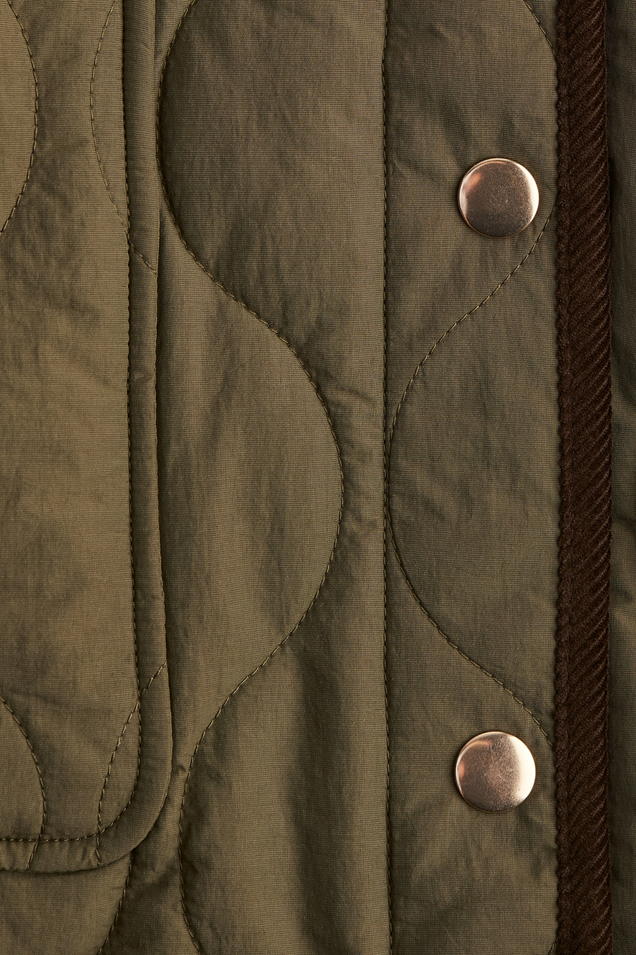 Giacca in tessuto trapuntato con bordi in velluto a coste. Scollo rotondo, bottoni automatici davanti. Tasche anteriori applicate. Linea dritta in basso, spacchetti laterali dai bordi arrotondati. Foderata.