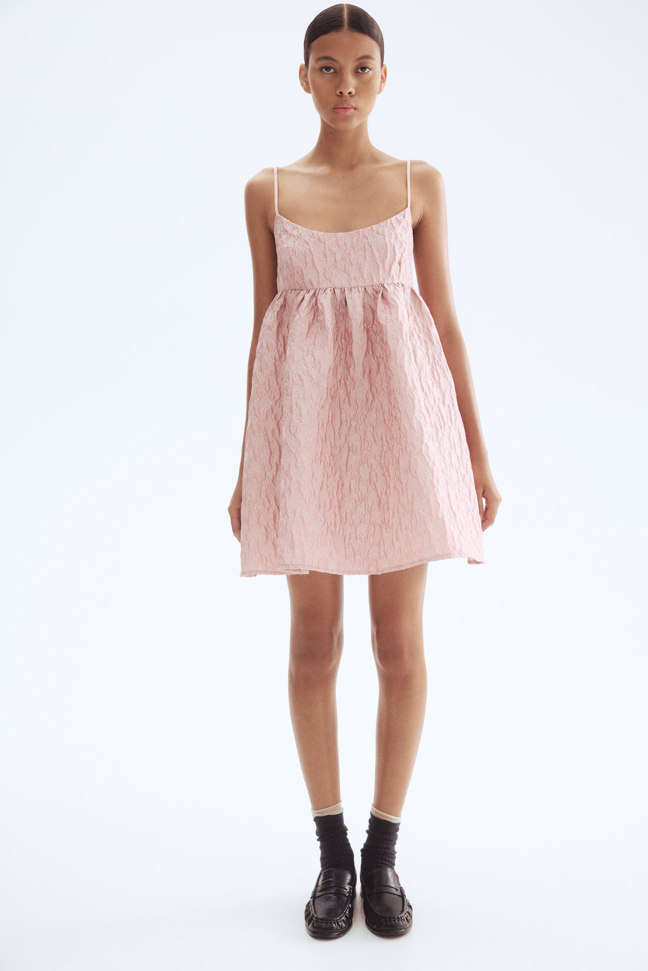 Abito corto in tessuto jacquard lucido. Spalline sottilissime e regolabili, corpetto aderente e chiusura con cerniera nascosta e gancetto su un lato. Cucitura arricciata sotto il seno e gonna svasata. Fodera in satin in alto.
