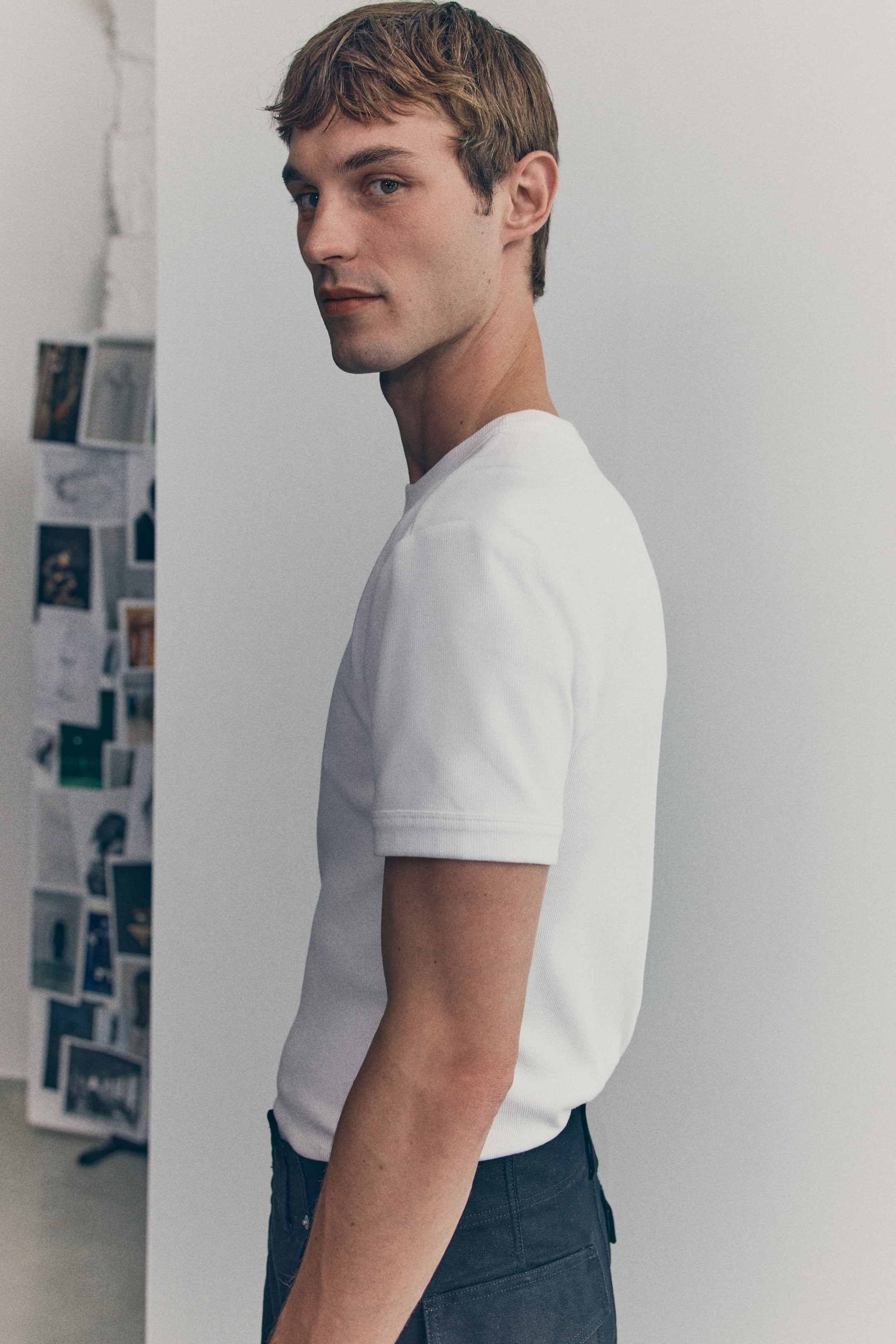 T-shirt in jersey di cotone pesante a costine. Scollo rotondo e bordo a costine sullo scollo e sul giromanica. Cuciture laterali ritorte. Vestibilità aderente. Bordo dritto in basso.