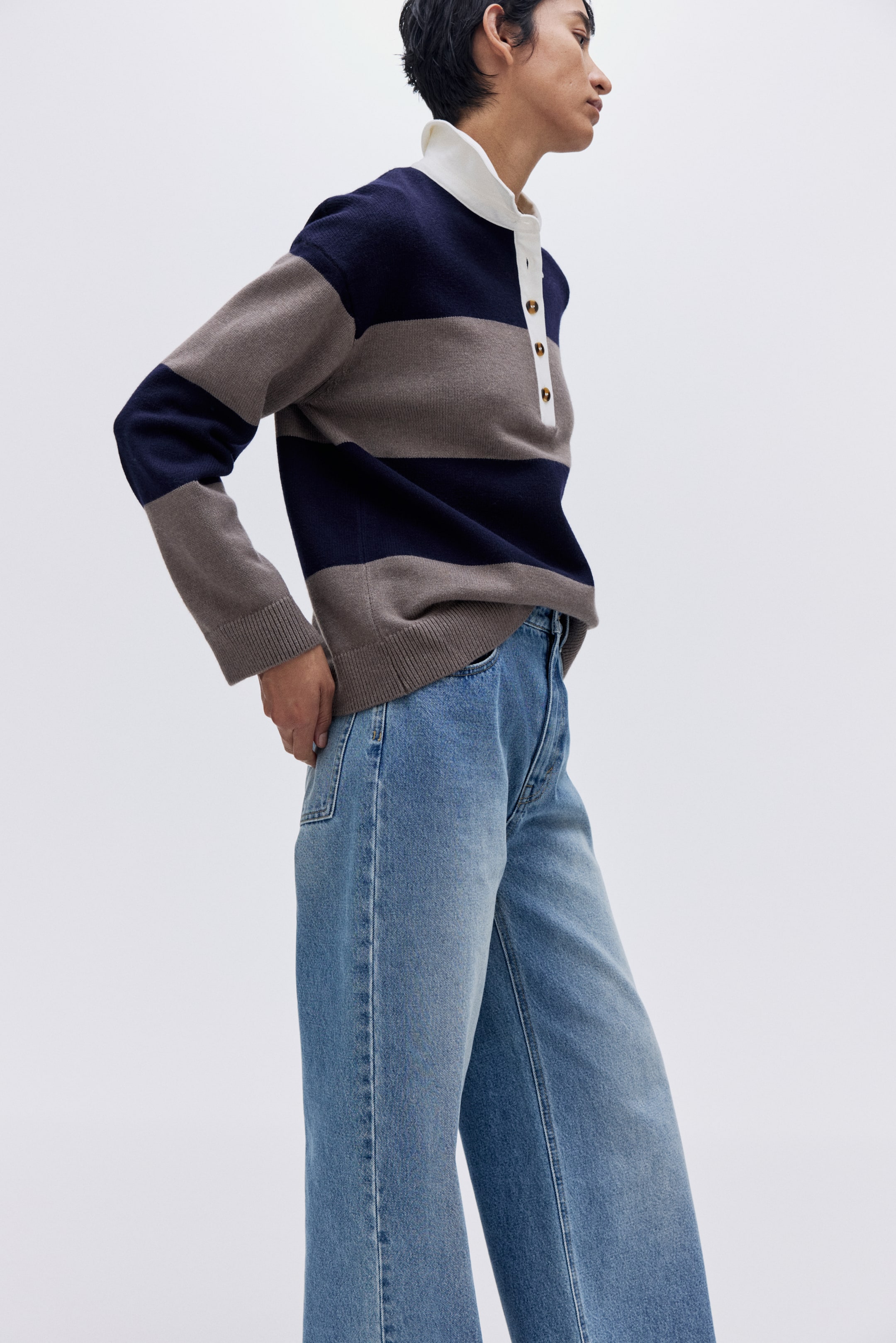 Pullover ampio in morbida maglia con colletto e bottoniera in twill di cotone. Spalle basse, maniche lunghe. Bordo a costine a fondo manica e in basso.