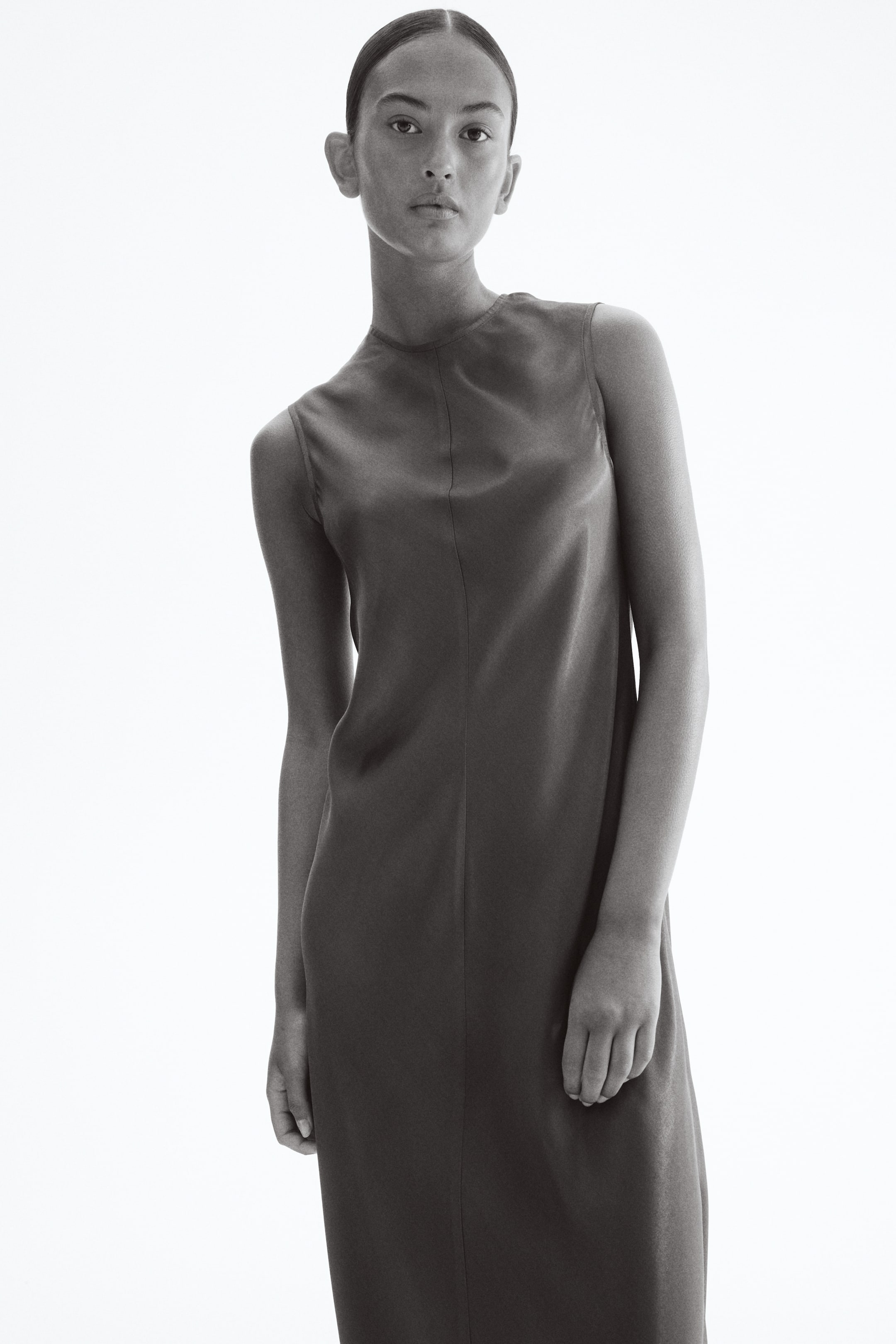 Abito lungo e smanicato in tessuto semilucido. Scollo arrotondato, cerniera nascosta dietro. Sfoderato.