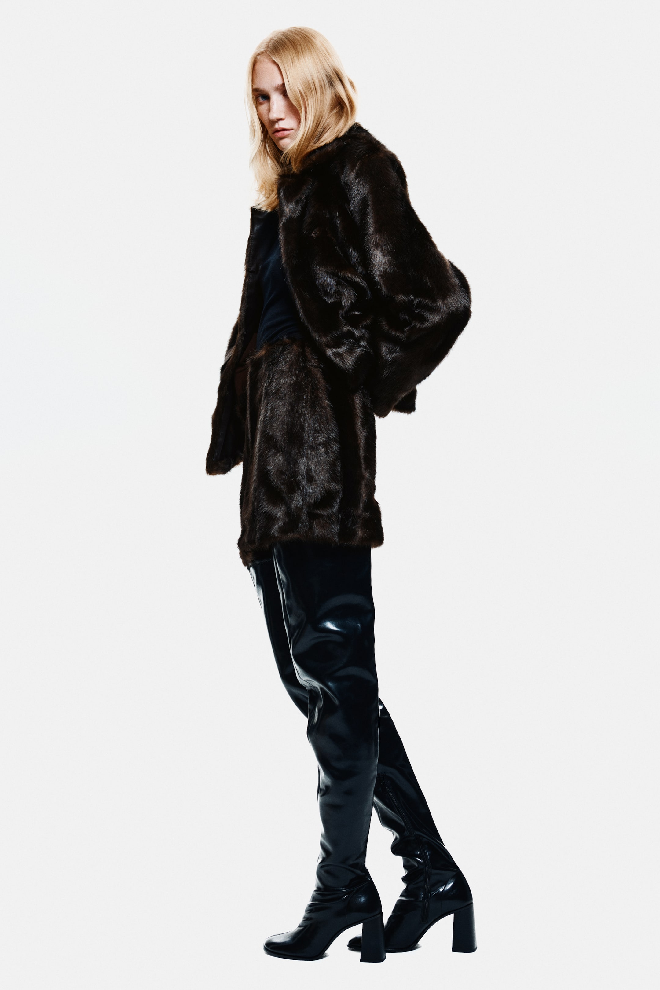 Minigonna in tessuto morbido e peloso. Vita normale con cerniera e gancetto nascosti dietro. Foderata.