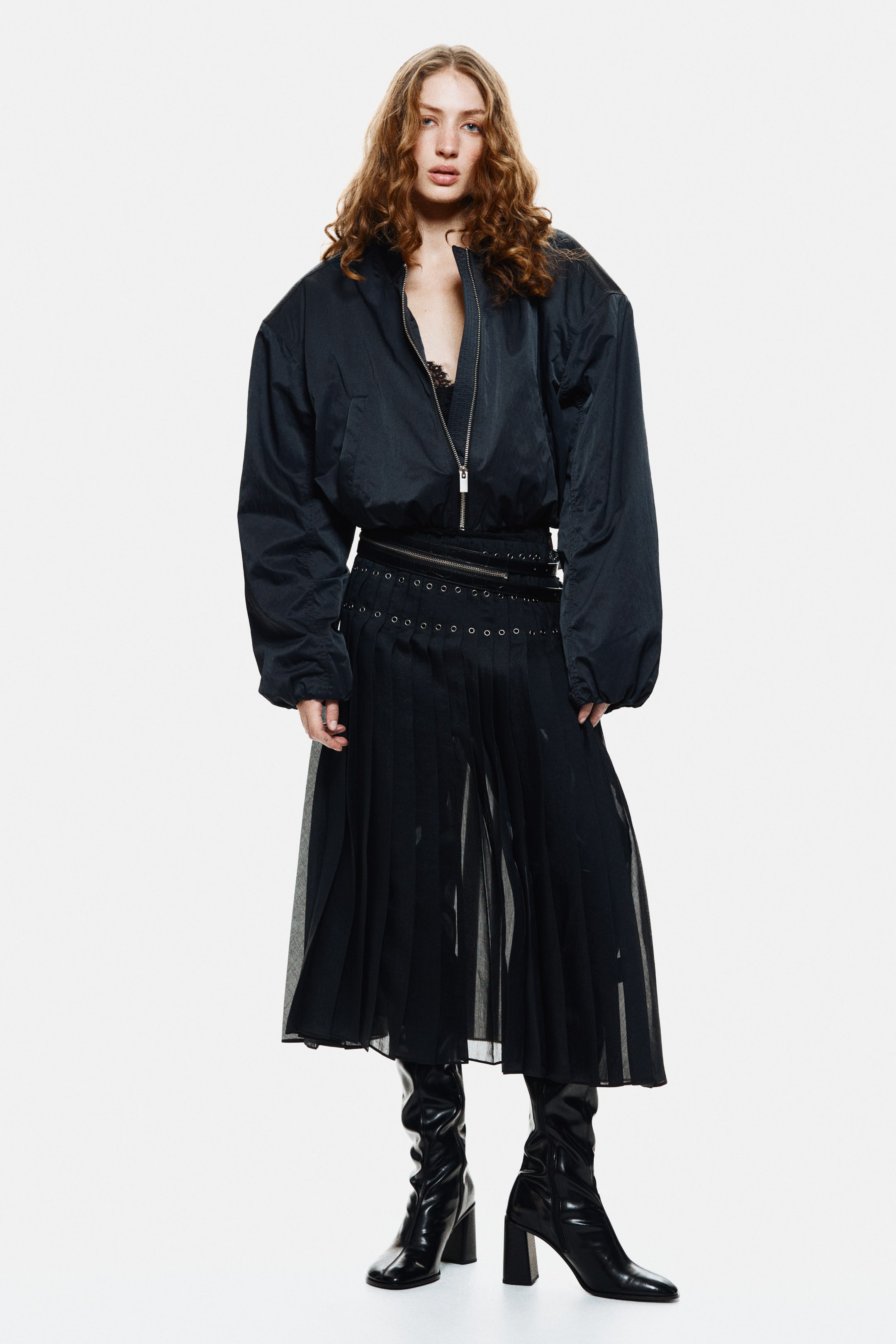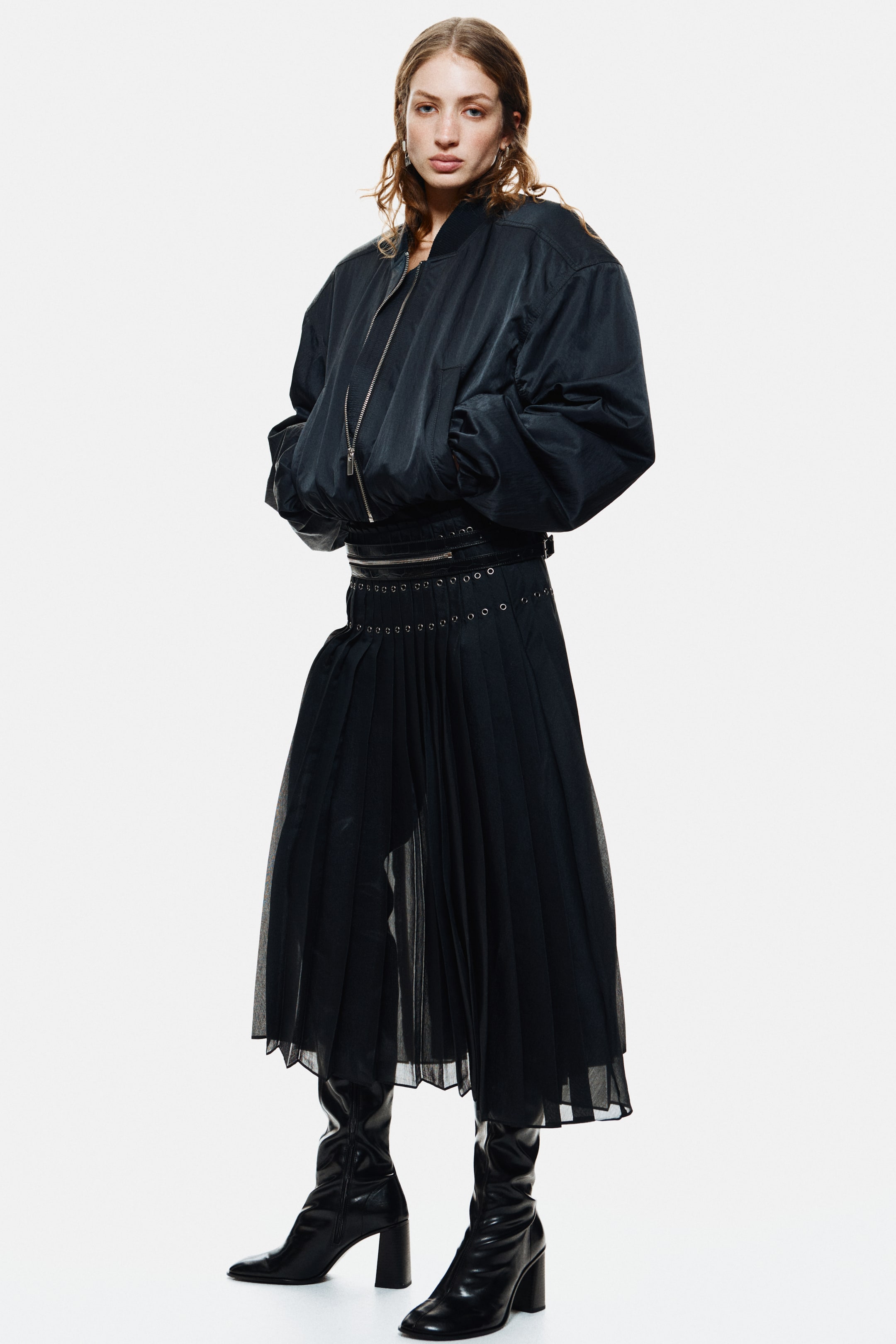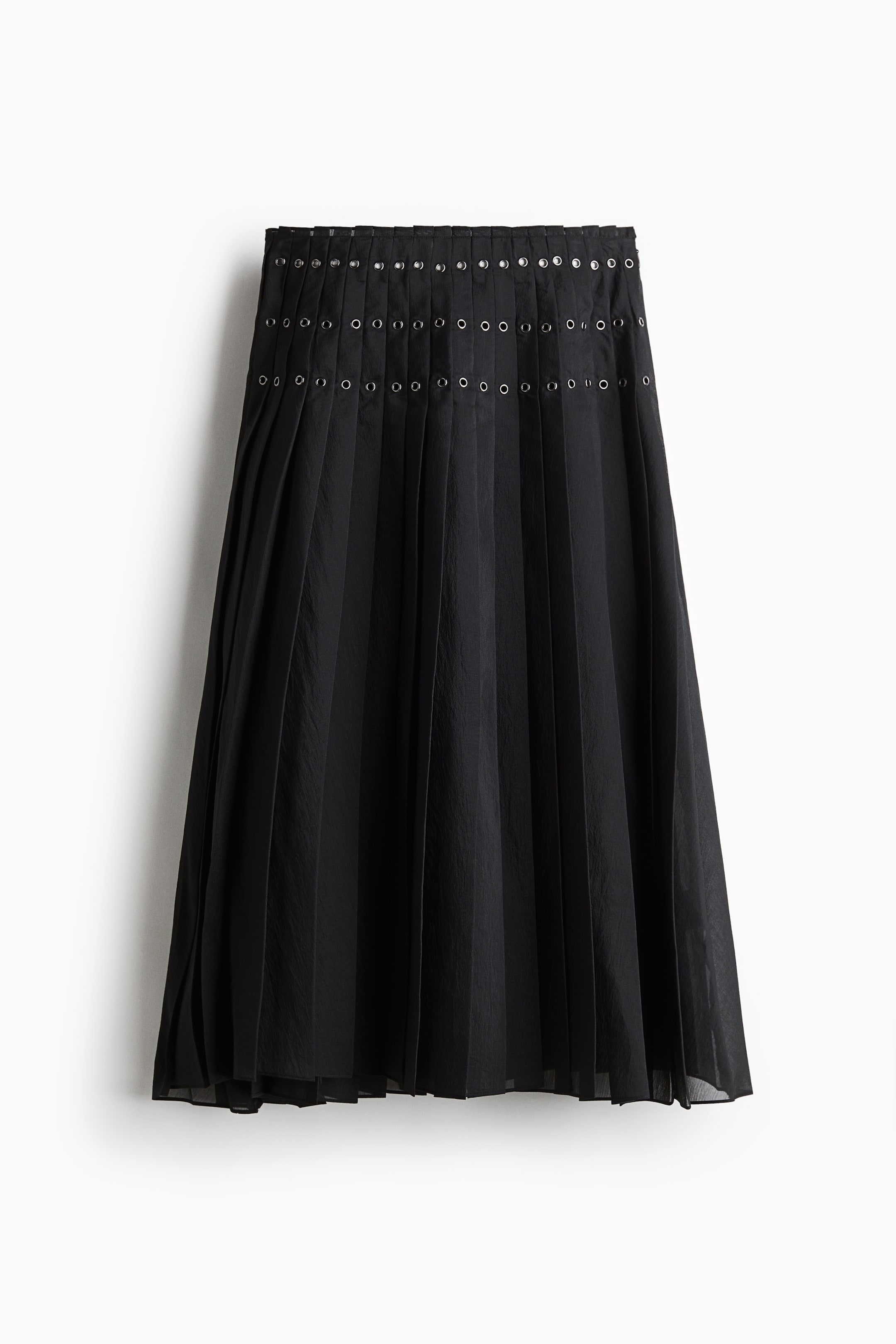 Gonna svasata in chiffon plissettato, lunghezza al polpaccio. Vita normale con tre file di occhielli in metallo. Cerniera nascosta su un lato. Foderata.