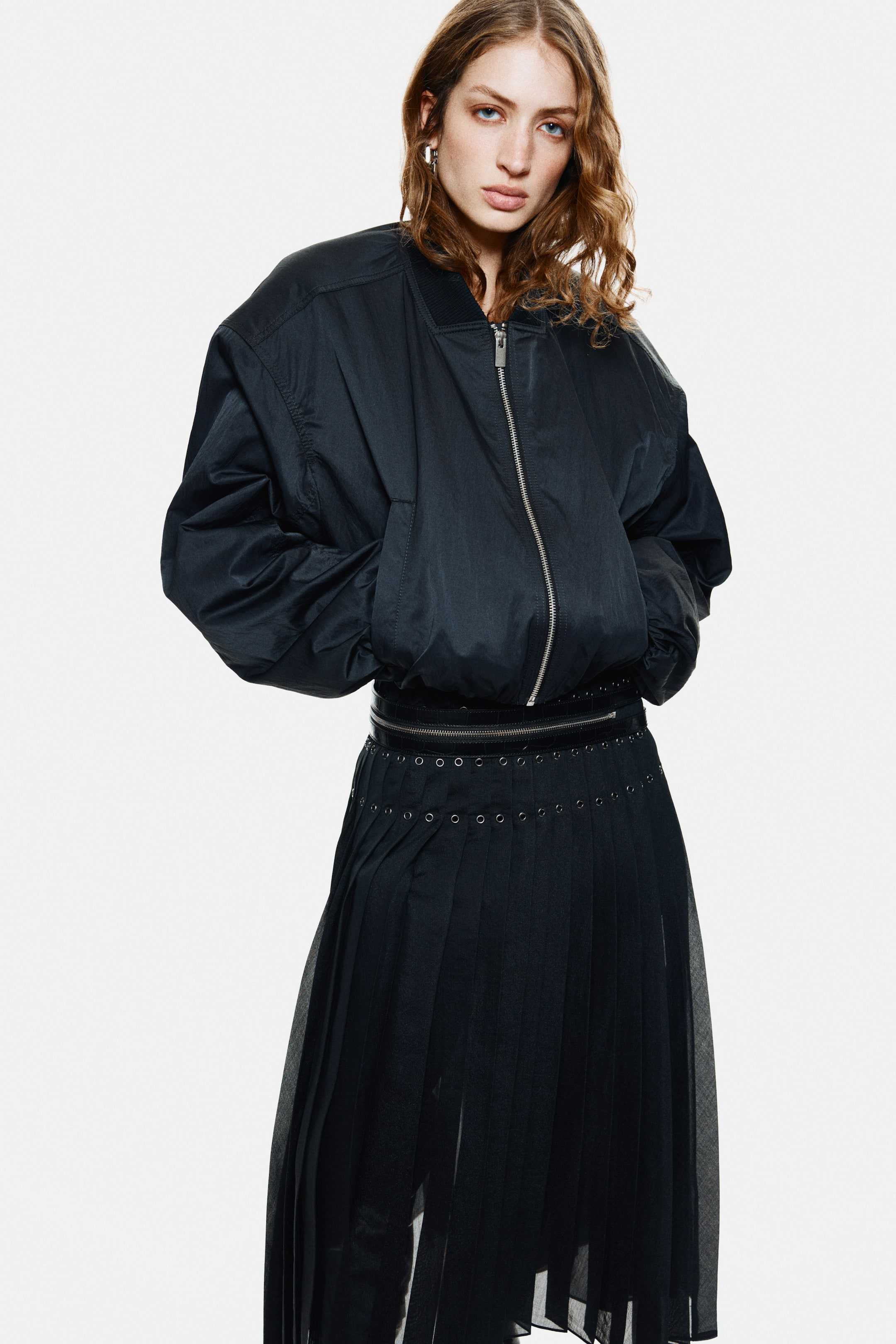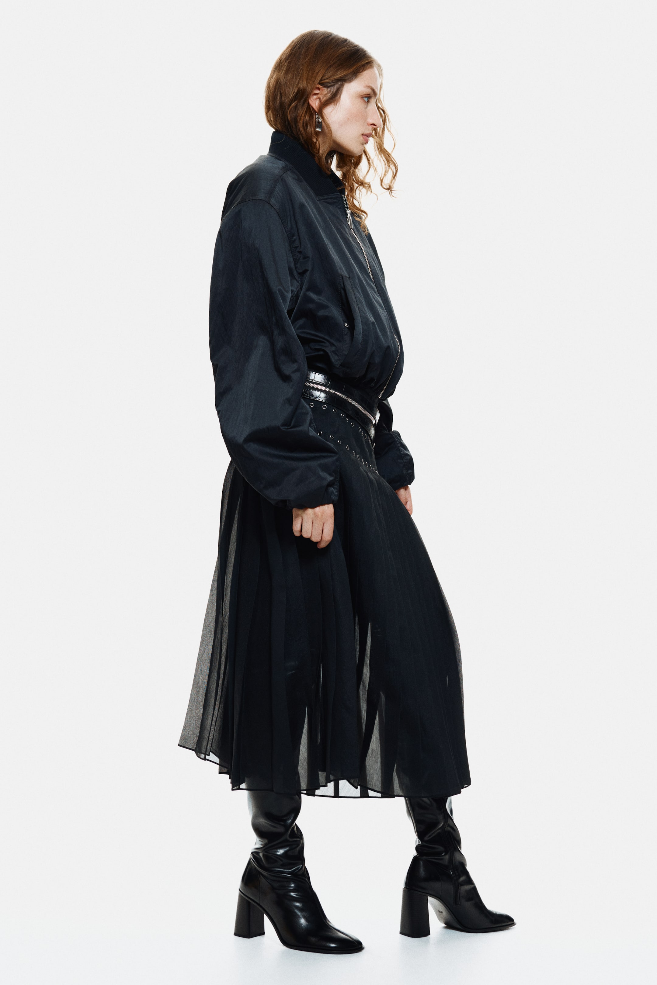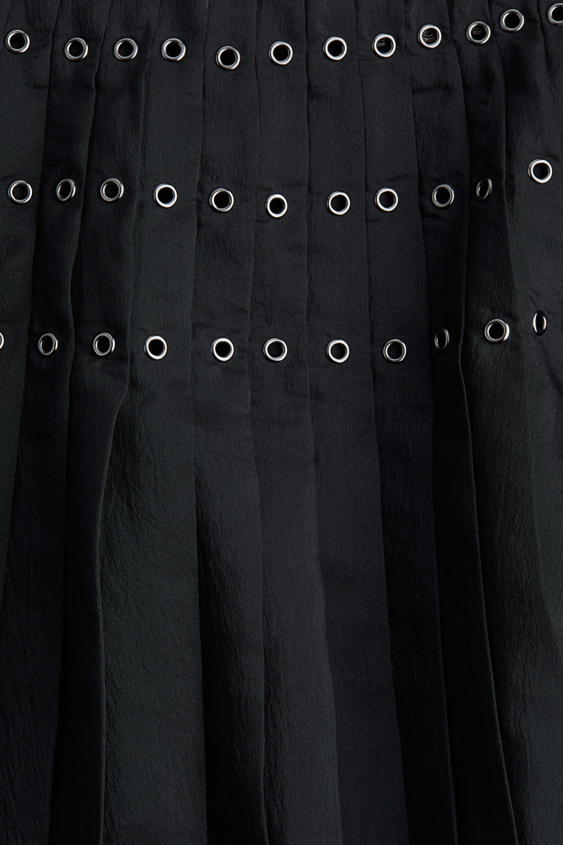 Gonna svasata in chiffon plissettato, lunghezza al polpaccio. Vita normale con tre file di occhielli in metallo. Cerniera nascosta su un lato. Foderata.