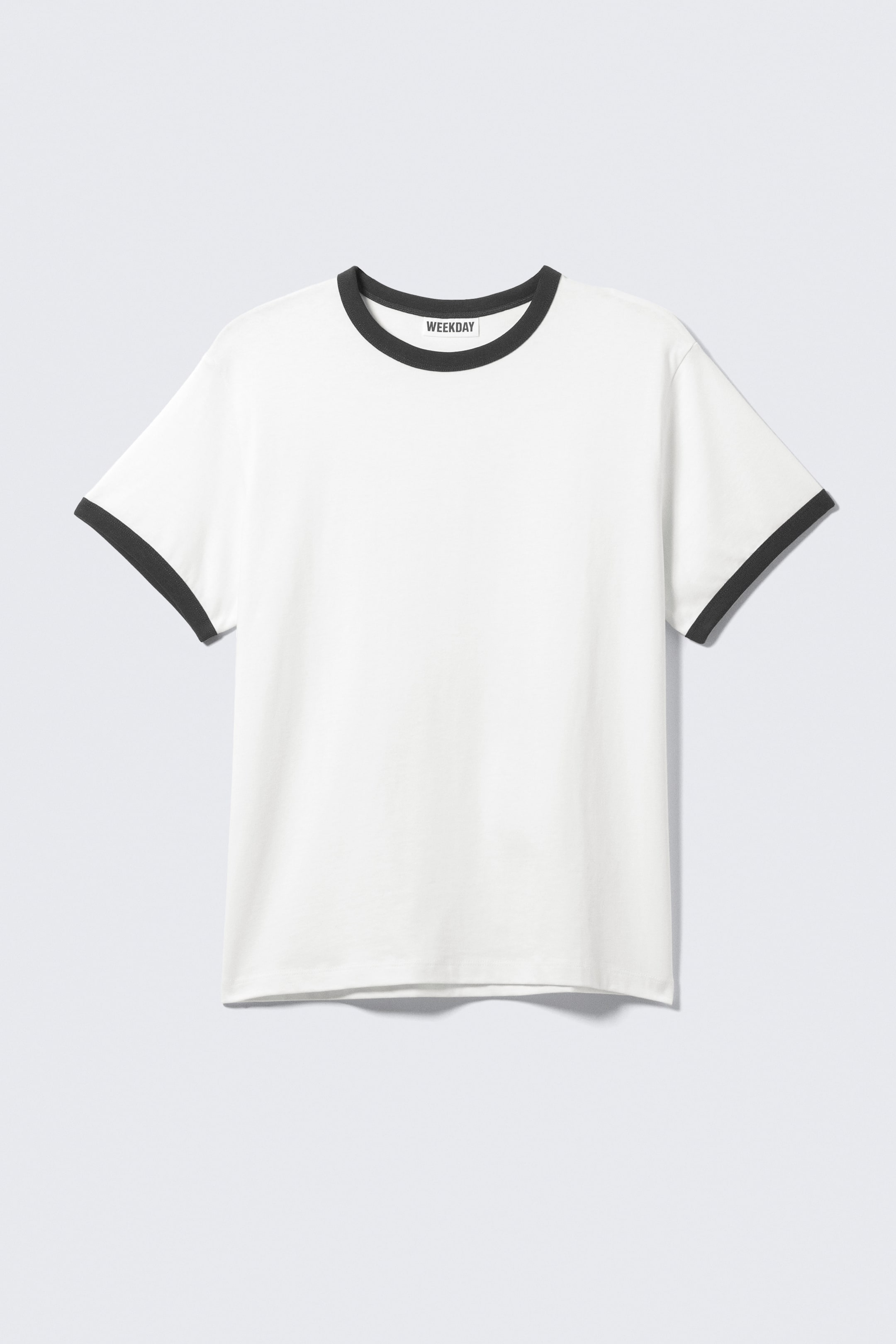 A short-sleeved ringer tee with contrast trims. Crafted from soft cotton jersey, it features a ribbed crewneck, matching sleeve edges, and a clean twin-needle hem. A minimal essential with a subtle retro feel.