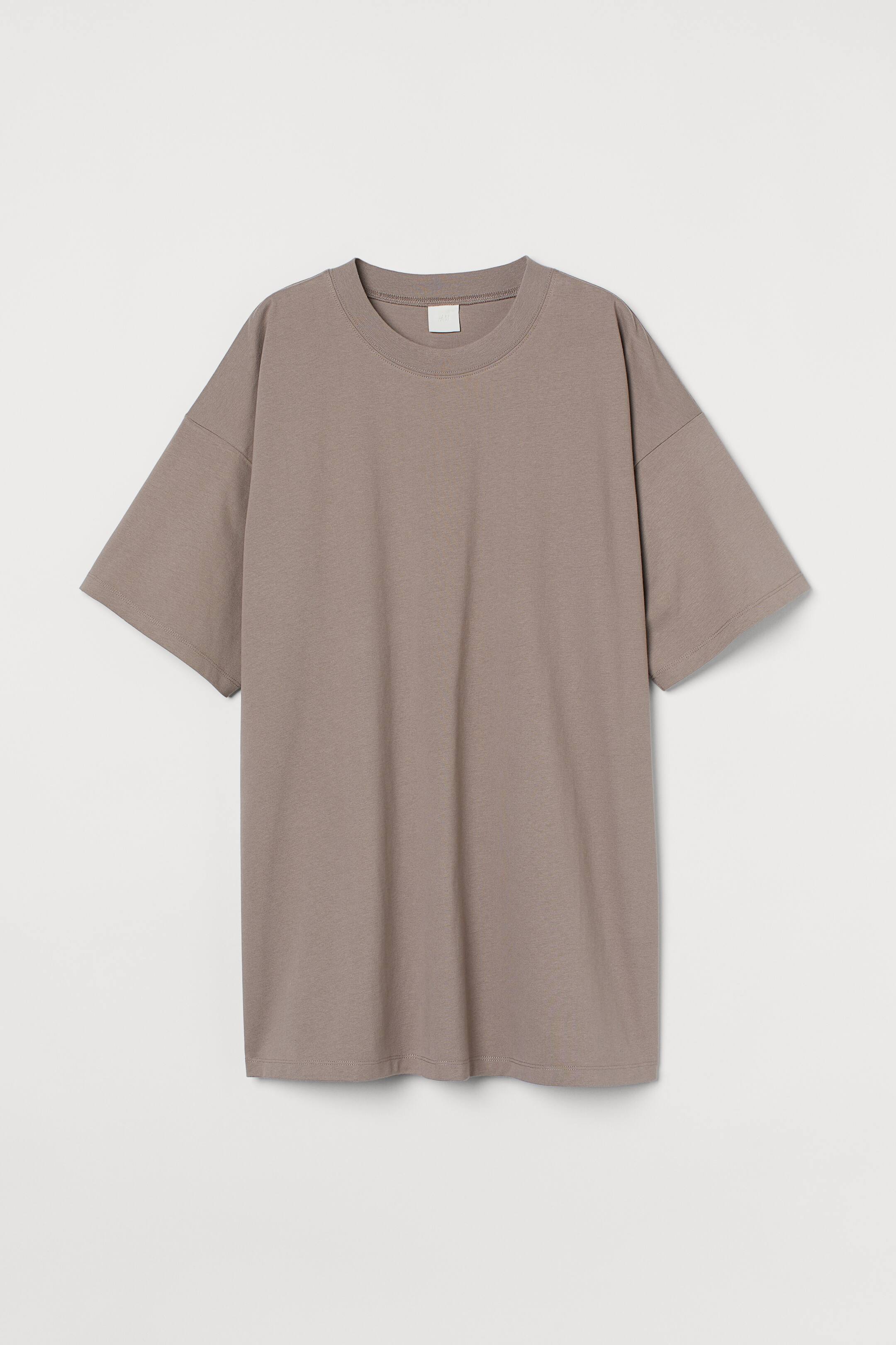 T-shirt lunga e oversize in morbido jersey di cotone. Bordo a costine lungo lo scollo. Spalle basse.