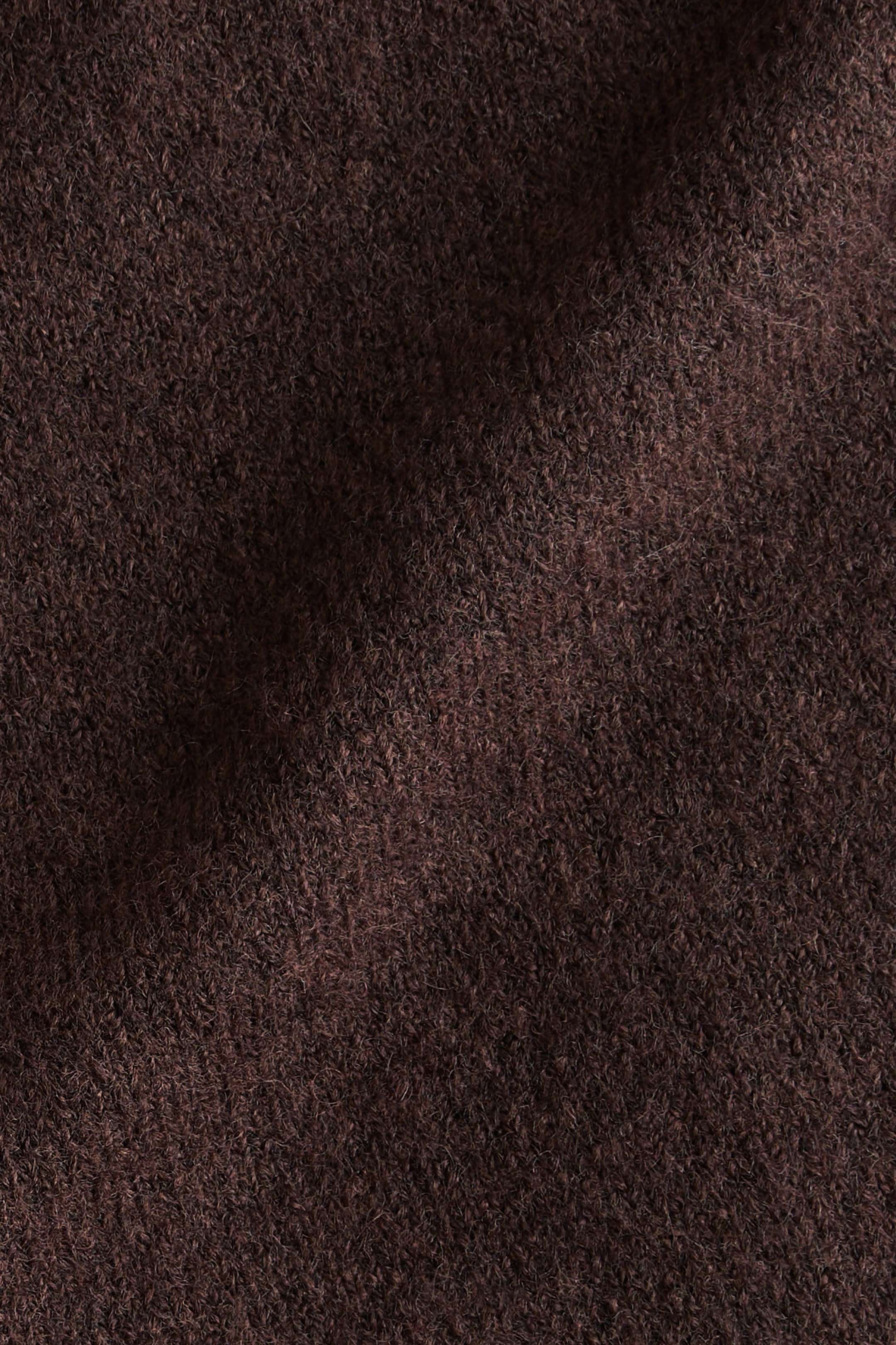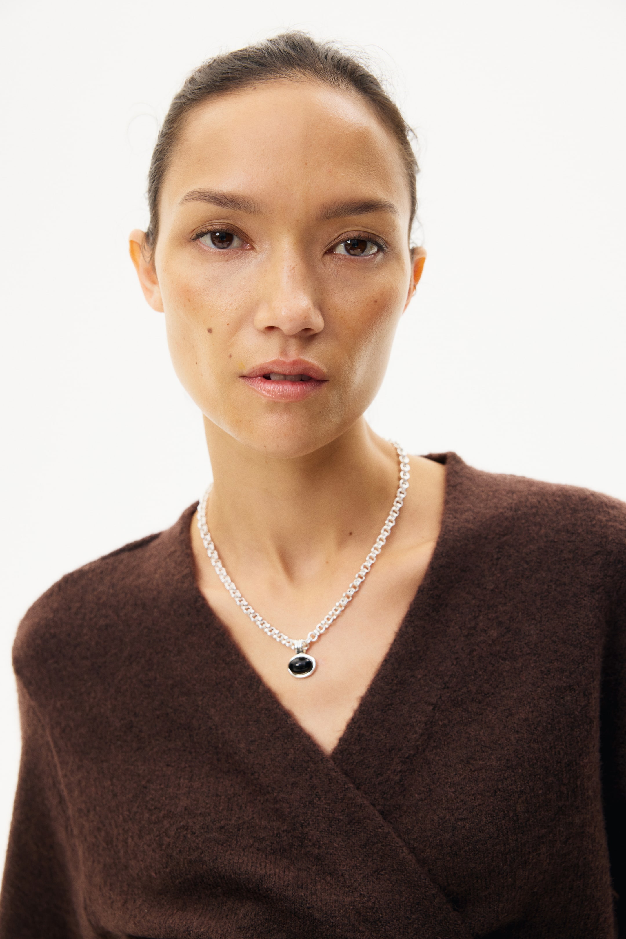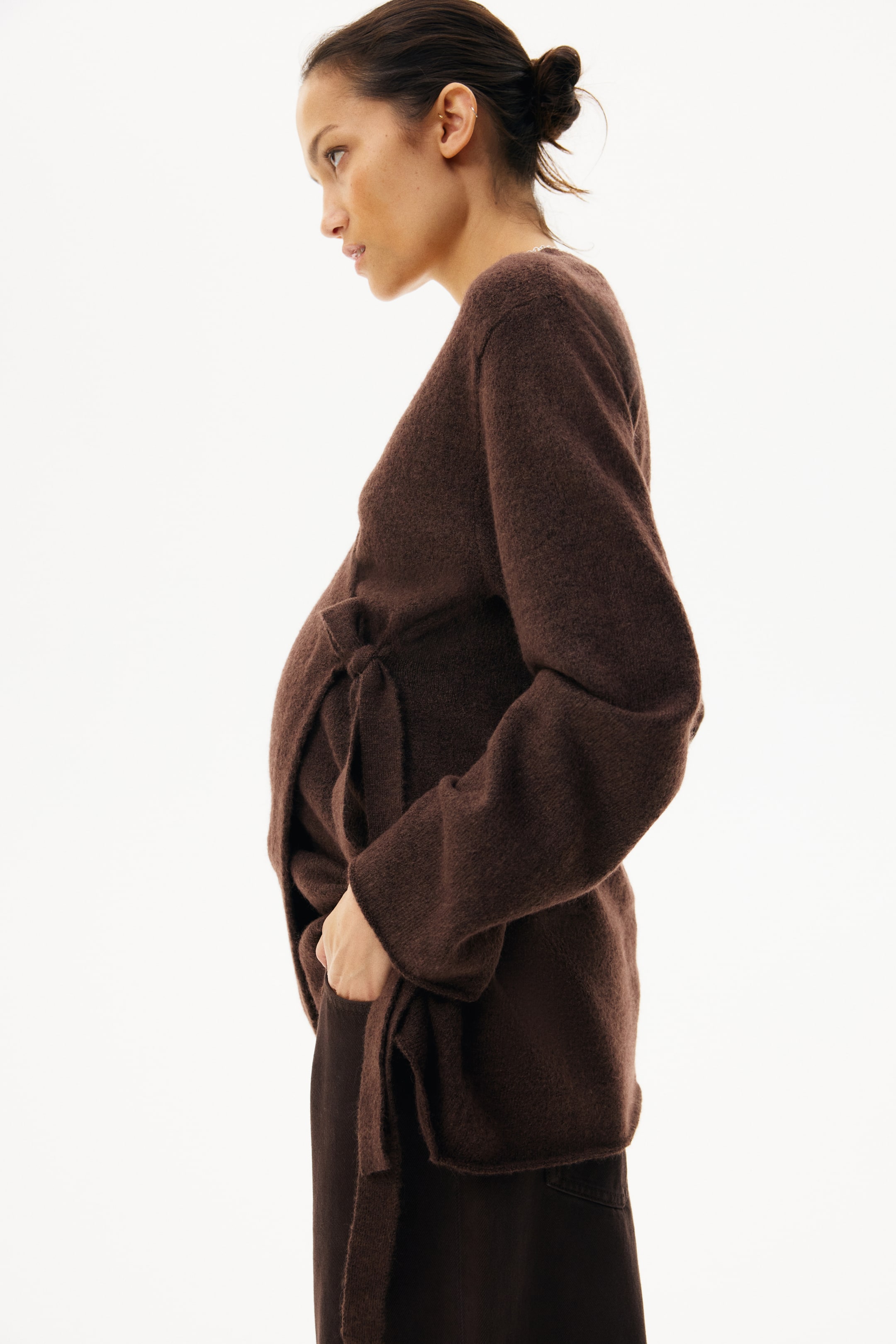 Cardigan in morbida maglia con lana. Incrocio davanti con nastri a vista da annodare su un lato. Laccetti da annodare sull’altro lato. Spalle basse, maniche lunghe e bordo a coste a fondo manica e in basso. Utilizzabile durante la gravidanza e nel periodo successivo.