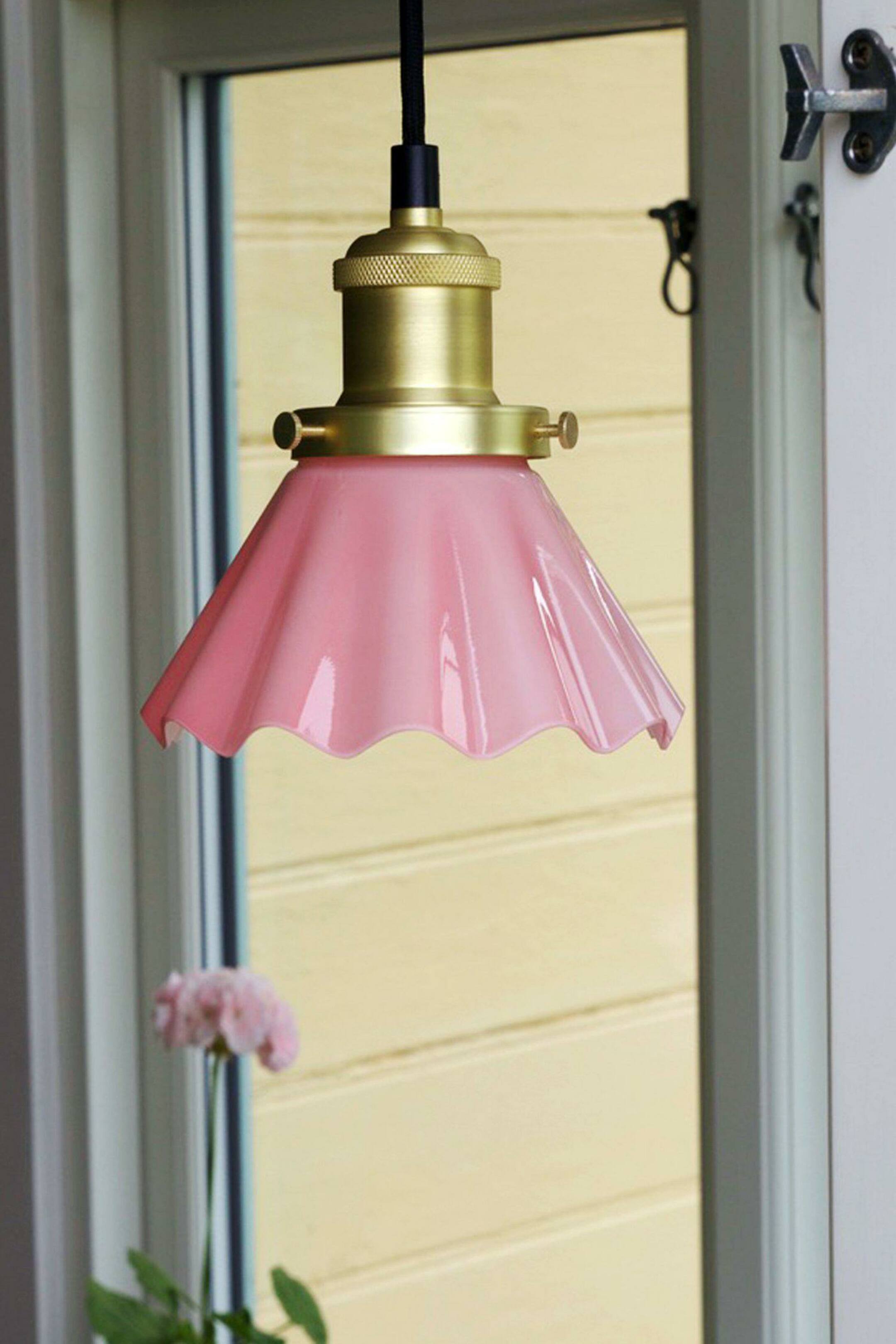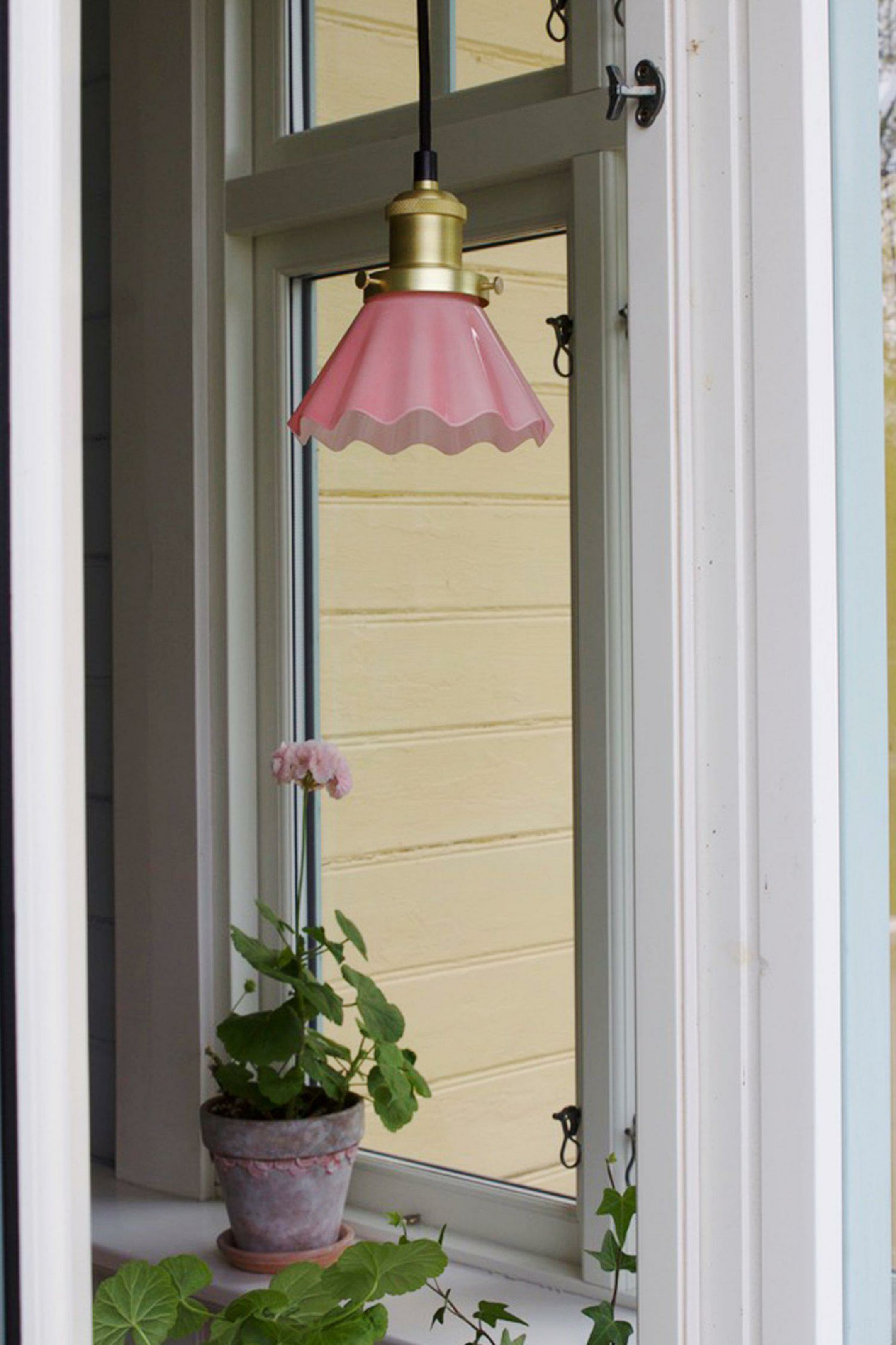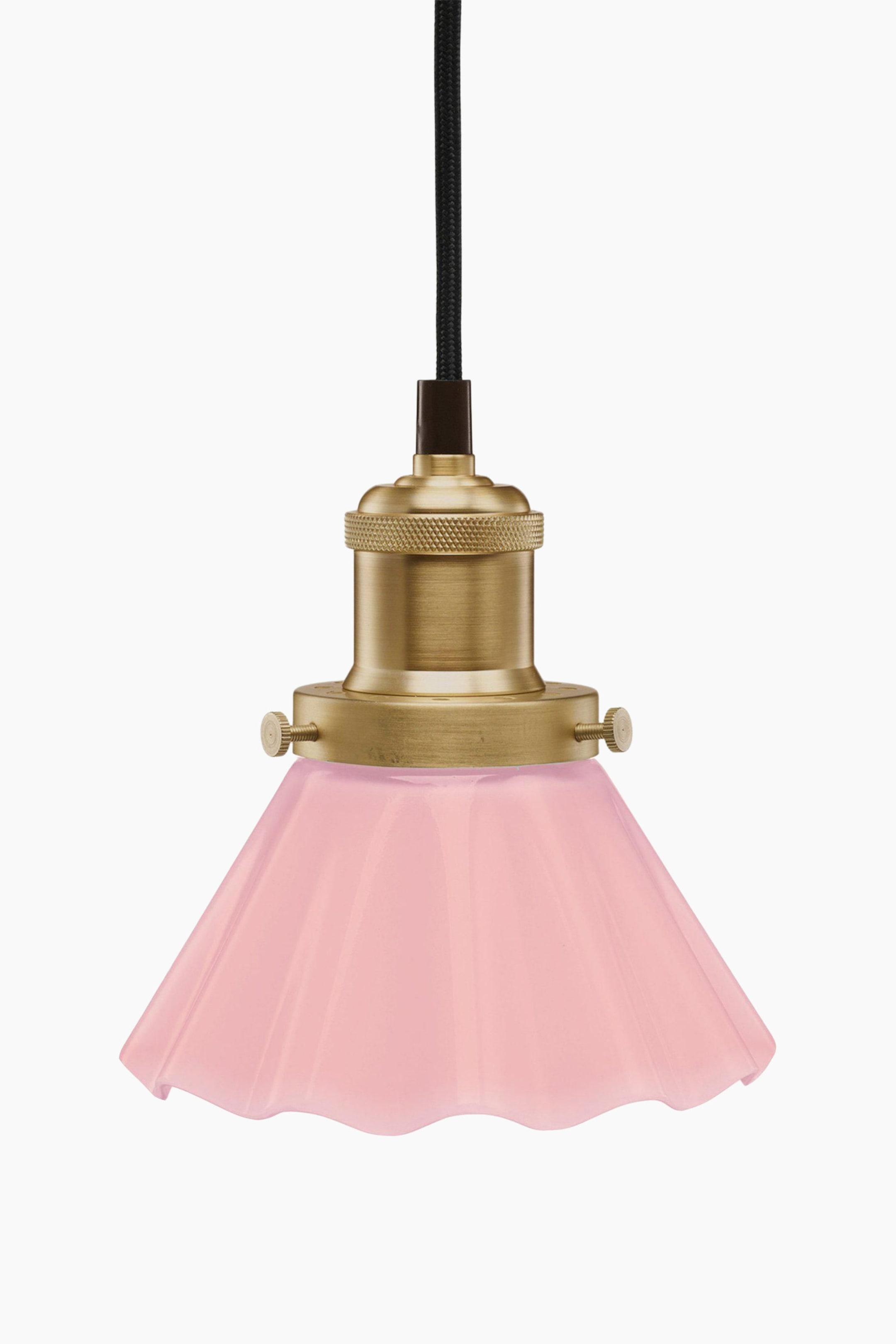 Ciondolo piccolo August. Una tradizionale lampada da calzolaio con paralume smerlato di colore rosa e cupola metallica con finitura in ottone. Adatta per spazi più piccoli come il piano della cucina o una finestra. La lampada ha un cavo tessile nero lungo 3 metri con interruttore e spina da muro europea. Portalampada E27, max 25W. Doppio isolamento e classe IP20. Altezza 16 cm, diametro 15 cm. La sorgente luminosa E27 è acquistata separatamente.