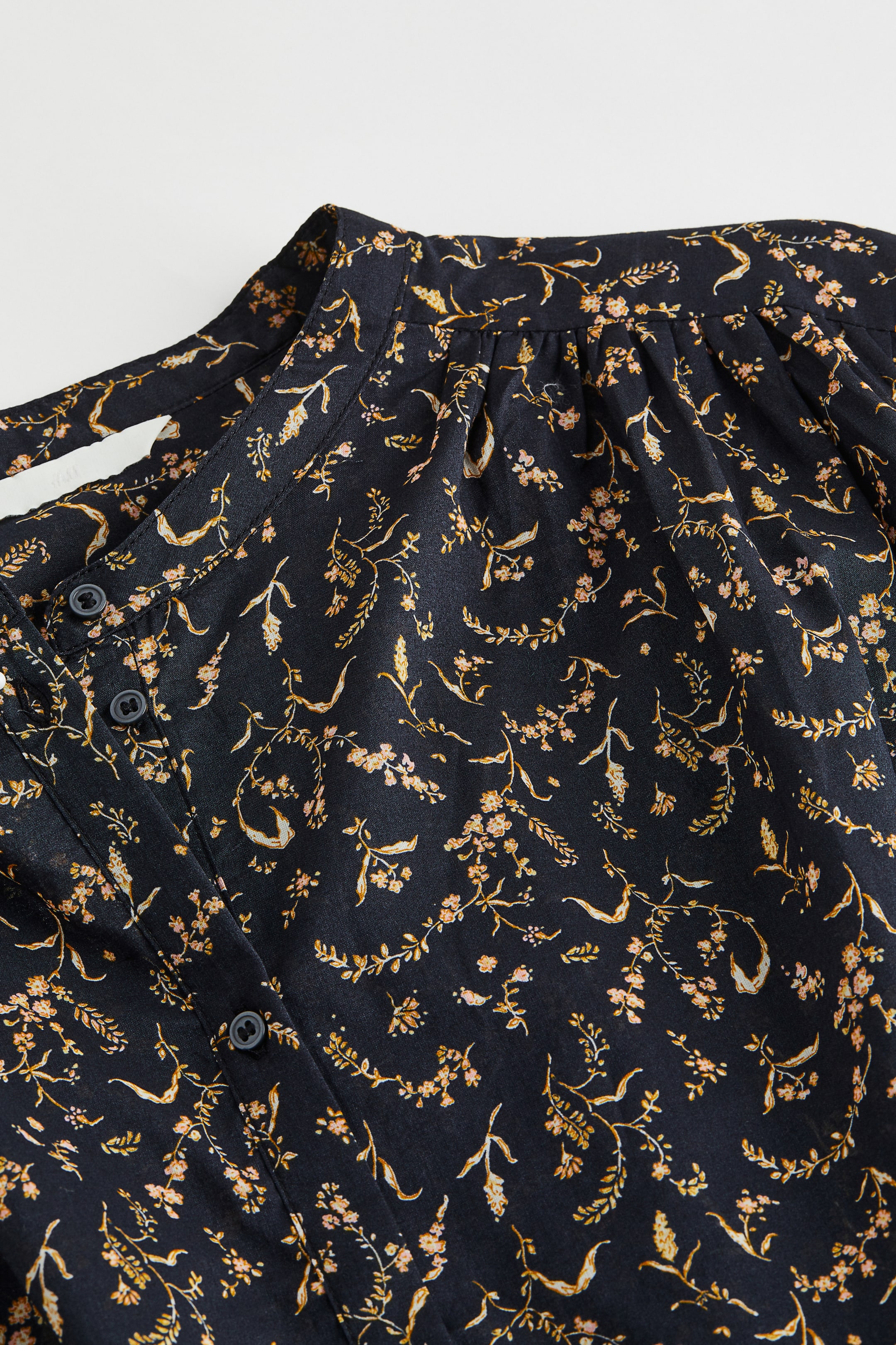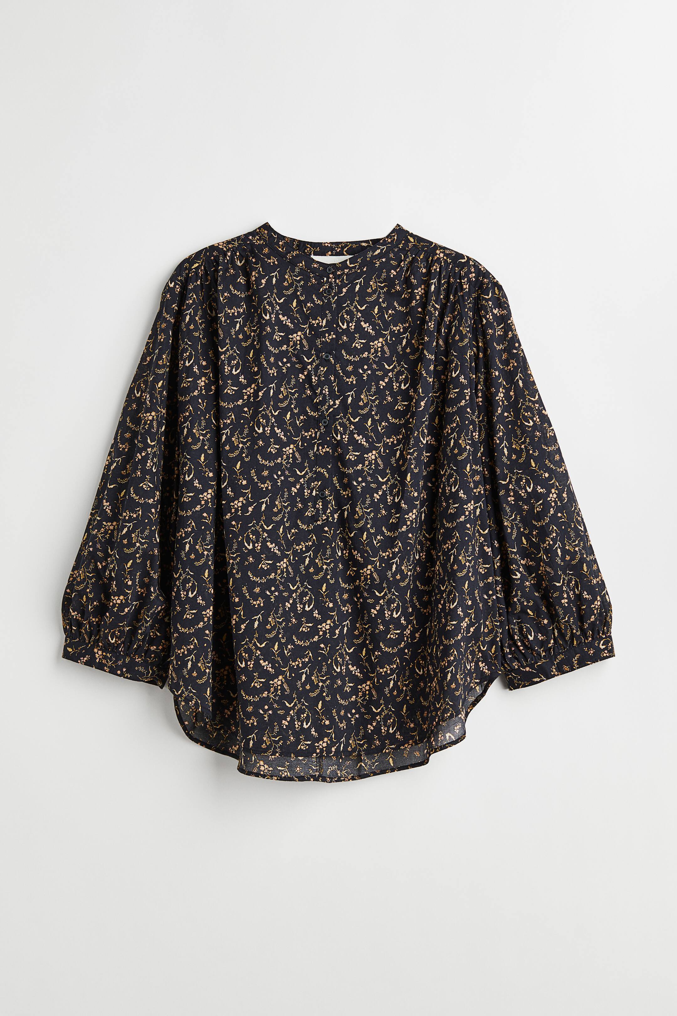 Camicetta in tessuto leggero di cotone con collo a lupetto e bottoni davanti. Carré con arricciature sulla schiena, spalle ribassate. Maniche lunghe e ampie con polsino basso.