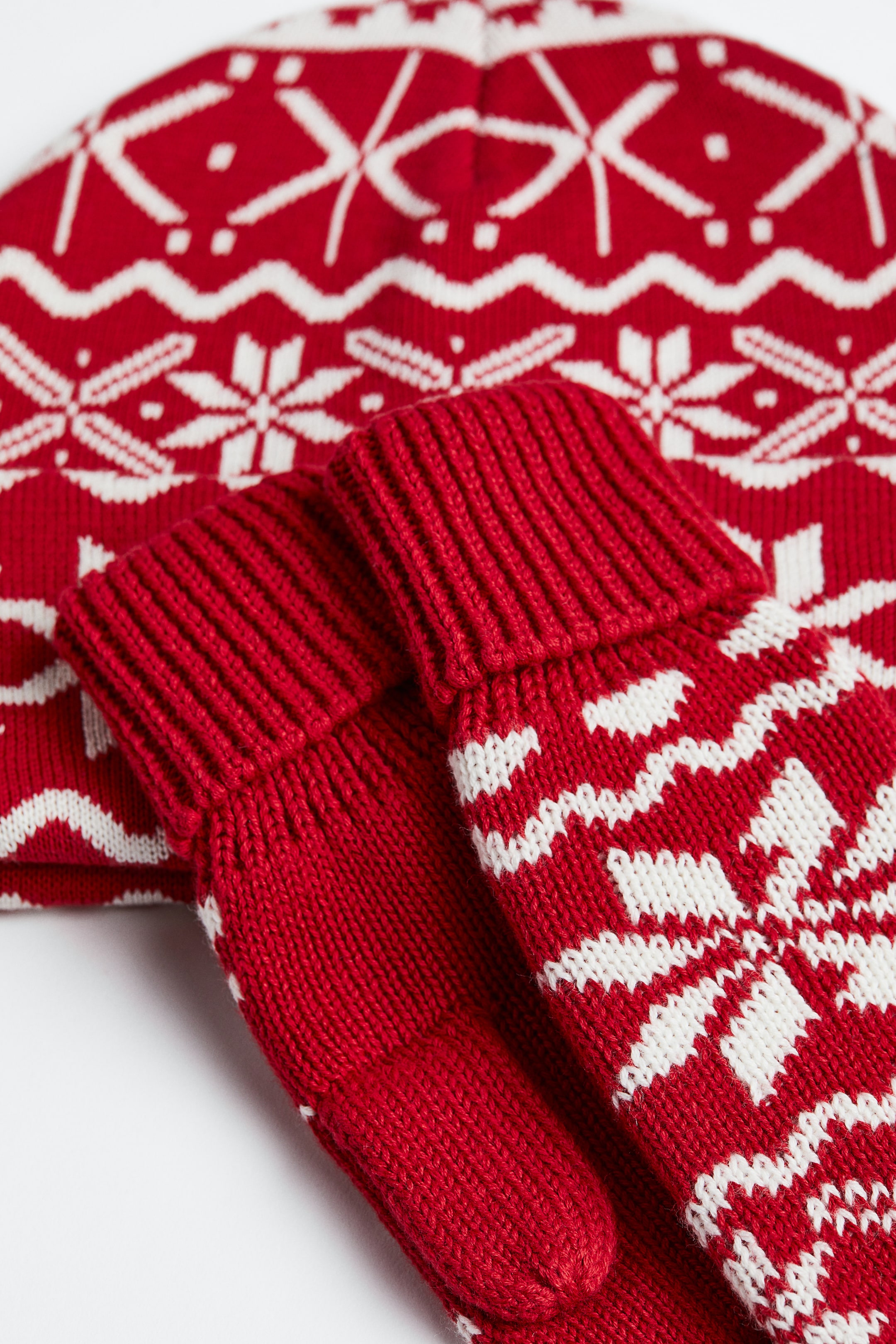 Set composto da berretto e moffole in maglia jacquard. Berretto con risvolto in basso. Moffole con polsino risvoltabile a coste.