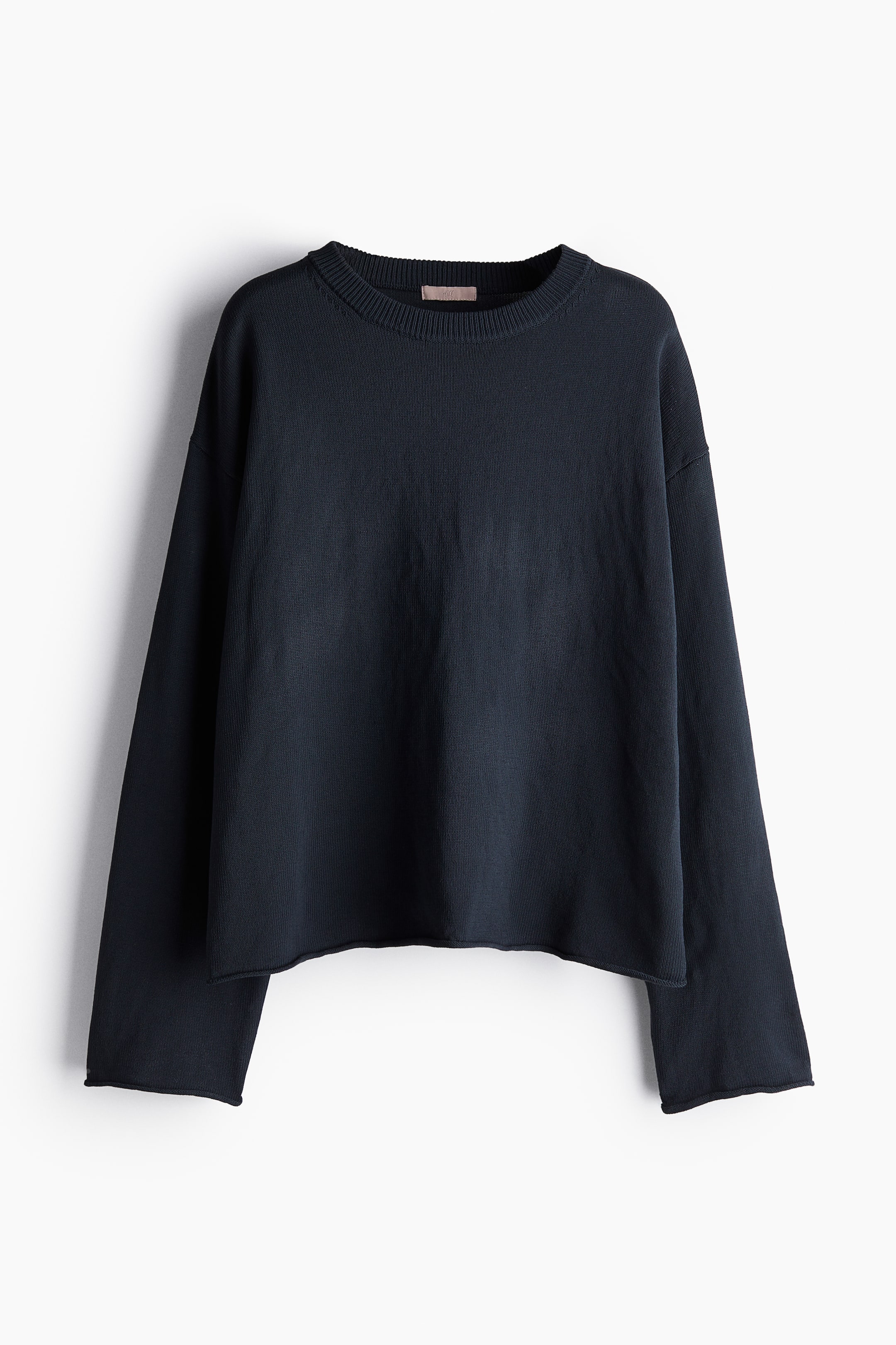 Pullover dalla linea ampia in morbida maglia. Scollo rotondo con bordo a coste, spalle bassissime e maniche lunghe. Bordi arrotolati a fondo manica e in basso.