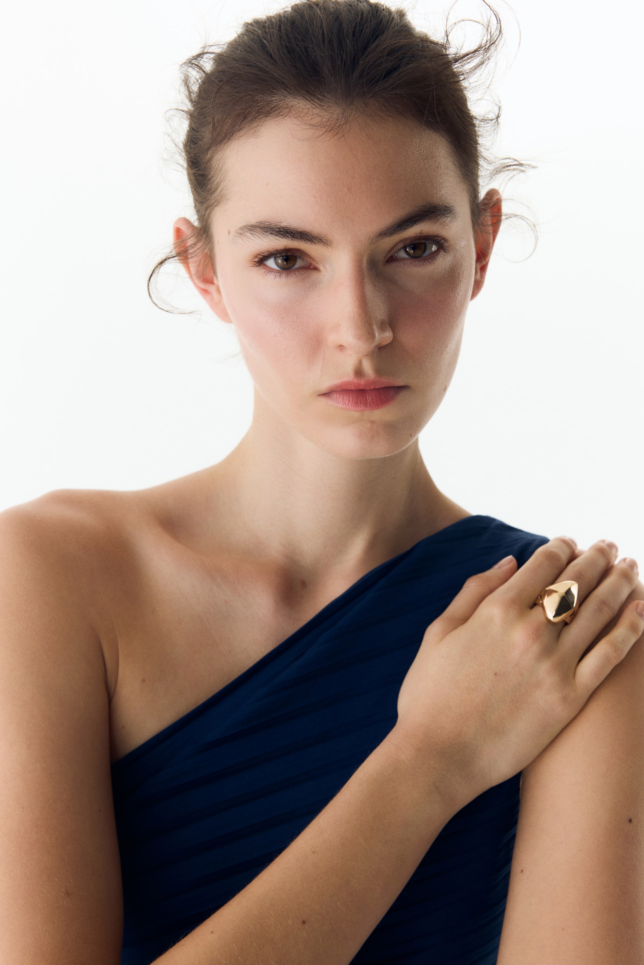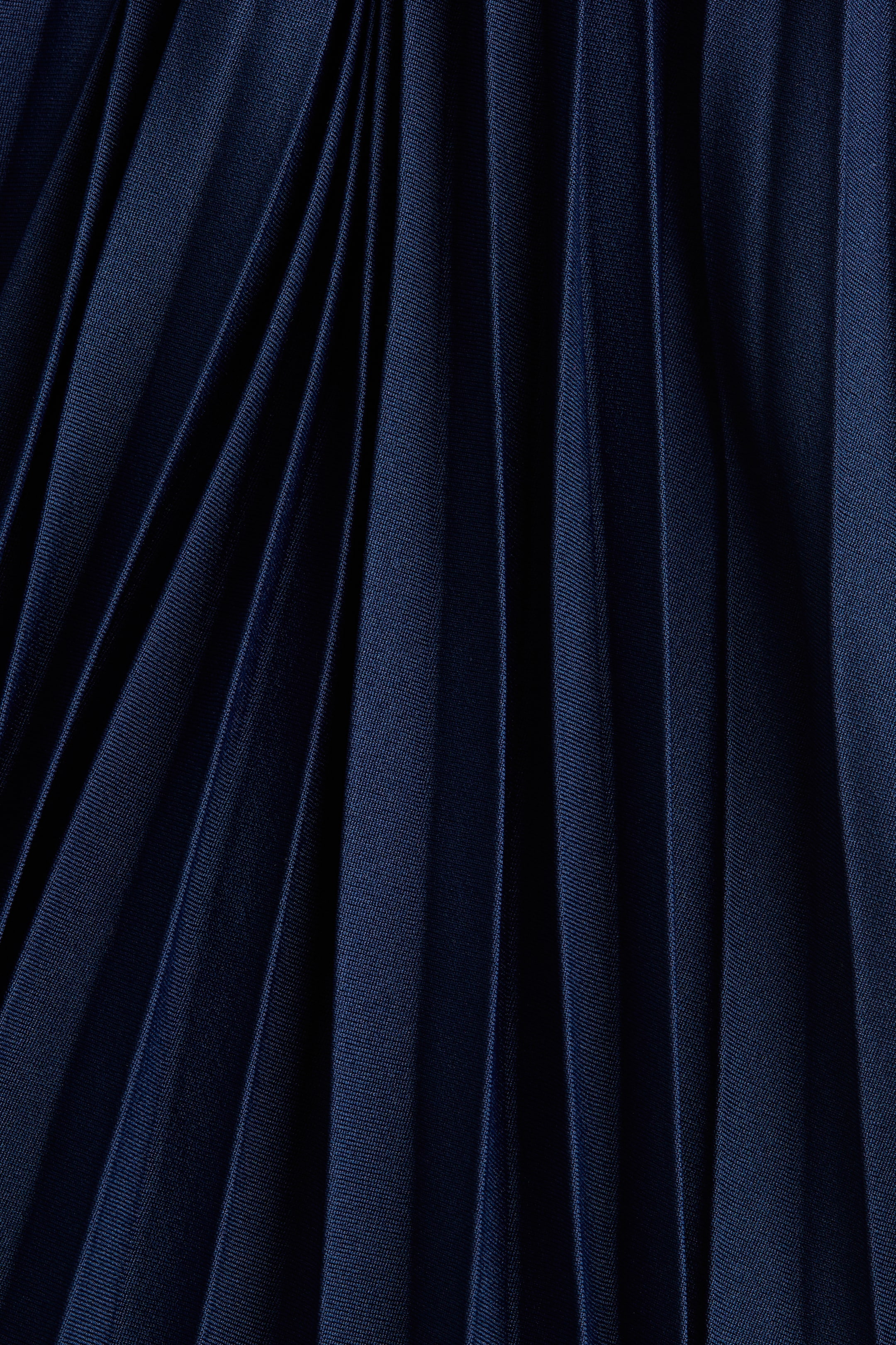Abito monospalla in jersey trasparente plissettato, lunghezza al polpaccio. Scollo asimmetrico, una spallina ampia. Corpetto aderente con cerniera nascosta su un lato, gonna svasata con bordo tagliato a vivo in basso. Parzialmente foderato.