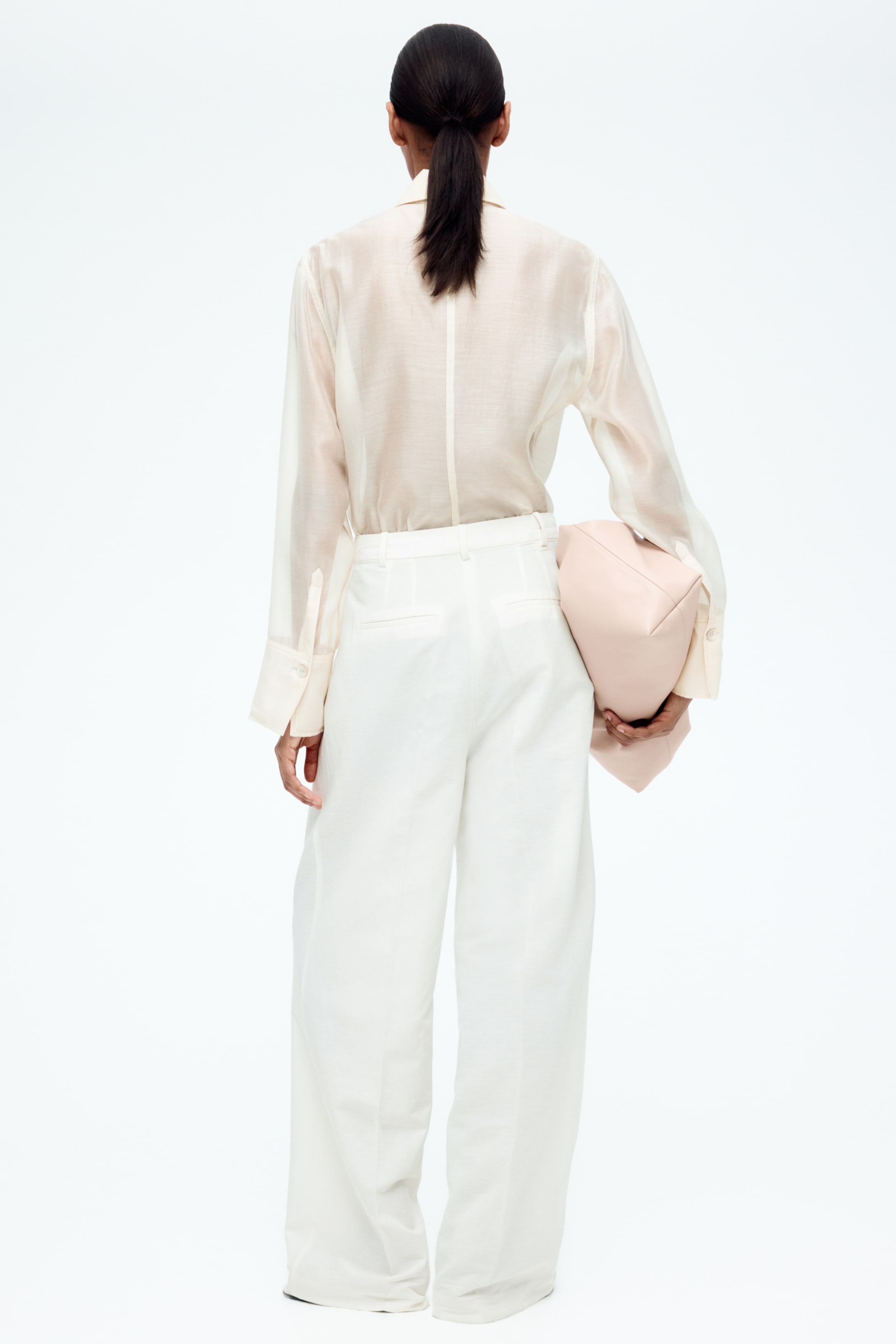 Pantaloni sartoriali dalla linea ampia in tessuto di misto lino. Vita alta, patta con cerniera e chiusura con bottone e gancetto nascosti. Tasche laterali oblique, finte tasche a filetto dietro e gamba ampia con pinces davanti e pieghe davanti e dietro.
