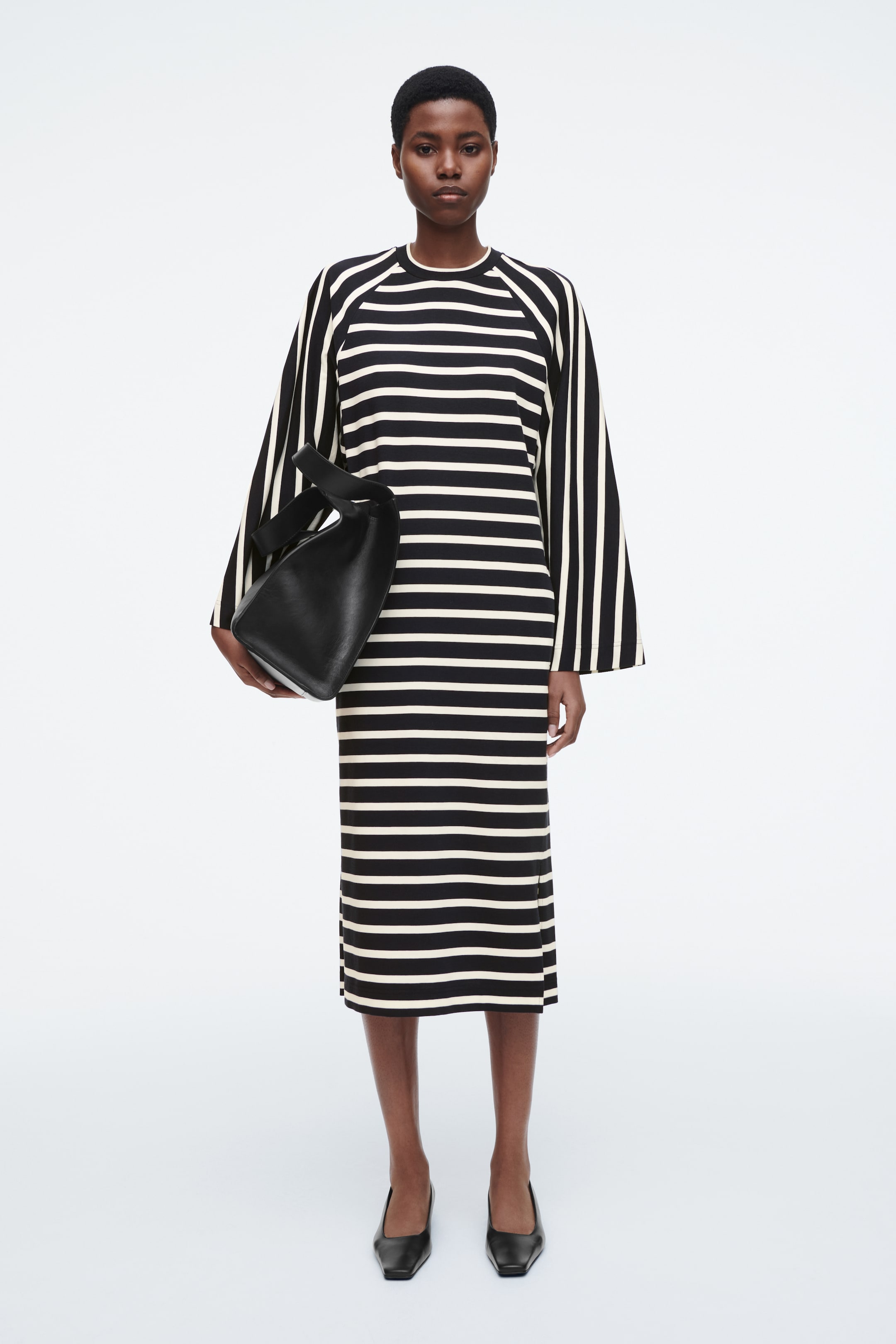 Questo abito a colonna dal design essenziale si adatta a qualsiasi occasione, a seconda degli accessori scelti. Realizzato in morbido jersey di cotone, il modello presenta un girocollo a coste, tasche laterali e maniche lunghe a pipistrello che aggiungono un tocco di volume. Indossalo con classiche ballerine. Vestibilità regolare Lunghezza midi, orlo con spacco Esterno: 100% cotone. Escluse le finiture / Lavaggio in lavatrice La lunghezza sul retro nella taglia S è di 112 cm / La modella indossa la taglia S