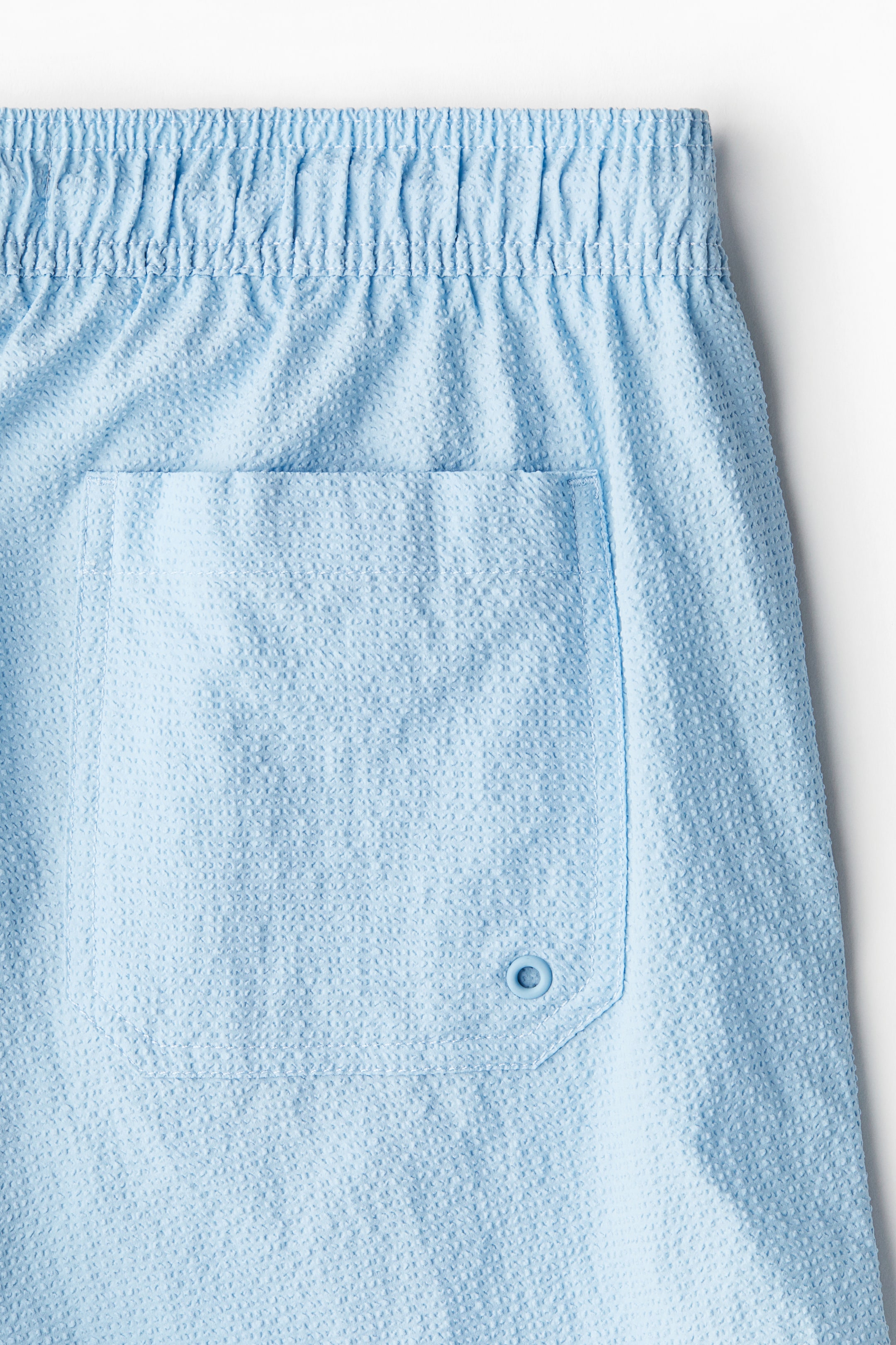 Shorts da bagno in seersucker con elastico e coulisse in vita. Tasche laterali e una tasca dietro con chiusura a strappo. Spacchetti ai lati. Pantaloncino interno in tessuto a rete.
