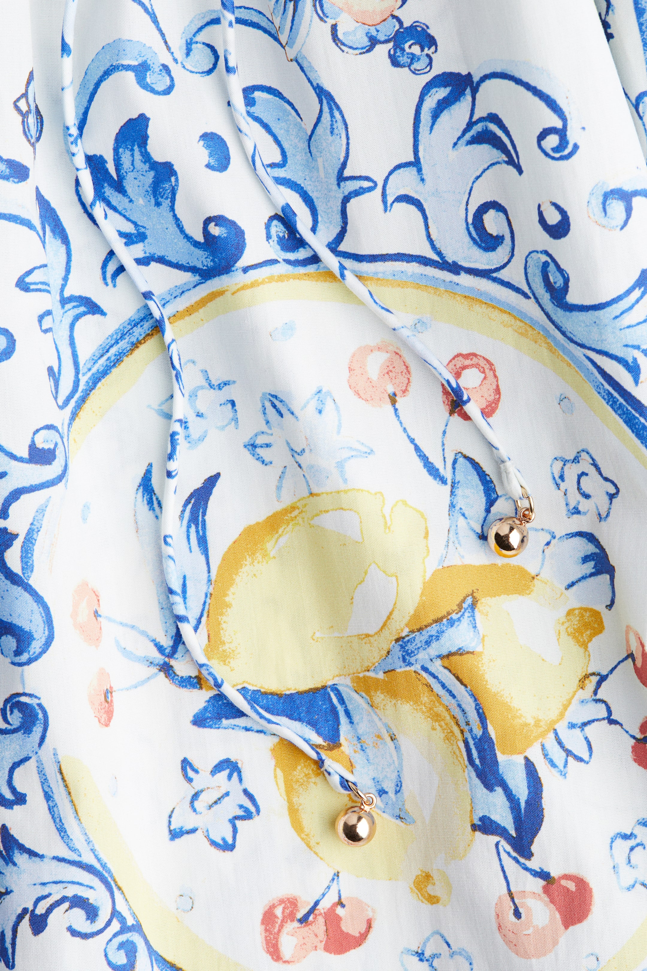 Abito in tessuto di cotone, lunghezza al polpaccio. Spalline sottilissime e regolabili, corpetto aderente con laccetti sottili da incrociare e annodare sulla schiena. Elastico sottile in vita dietro, cucitura arricciata sul davanti per un effetto drappeggiato. Corpetto foderato.